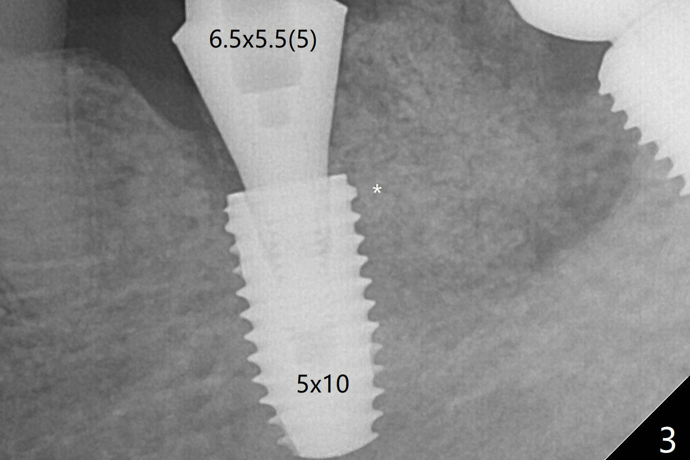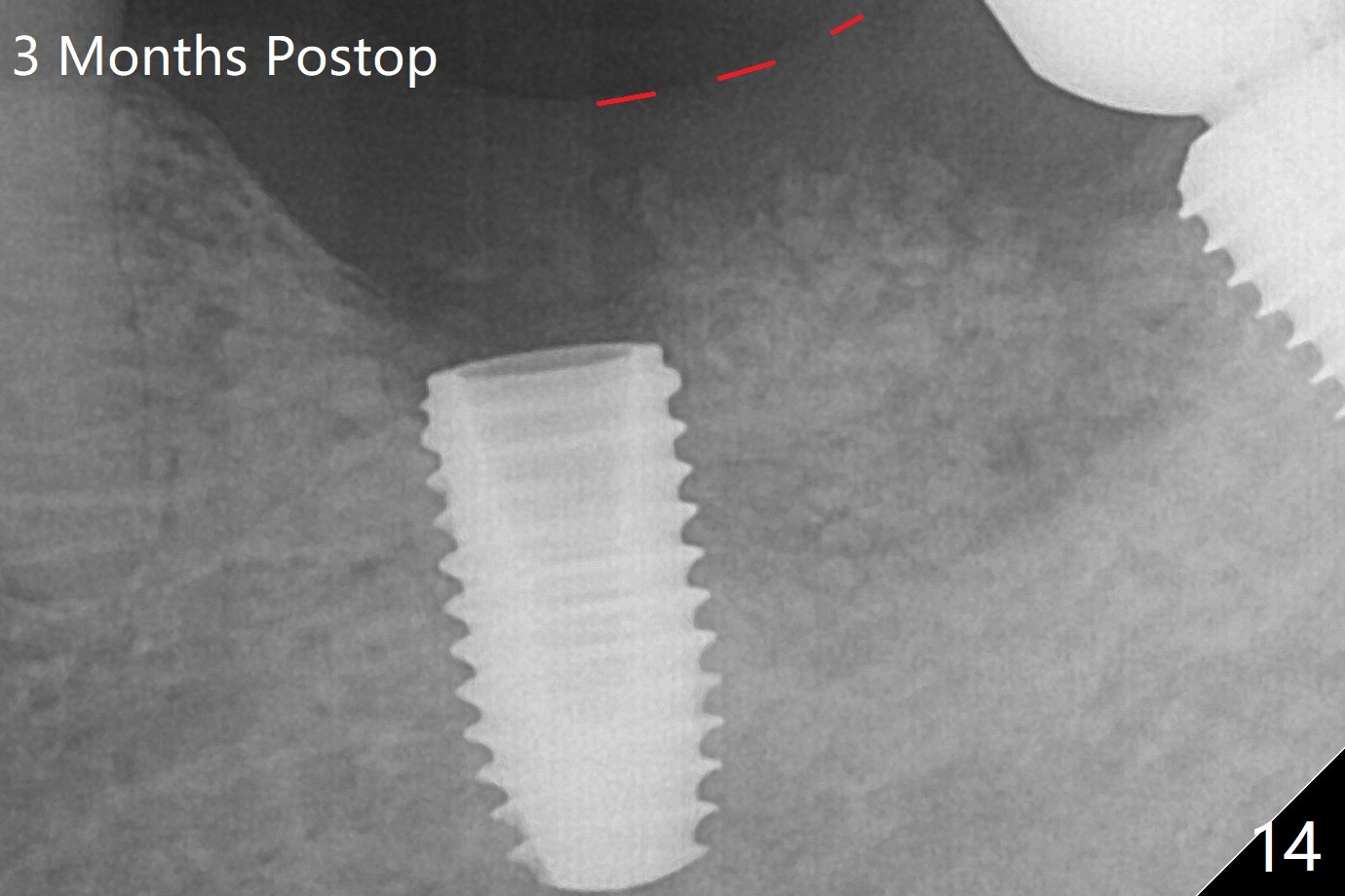 With 6 mm clearance, block anesthesia is administered. A 5x10 mm definitive implant is placed with ease (Fig.3). The buccal bony defect is repaired by allograft (*). The abutment has been dislodged for 2 week (Fig.14 (3 months postop). The bone graft, albeit decreased, is 2 mm subgingival (red dashed line).