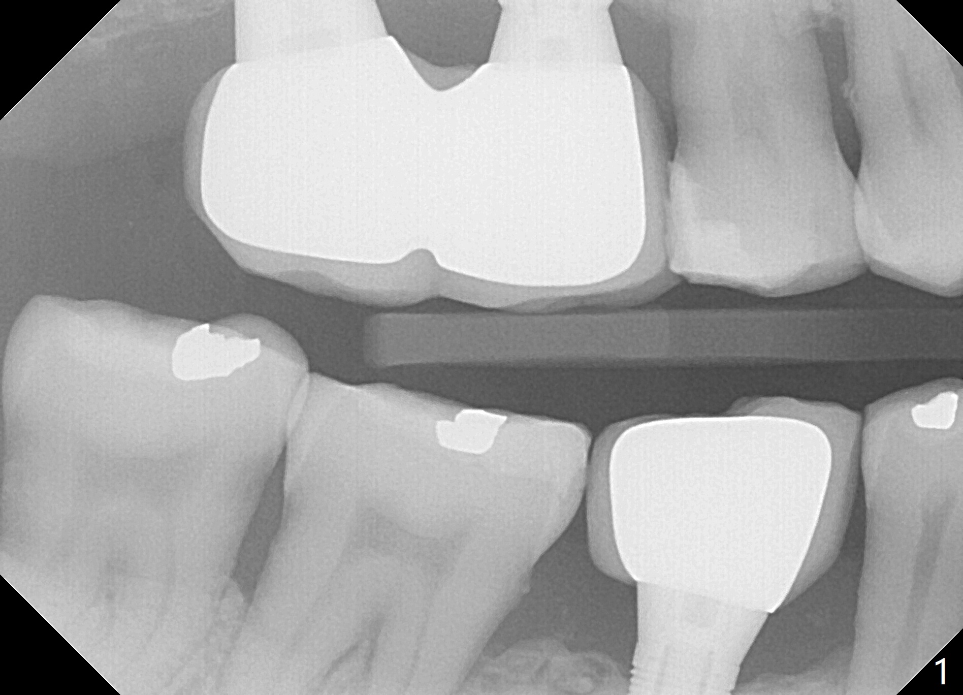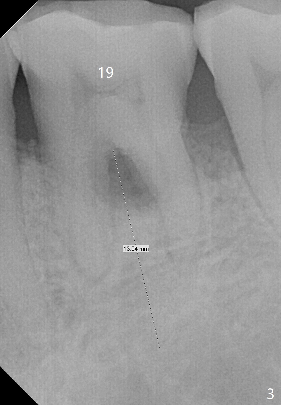 A 59-year-old man seems to have perio-endo disease at #19 (Fig.1-3). To improve implant/crown ratio, place IS implant at the crestal level (not too deep). To prevent periimplantitis (buccal plate postop resorption), place the implant lingually. Prepare surgical handpiece to initiate osteotomy or to flatten the septum.