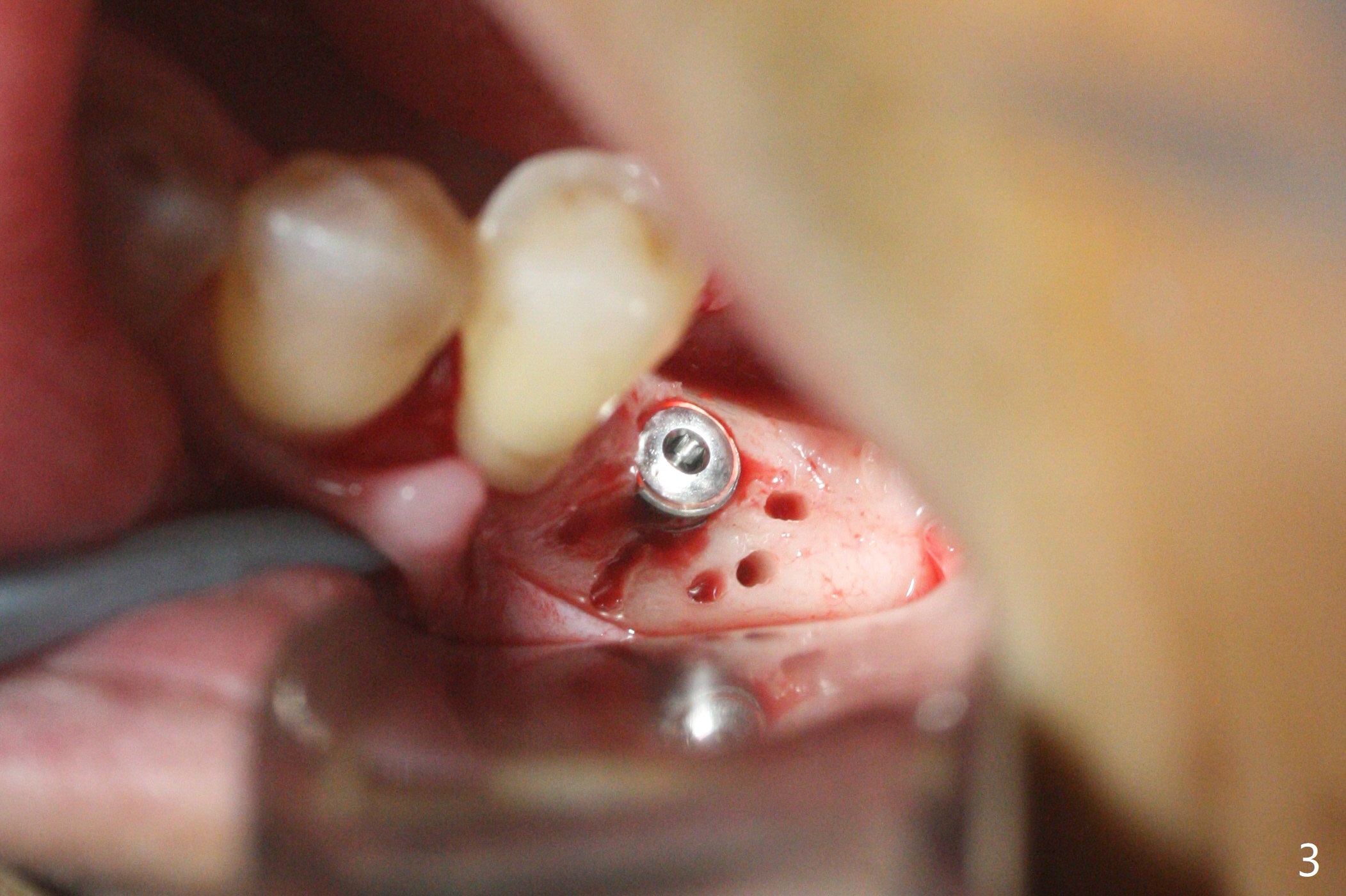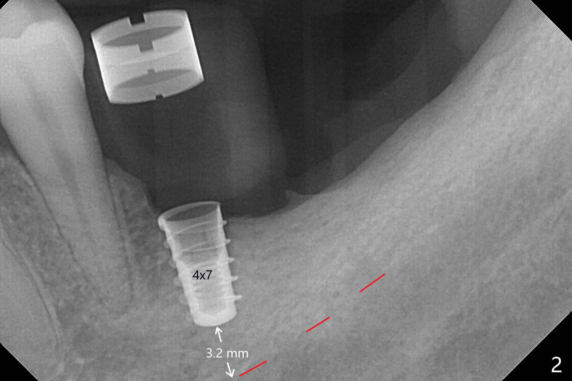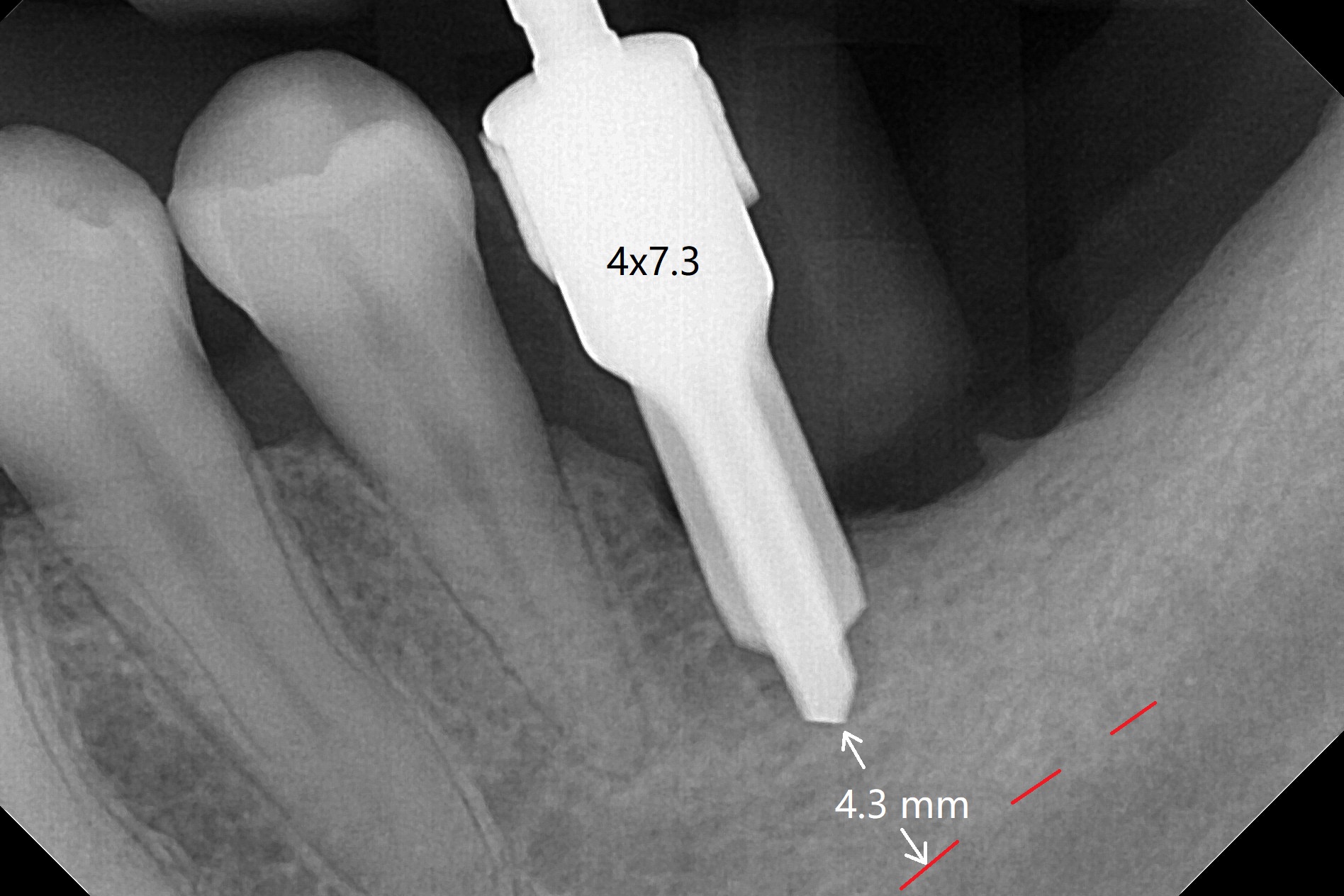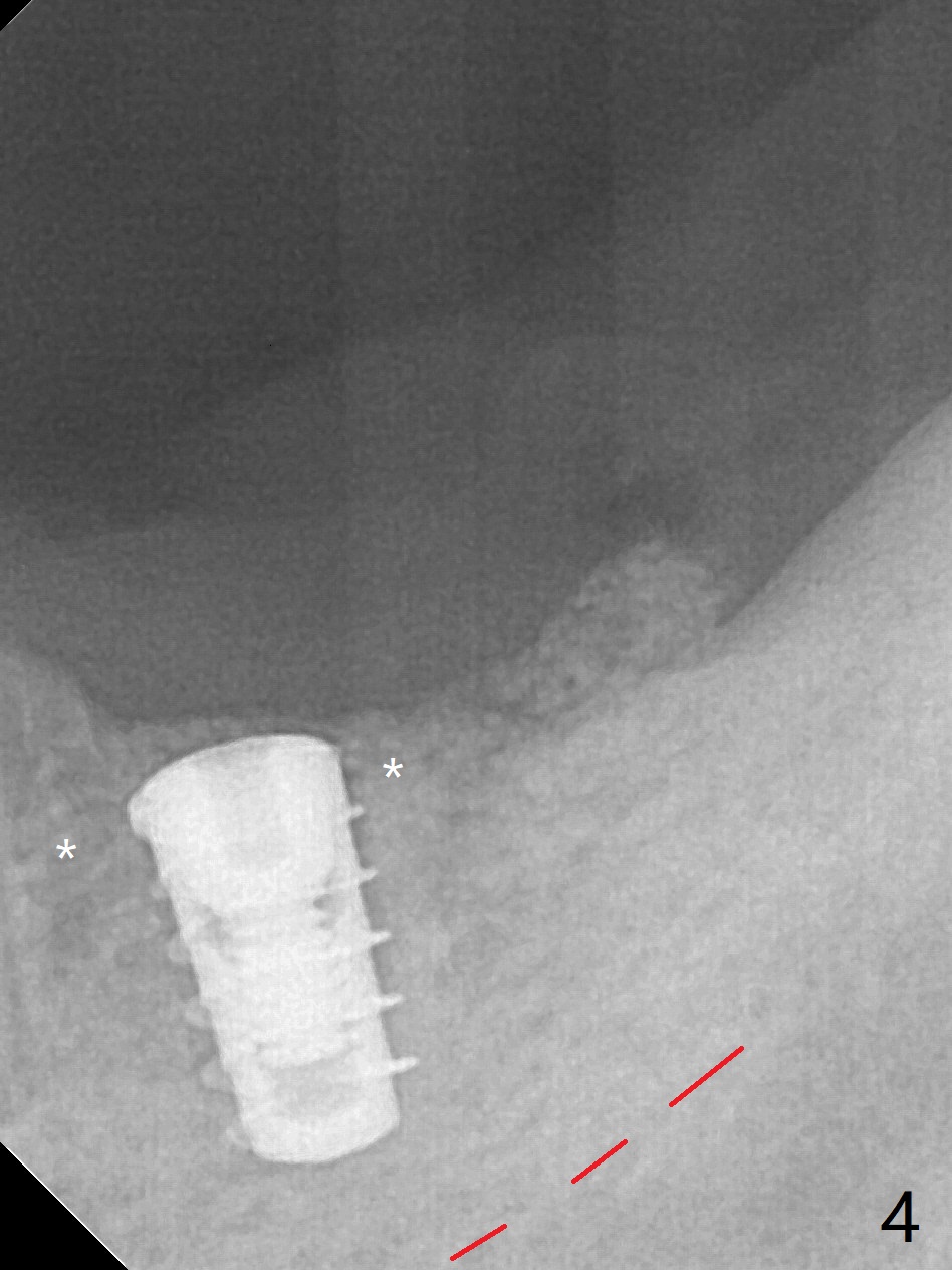 After use of 4x7.3 mm drill with guide, the buccal osteotomy height is 4 mm at #19, unsuitable for 4x5 mm Bicon implant, which requires 3 mm subcrestal placement. PA shows 4.3 mm bone from the Inferior Alveolar Canal (IAC, red dashed line (the superior border)). Following 4x8.5 mm drill, a 4x7 mm IBS implant is placed with distobuccal thread exposure and 3.2 mm clearance from IAC. With 3.5x10 mm drill less full length, the implant is placed a little deeper (10 Ncm). Bleeding spots created (Fig.3), sticky bone (cortical, fine granule) is placed (Fig.4 *), which is covered with PRF membrane and Colla tape. 4-0 PGA is used. There is no postop paresthesia. The length discrepancy is probably due to distal free end guide, which produces mesial placement of the implant. Try to make a premolar-sized crown. Use profile drill in uncover.