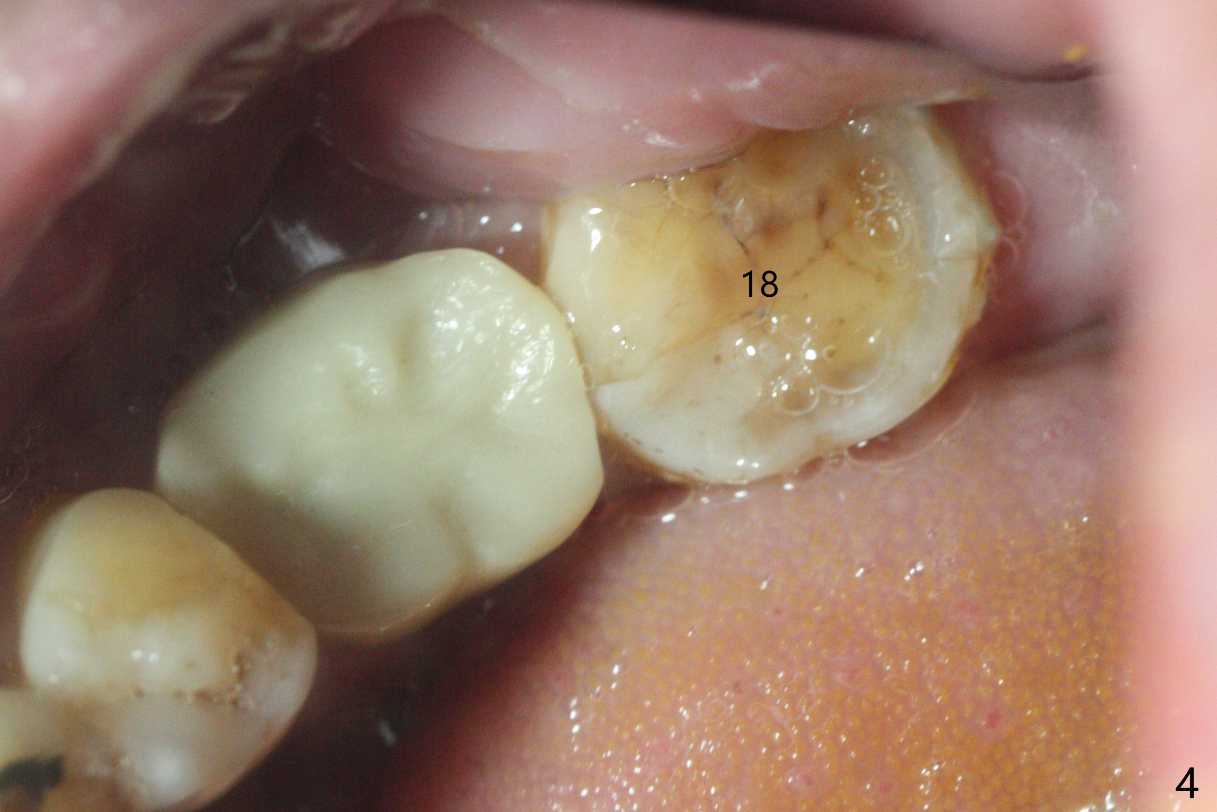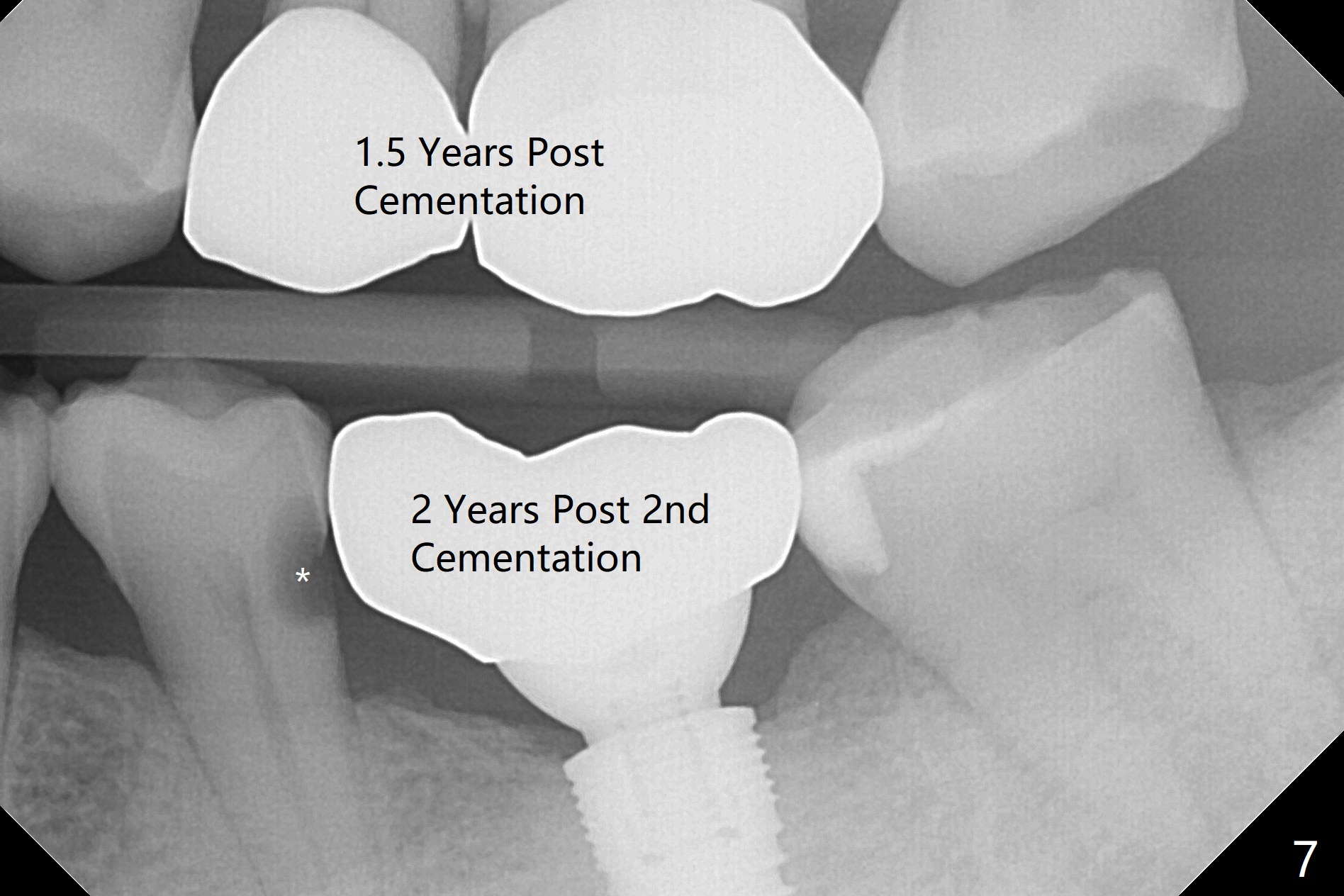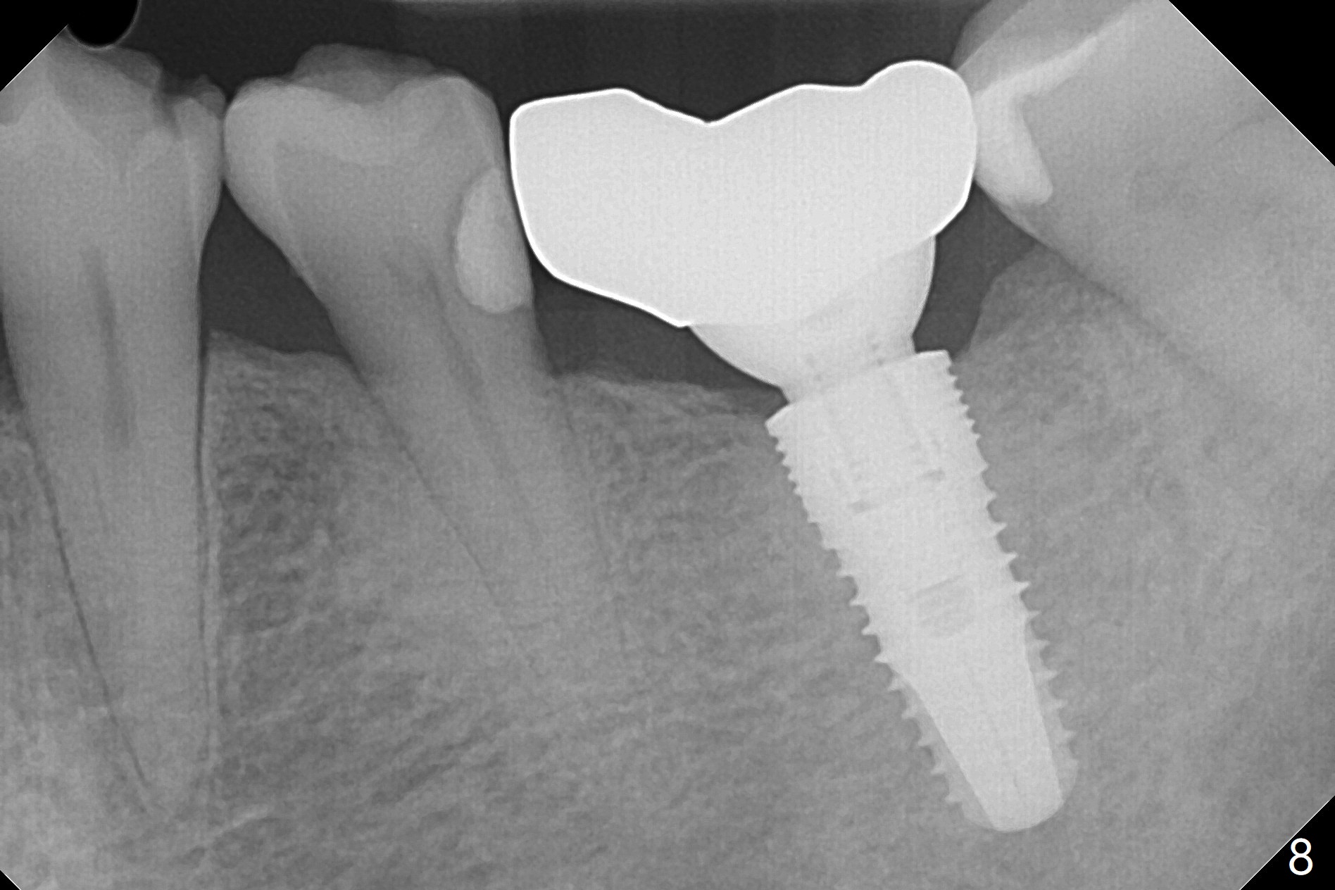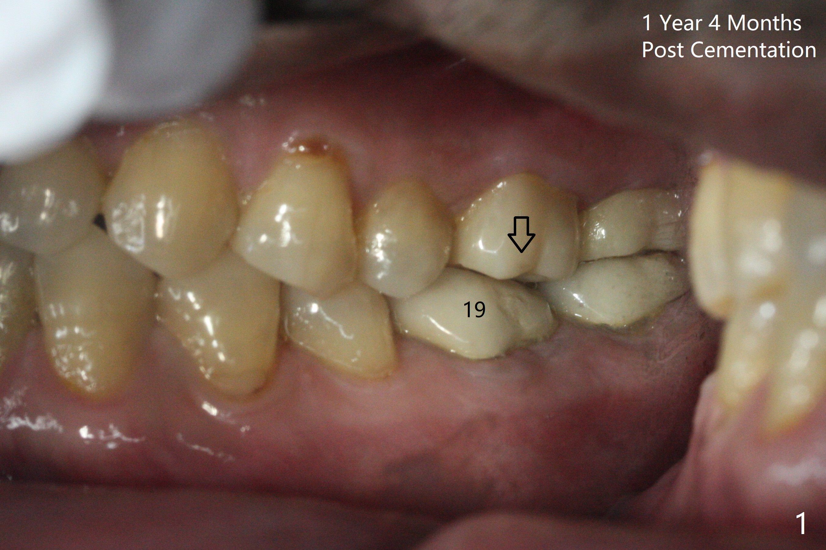 In fact the tooth #14 appears to have been intruded 2 months post-treatment. The composite dislodges 3 months later. A new crown with screw retained is fabricated, but the patient cannot masticate well on the left. DO caries of the tooth #20 is found (Fig.7) and restored (Fig.8). As a matter of the fact, the food impaction is reported between #18 and 19! What can we do now?
