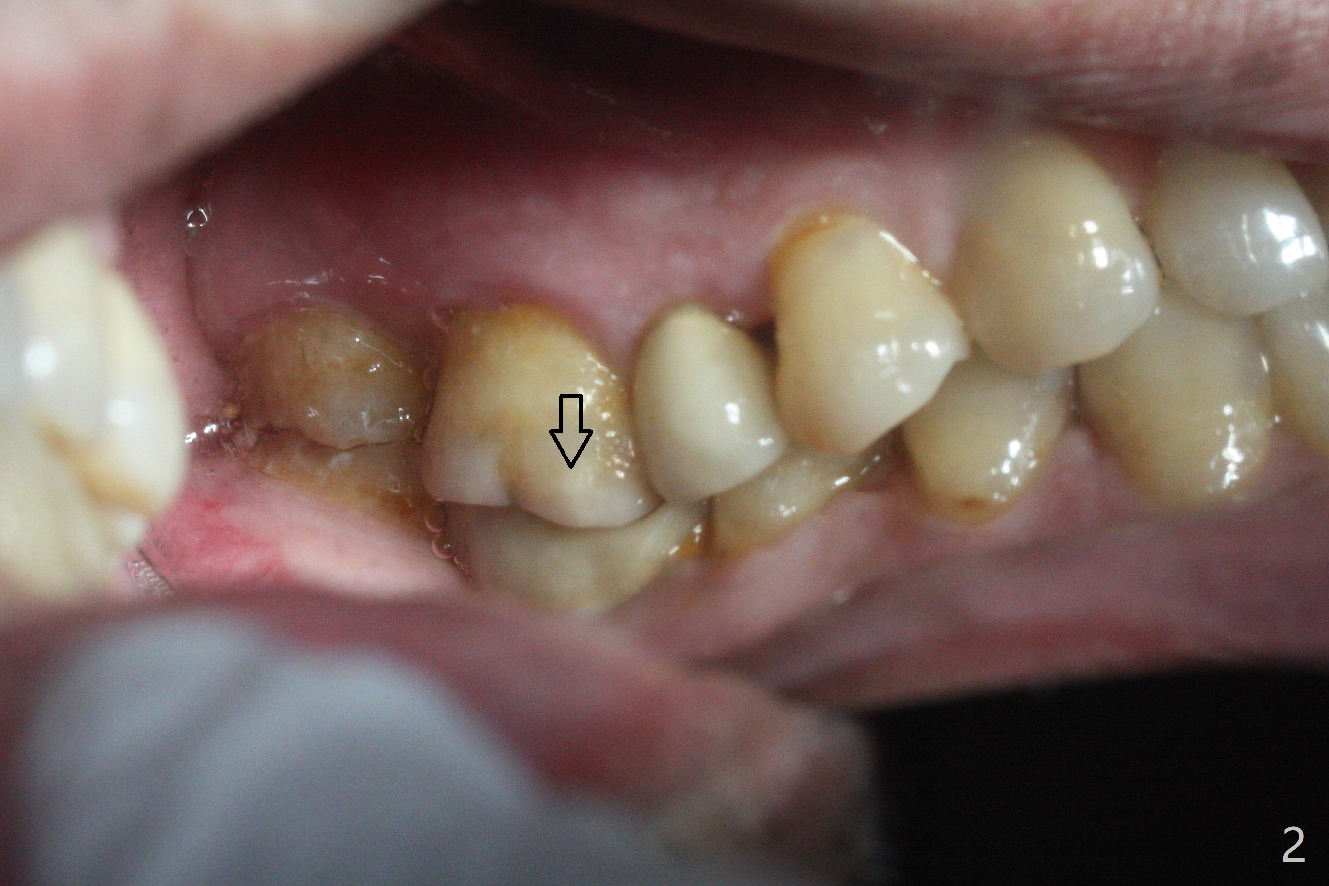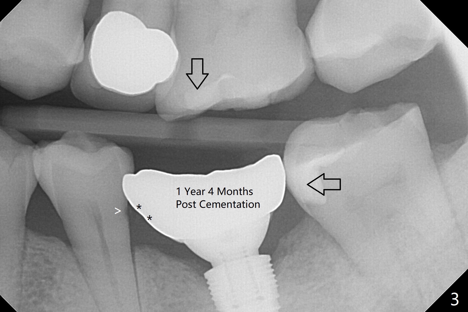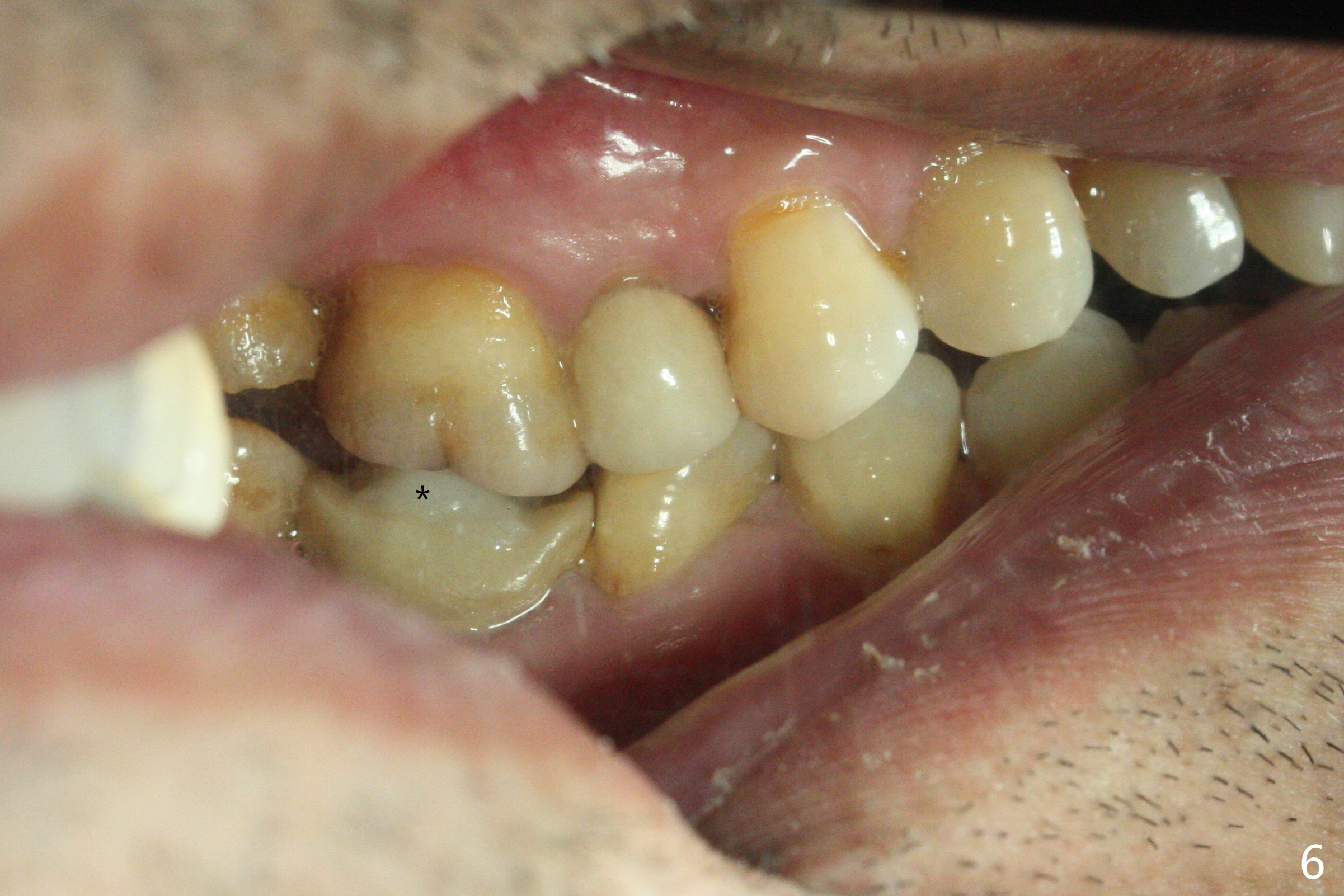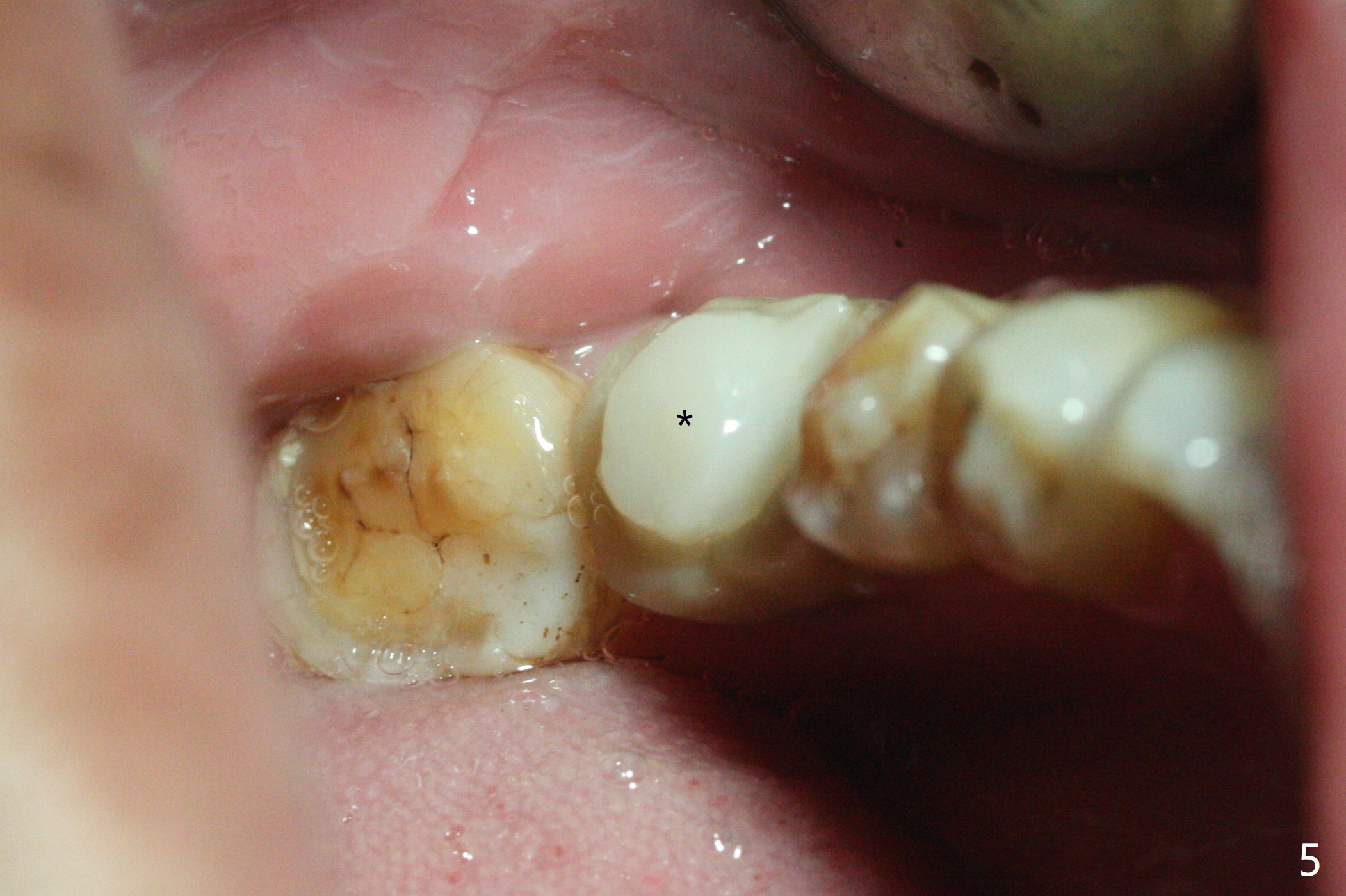 A 62-year-old man complains of food impaction around #19 implant crown one year 4 months post cementation (Fig.1-3). Before redo of the crown with poor mesial emergency profile (Fig.3 *), it appears necessary to correct the supraerupted opposing molar (Fig.1-3 downward arrow) and mesially tilted 2nd molar (Fig.3 horizontal arrow). The tooth #19 had been missing 20 years before implantation, associated with occlusal wear at #18 (Fig.4). For intrusion, composite is placed in the occlusal surface of #19 crown after roughening (Fig.5,6) with occlusal separation of the remaining dentition (Fig.6). The patient is instructed to bite on the left side as much and long as possible (even when he does not eat). Will the tooth #14 be intruded? Is the treatment sufficient?