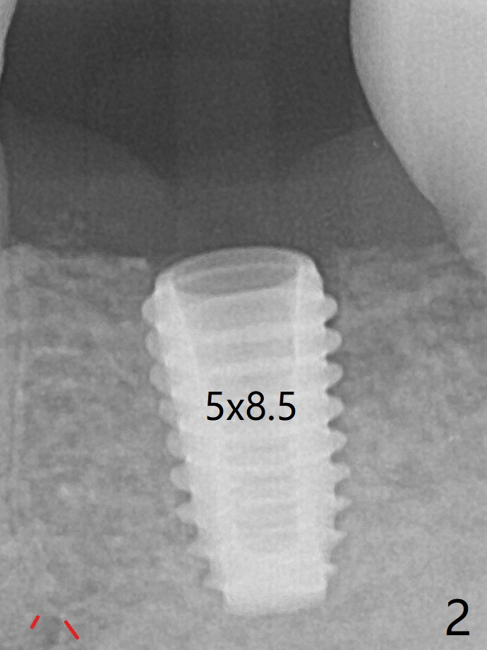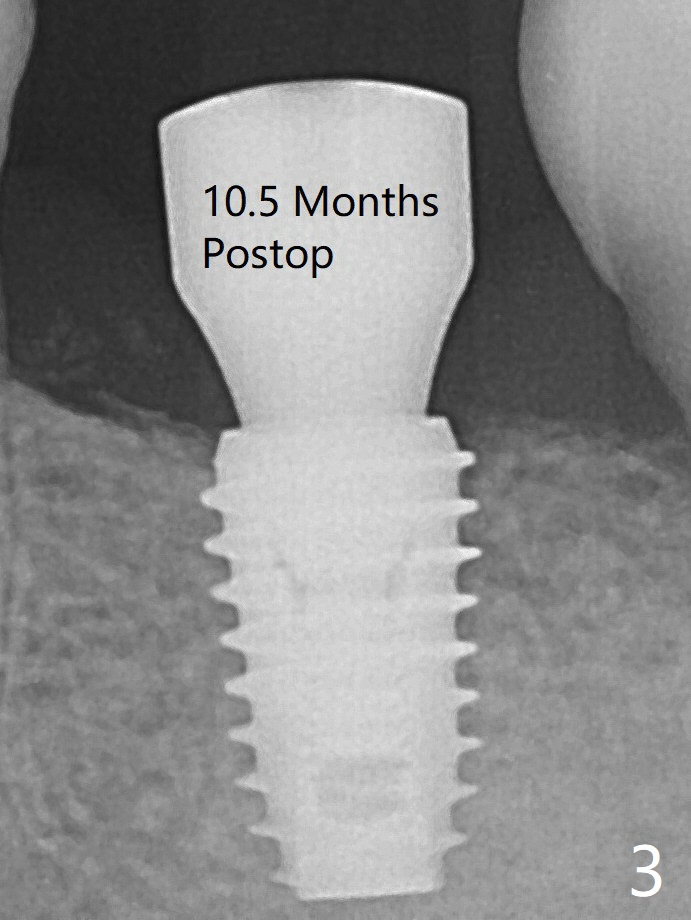 After use of 4.5x8.5 mm guide drill at #19, a 5x8.5 mm implant is placed with guide in place. When the latter is removed, the implant is found to be placed shallow. Following use of 4.5x10 mm drill for ~.75 mm deeper, the implant returns with deeper placement (Fig.1,2), confirmed after guide removal. Later the implant is turned 3 more times before placement of a 5.5x5(3) mm healing abutment. Autogenous bone graft is placed between the gingiva and the abutment to reduce chance of periimplantitis. The patient reports more severe pain (bone burn?) than free-hand placement at #30. In fact there is no bone loss around the implant 10.5 months postop (Fig.3).