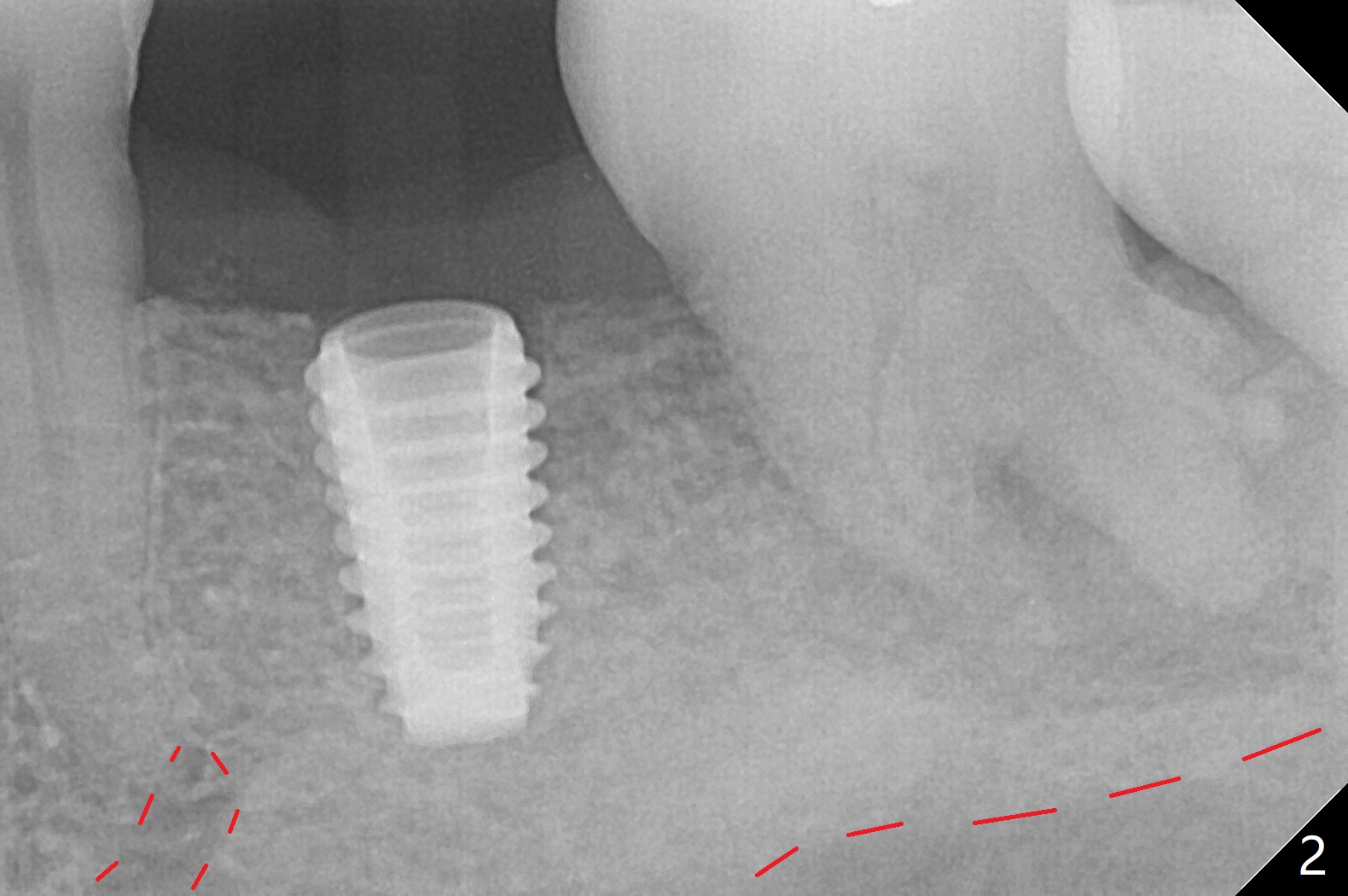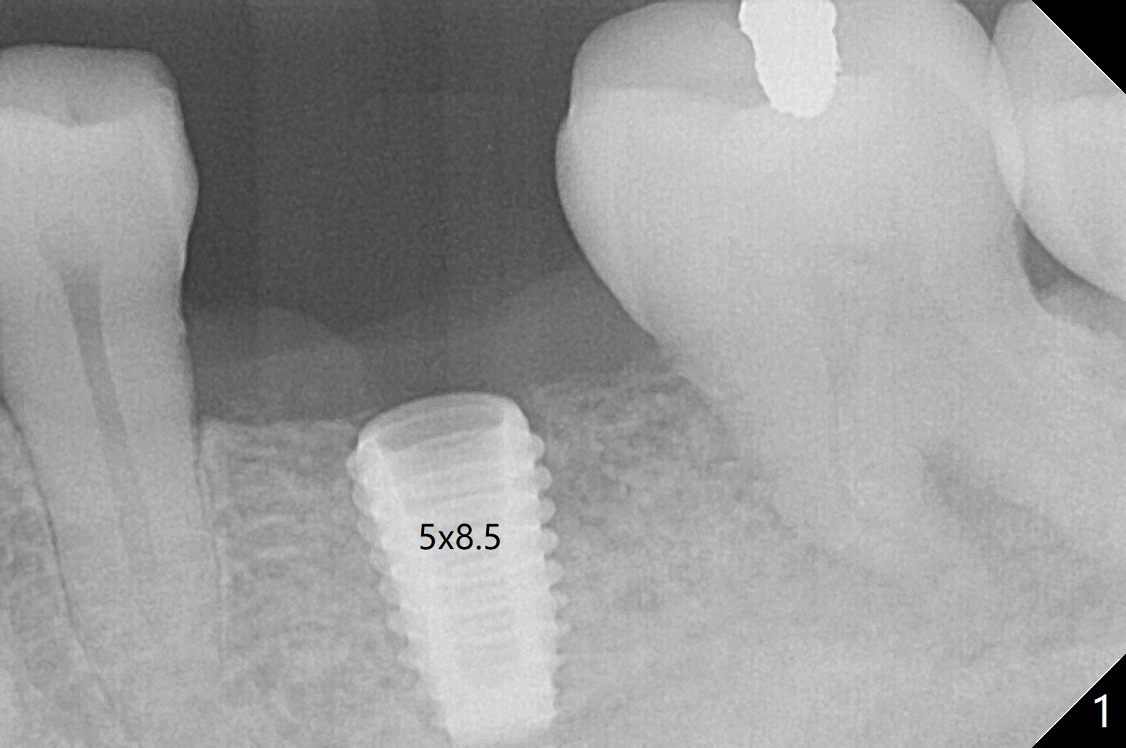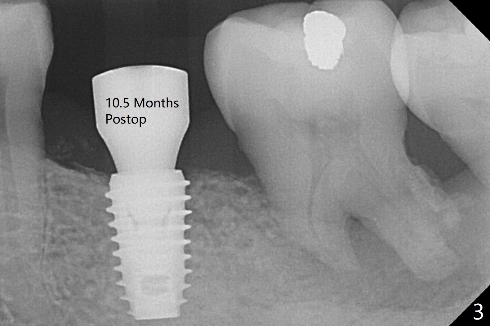 After use of 4.5x8.5 mm guide drill at #19, a 5x8.5 mm implant is placed with guide in place. When the latter is removed, the implant is found to be placed shallow. Following use of 4.5x10 mm drill for ~.75 mm deeper, the implant returns with deeper placement (Fig.1,2), confirmed after guide removal. The implant is further torqued 3 more times with visual confirmation of implant deeper placement. After seating a 5.5x5(3) mm healing abutment, autogenous bone graft is placed between the gingiva and the abutment to reduce chance of periimplantitis. The patient reports more severe pain (bone burn?) than free-hand placement at #30. In fact there is no bone loss around the implant 10.5 months postop (Fig.3).