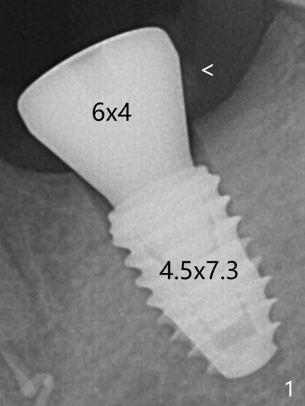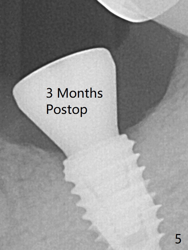 According to drill sequence at #19, the osteotomy is over prepared with the 4.5x8.5 mm last drill. The bone density does not feel so high that warrants use of 5.0 mm cortical tap. The insertion torque is ~ 25 Ncm (Fig.1). When a 6x4 mm healing abutment is placed, the implant does not turn. The distobuccal gingiva is slightly torn; following packing autogenous bone (<), periodontal dressing is applied. A provisional is not fabricated at #19, considering short healing time (Fig.5). But there is no gap between the implant and surrounding bone, as compared to Fig.1. It appears that overprep helps healing.