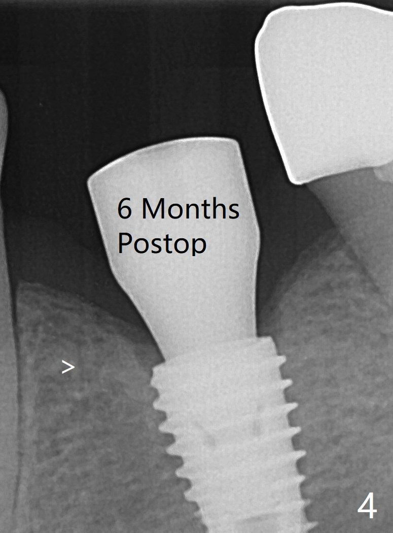 A 5.5x7(4) mm healing abutment is seated without contacting the crestal bone (Fig.2). Although there is crestal bone resorption 6 months postop, the bone density next to the 1st thread is apparently high (Fig.4 >). A 5.5x4(4) mm cemented abutment is placed for impression.