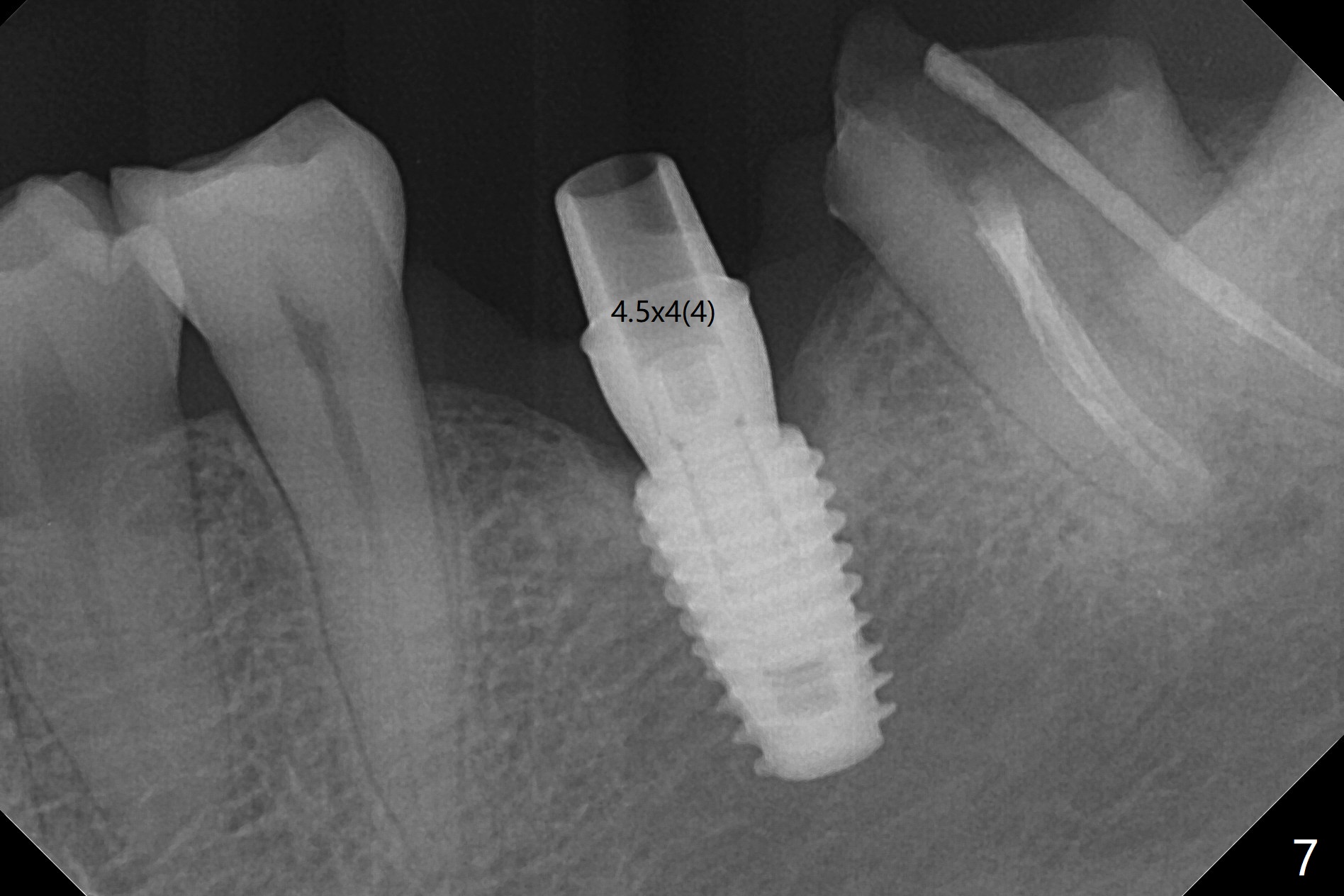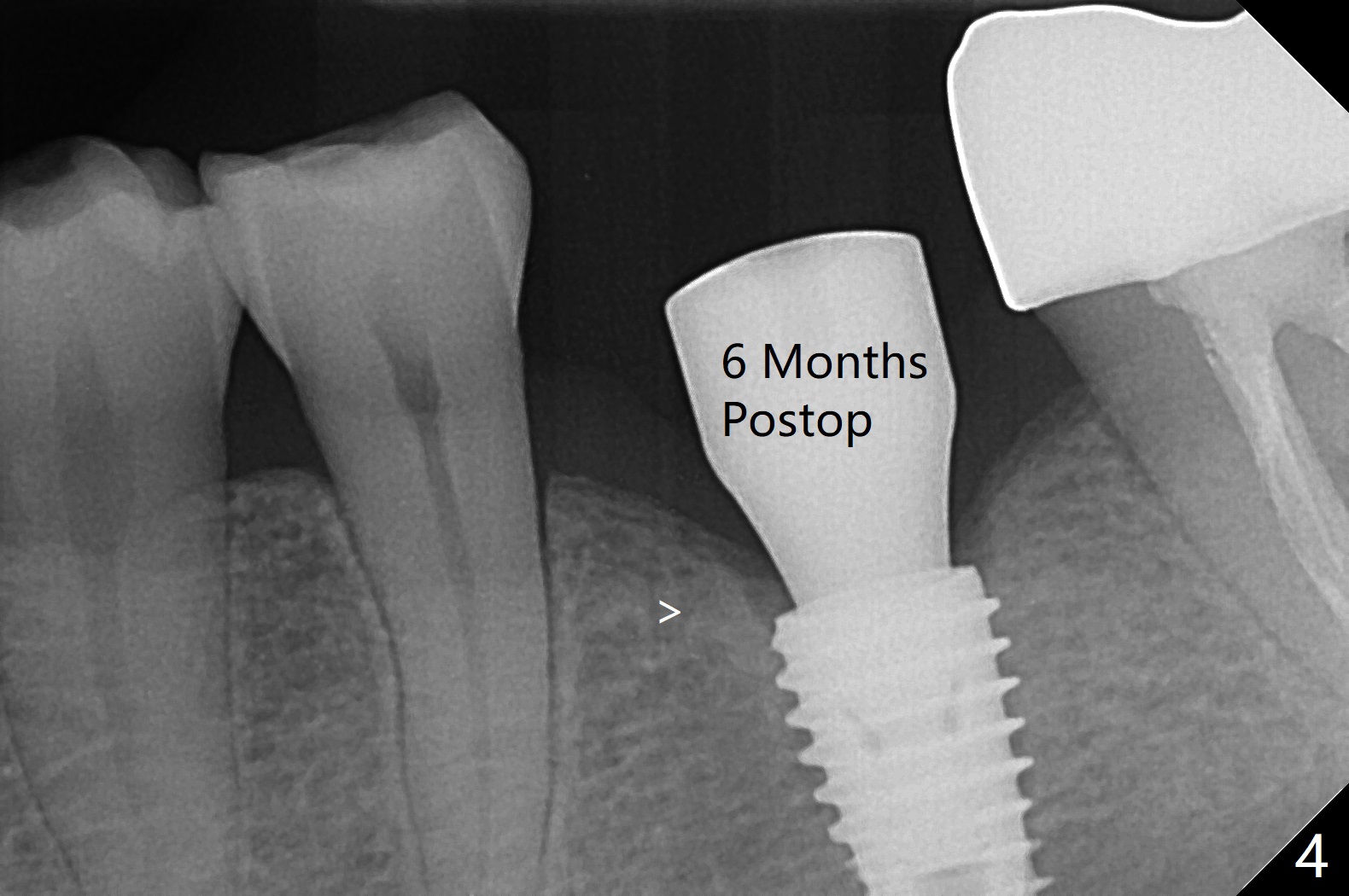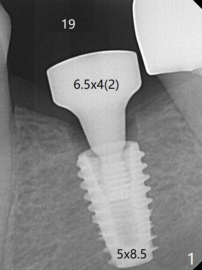 With one carpule of Xylocaine (34 mg with 17 mcg of Epinephrine), a 5x8.5 mm implant is placed at #19 in a timely and painless manner. The patient is pleased as compared to her previous implant placement at #3 and 30. Due to the thin buccal bone, the implant is placed ~.5 mm deeper than designed; a 6.5x4(2) mm healing abutment is incompletely seated (Fig.1). A smaller and skinny one (5.5x7(4) mm) is seated normally (Fig.2). Regional panoramic X-ray shows clearance from the Inferior Alveolar Canal (Fig.3 *). Although there is crestal bone resorption 6 months postop, the bone density next to the 1st thread is high (Fig.4 >). A 5.5x4(4) mm cemented abutment is placed for impression. The patient returns with #18 crown dislodgement and #19 crown loosening 11 months post cementation (Fig.5 <: gap between implant and abutment). Since the crown and abutment are unable to be torqued properly, they are removed (Fig.6). A narrower abutment is able to be seated apparently completely while a metal post (Fig.7 *) is tried in in the distal root of #18. To reduce the chance of re-fracture of #18 crown, the tooth #15 needs to be distalized orthodontically so that an implant will be placed at #14 (Fig.5).