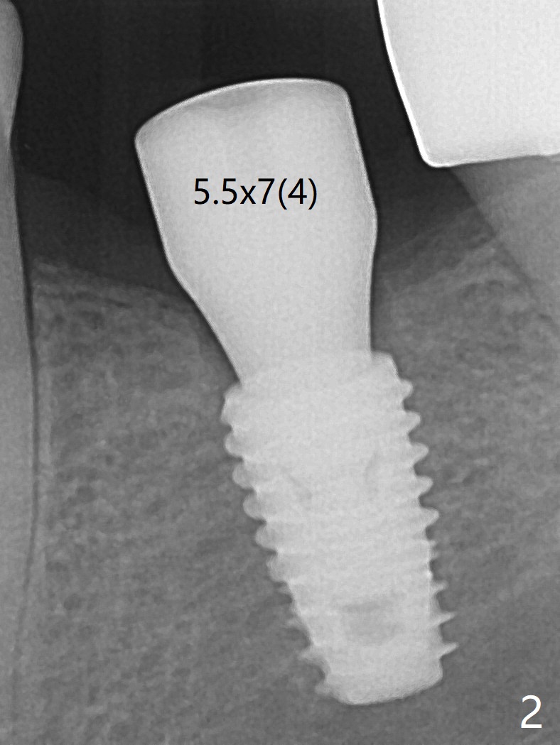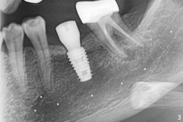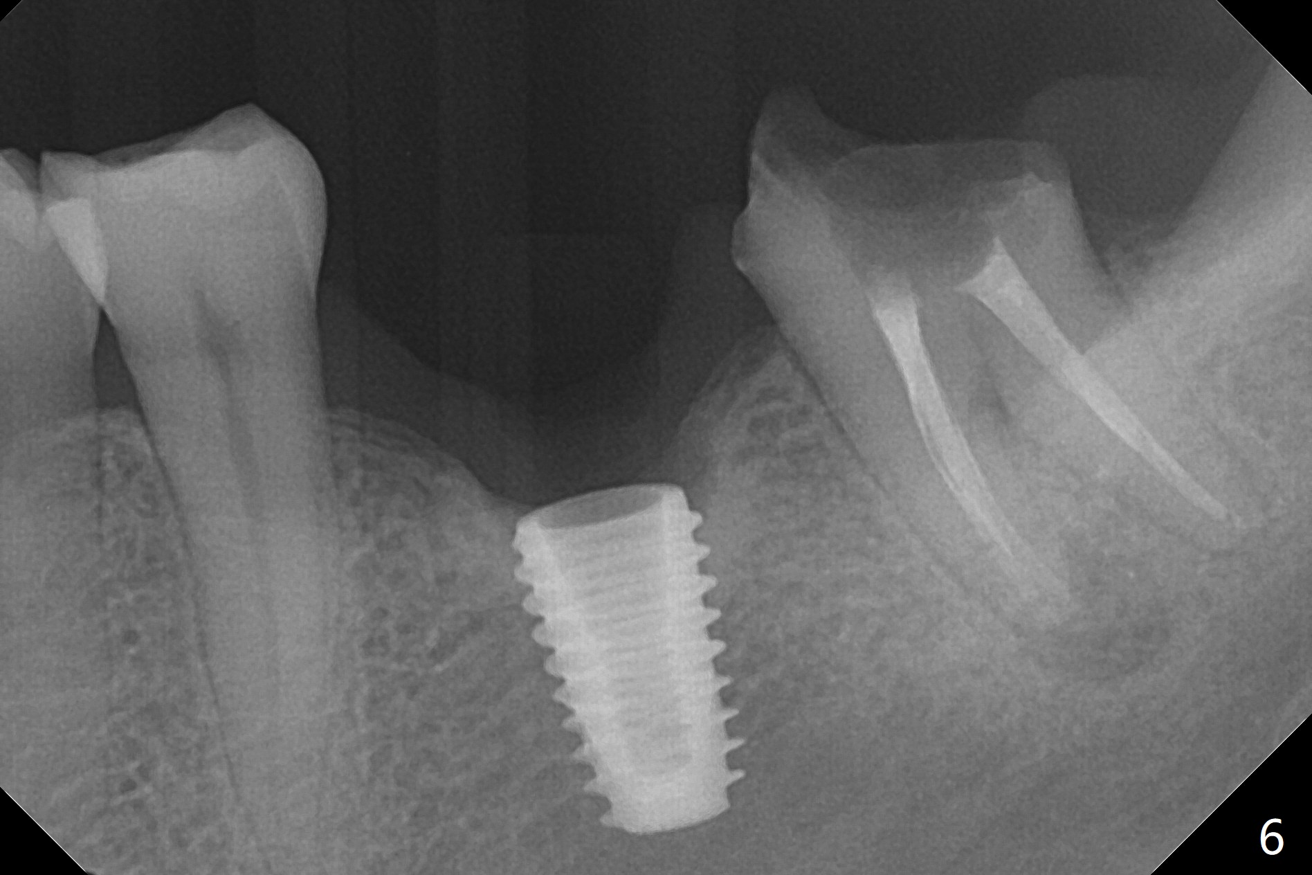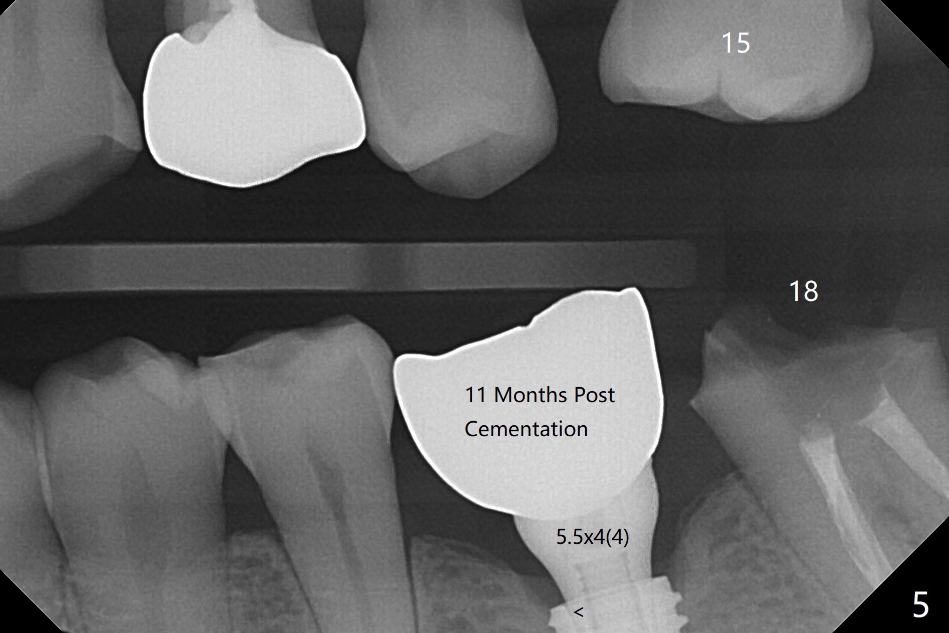 With one carpule of Xylocaine (34 mg with 17 mcg of Epinephrine), a 5x8.5 mm implant is placed at #19 in a timely and painless manner. The patient is pleased as compared to her previous implant placement at #3 and 30. Due to the thin buccal bone, the implant is placed ~.5 mm deeper than designed; a 6.5x4(2) mm healing abutment is incompletely seated (Fig.1). A smaller and skinny one (5.5x7(4) mm) is seated normally (Fig.2). Regional panoramic X-ray shows clearance from the Inferior Alveolar Canal (Fig.3 *). Although there is crestal bone resorption 6 months postop, the bone density next to the 1st thread is high (Fig.4 >). A 5.5x4(4) mm cemented abutment is placed for impression. The patient returns with #18 crown dislodgement and #19 crown loosening 11 months post cementation (Fig.5 <: gap between implant and abutment). Since the crown and abutment are unable to be torqued properly, they are removed (Fig.6). A narrower abutment is able to be seated apparently completely while a metal post (Fig.7 *) is tried in in the distal root of #18. To reduce the chance of re-fracture of #18 crown, the tooth #15 needs to be distalized orthodontically so that an implant will be placed at #14 (Fig.5).