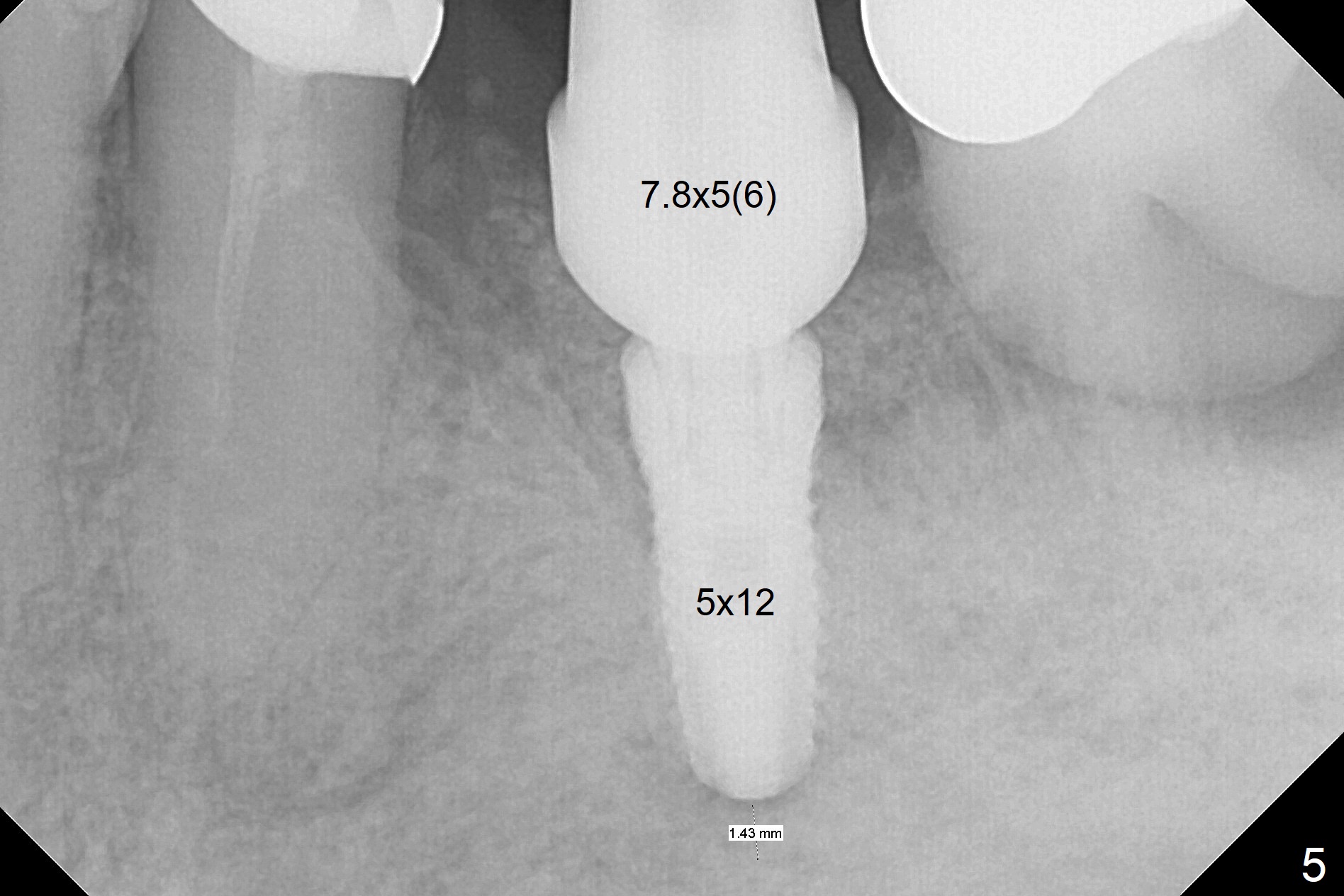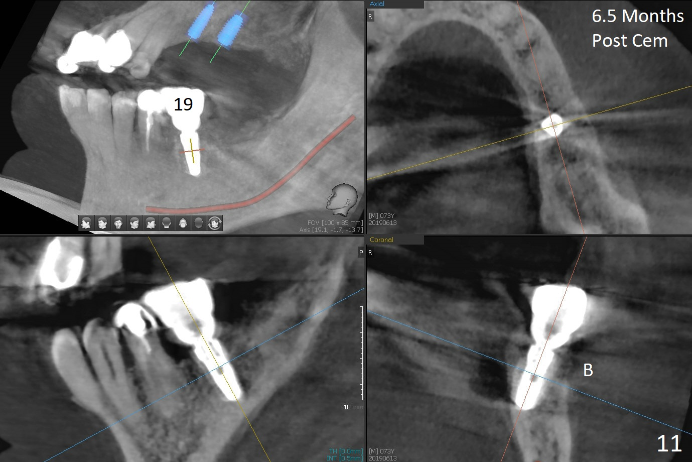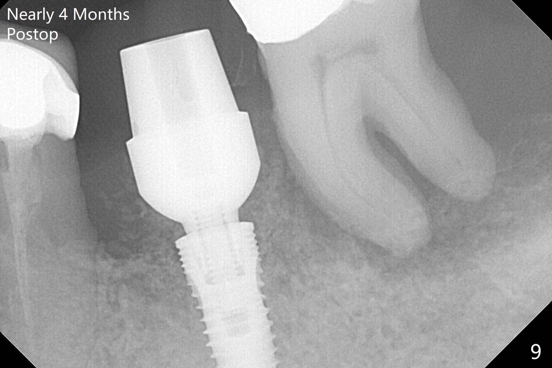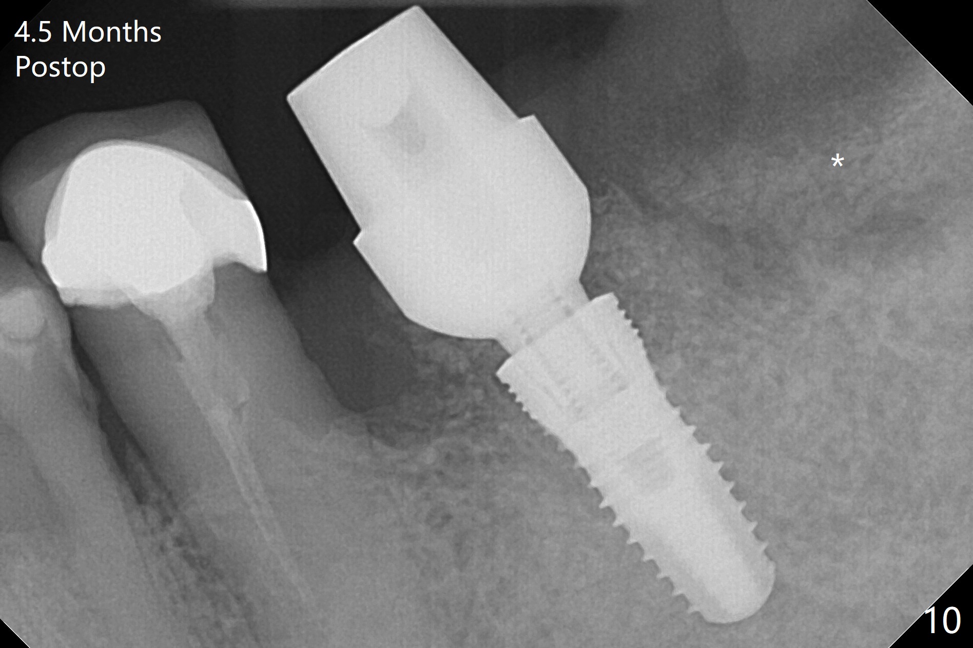 After extraction of the supraerupted tooth #19 with severe buccal gingival recession, the buccal and lingual plate are found to be lost. The sockets are fused and flat without the septum. The bone is hard and painful for the initial osteotomy with infiltration anesthesia (Fig.2). Following block anesthesia, the initial osteotomy depth extends to 8 mm (Fig.3,4). With apparent 4.9 mm clearance, the osteotomy is further extended to 10 mm. The osteotomy walls are apparently intact without severe hemorrhage after each drill. Due to the thick gingiva and severe bone loss, a 5x12 mm implant is intentionally placed 3 mm above the base of the socket bone (Fig.5,6 (yellow dashed line)). Vanilla Cortical and Cancellous allograft (Fig.6 *) is placed around the exposed implant and 7.8x5(6) mm abutment with 4 and 2 mm buccal and lingual gaps. Next collagen plug cut in strip is placed to fill the most coronal aspect of the socket (Fig.7 *). The buccal and lingual gingivae are approximated with sutures proximally. Finally periodontal dressing is applied. Since the Inferior Alveolar Canal is vague in intraop PAs (Fig.4,5), there is worry about potential nerve damage during and after osteotomy. This should be no issue if preop panoramic X-ray is reviewed with measurement (Fig.8). The bone graft appears to remain in place nearly 4 months postop (Fig.9). Two weeks later, he returns for impression. When the provisional is removed, the gingiva is unhealthy. Without the provisional and with improved oral hygiene, the gingiva is healthy one week later, but the tooth #18 is symptomatic. The latter is extracted with socket preservation (Fig.10 *). There is no apparent bone loss around the implant at #19 6.5 months post cementation (Fig.11).