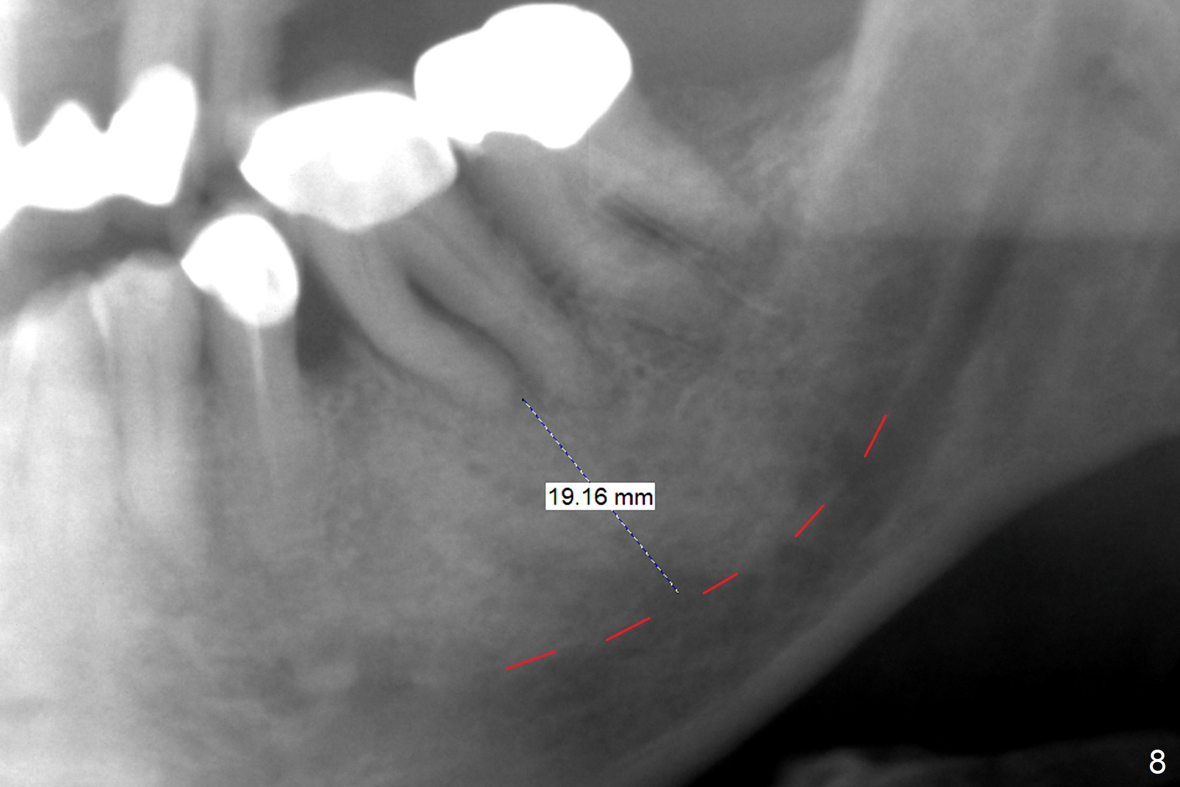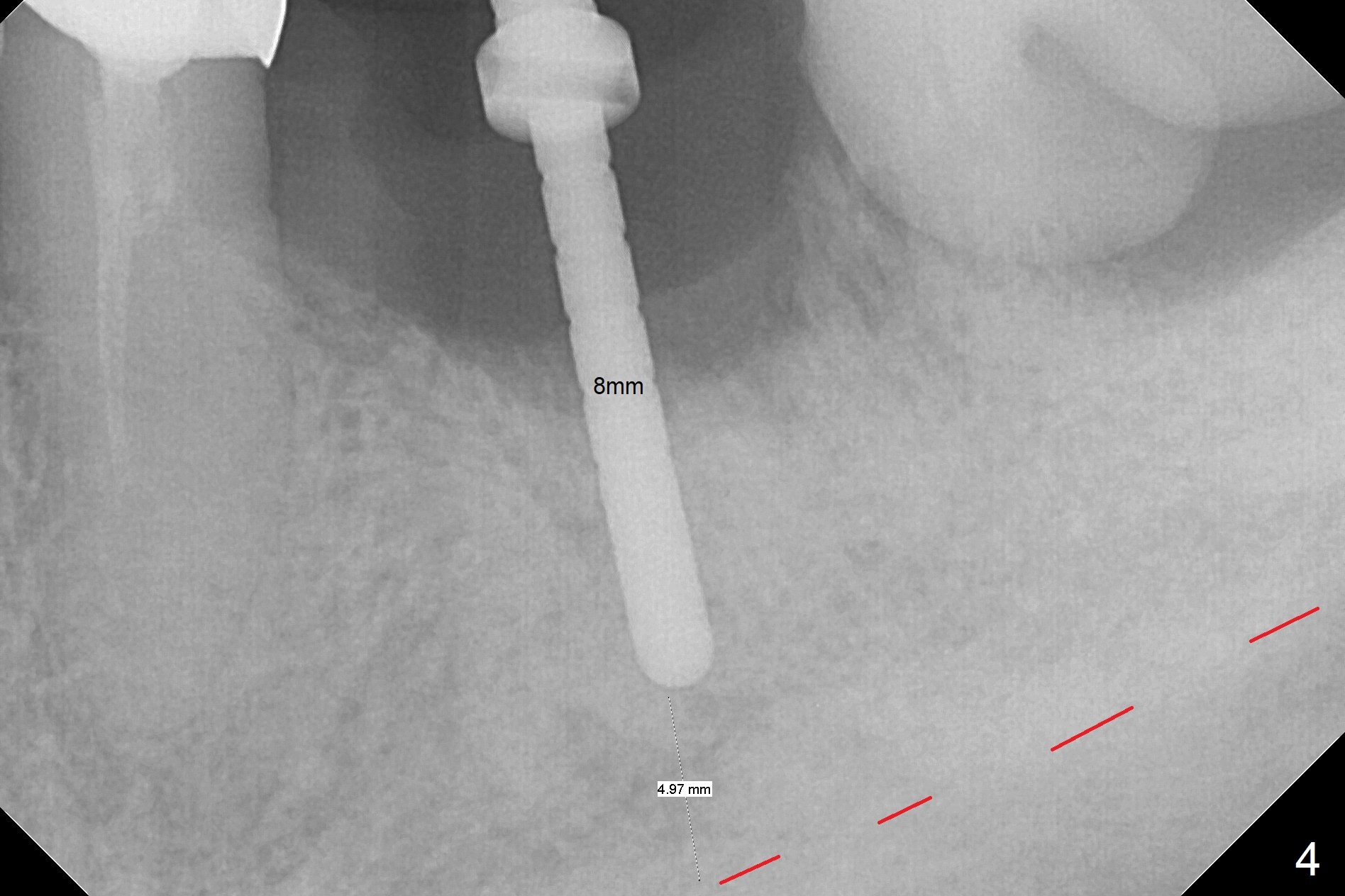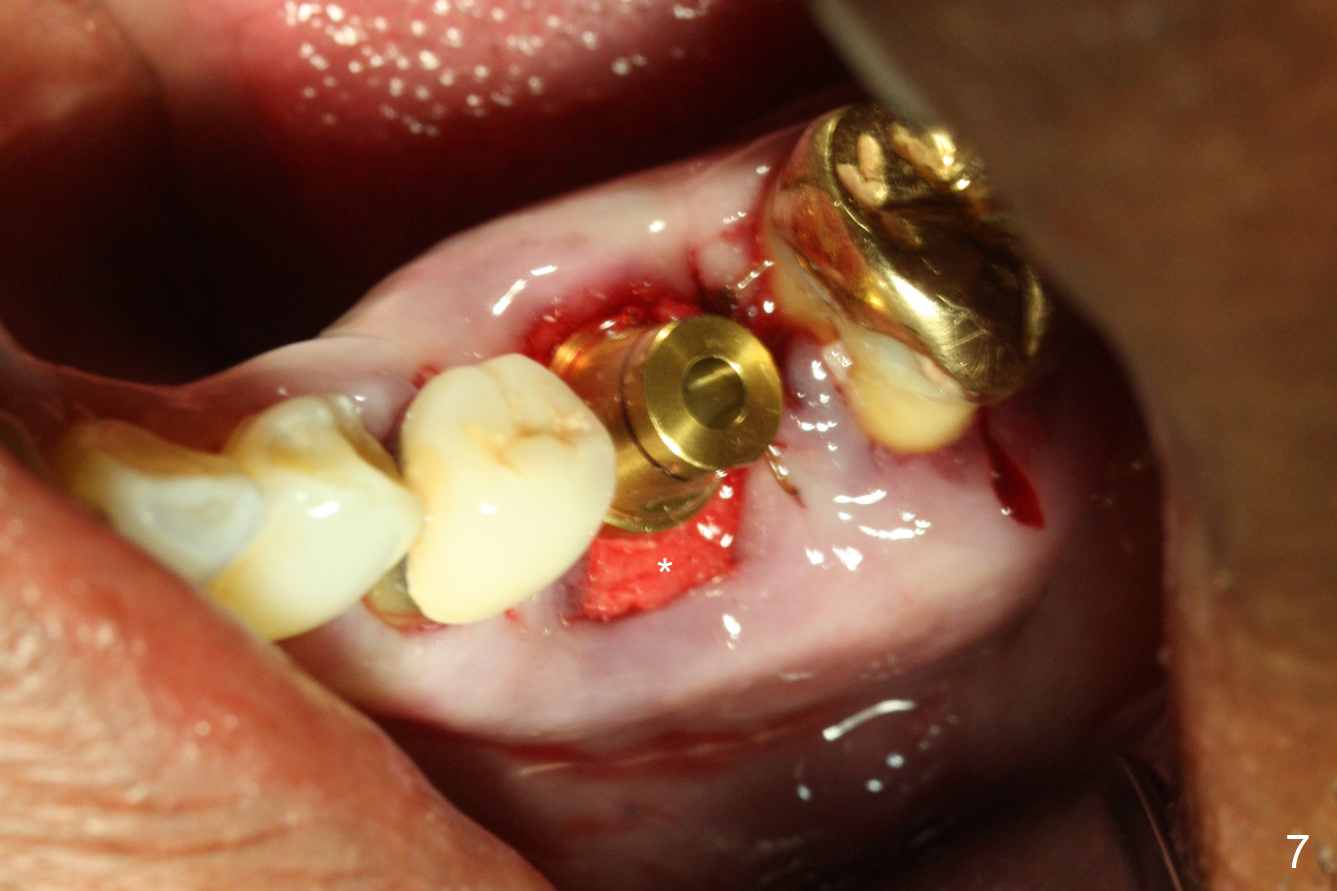 After extraction of the supraerupted tooth #19 with severe buccal gingival recession, the buccal and lingual plate are found to be lost. The sockets are fused and flat without the septum. The bone is hard and painful for the initial osteotomy with infiltration anesthesia (Fig.2). Following block anesthesia, the initial osteotomy depth extends to 8 mm (Fig.3,4). With apparent 4.9 mm clearance, the osteotomy is further extended to 10 mm. The osteotomy walls are apparently intact without severe hemorrhage after each drill. Due to the thick gingiva and severe bone loss, a 5x12 mm implant is intentionally placed 3 mm above the base of the socket bone (Fig.5,6 (yellow dashed line)). Vanilla Cortical and Cancellous allograft (Fig.6 *) is placed around the exposed implant and 7.8x5(6) mm abutment with 4 and 2 mm buccal and lingual gaps. Next collagen plug cut in strip is placed to fill the most coronal aspect of the socket (Fig.7 *). The buccal and lingual gingivae are approximated with sutures proximally. Finally periodontal dressing is applied. Since the Inferior Alveolar Canal is vague in intraop PAs (Fig.4,5), there is worry about potential nerve damage during and after osteotomy. This should be no issue if preop panoramic X-ray is reviewed with measurement (Fig.8). The bone graft appears to remain in place nearly 4 months postop (Fig.9). Two weeks later, he returns for impression. When the provisional is removed, the gingiva is unhealthy. Without the provisional and with improved oral hygiene, the gingiva is healthy one week later, but the tooth #18 is symptomatic. The latter is extracted with socket preservation (Fig.10 *). There is no apparent bone loss around the implant at #19 6.5 months post cementation (Fig.11).