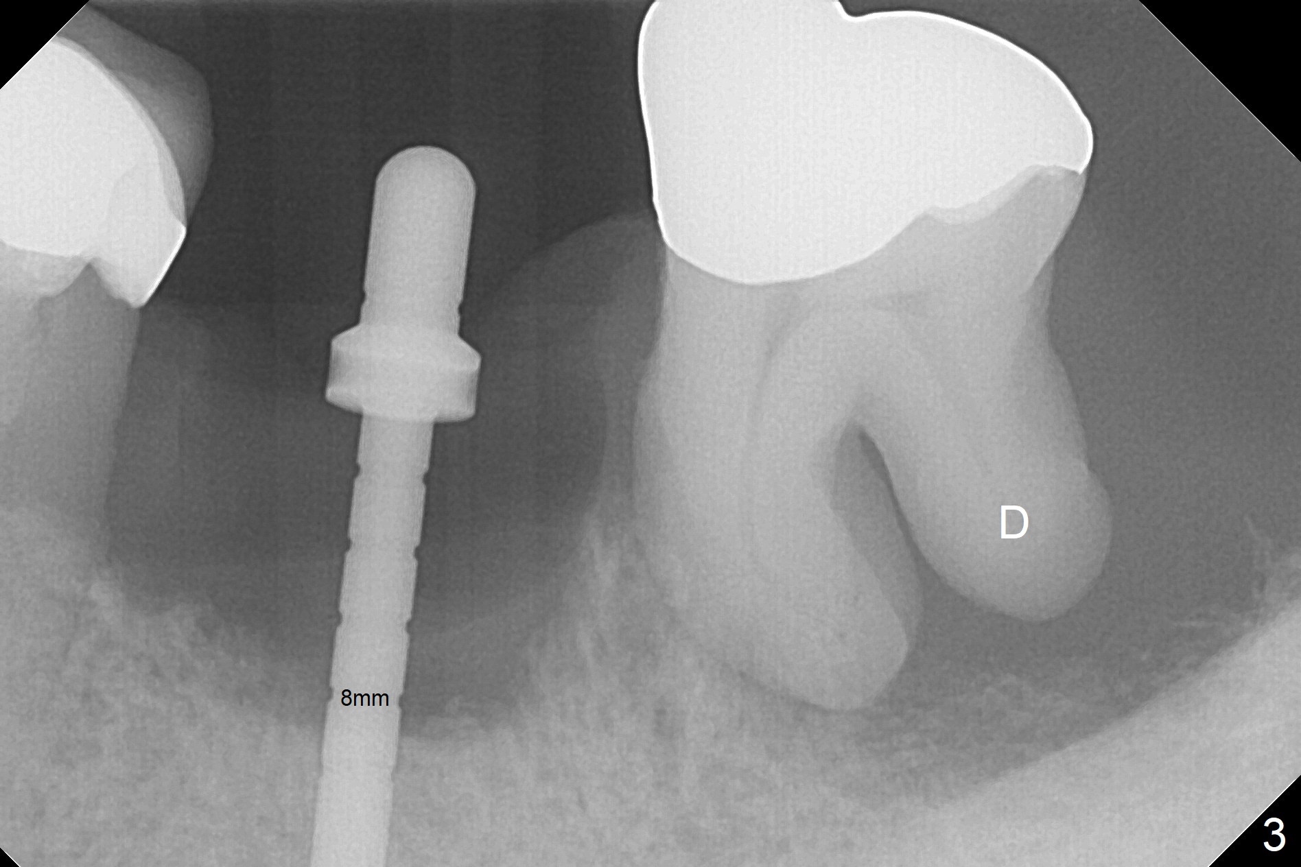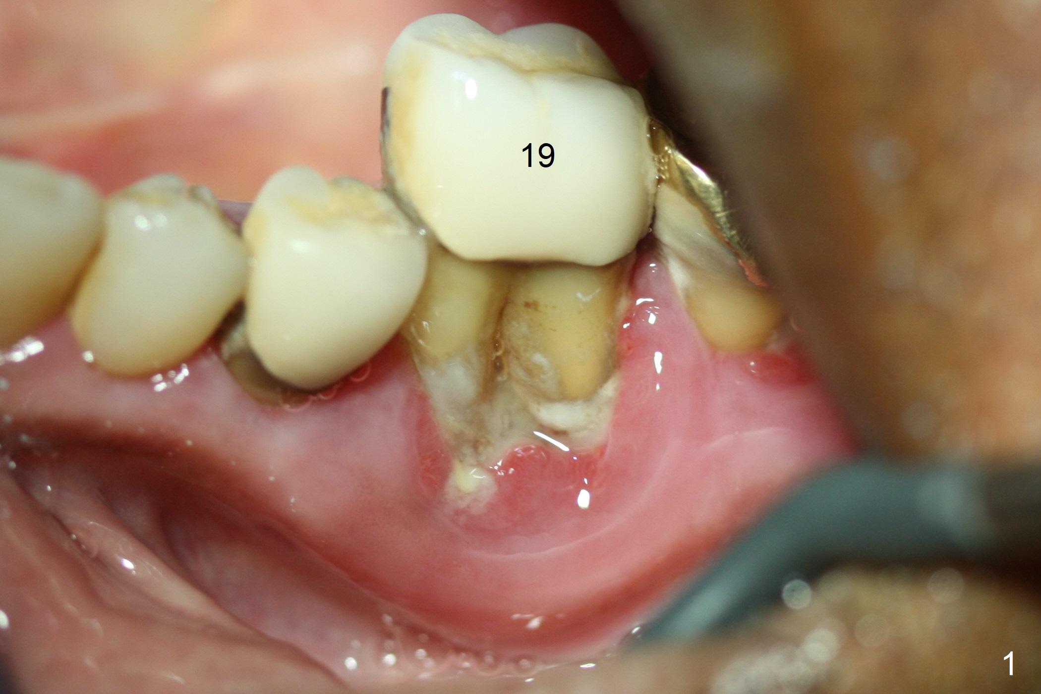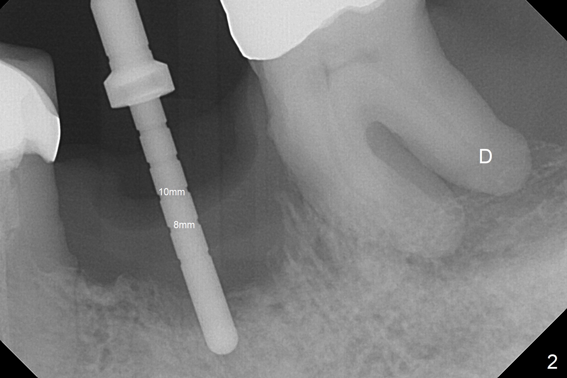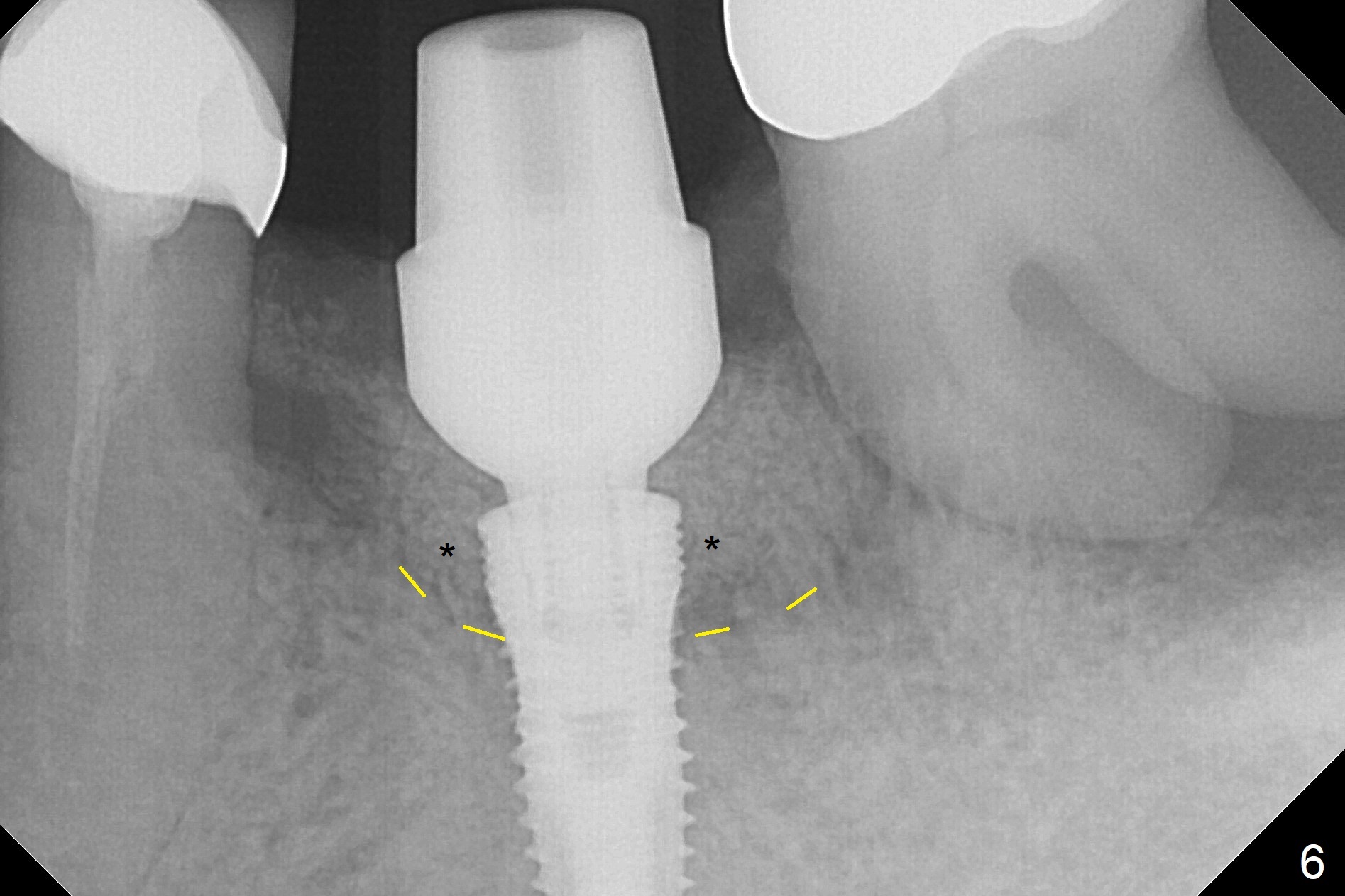 After extraction of the supraerupted tooth #19 with severe buccal gingival recession, the buccal and lingual plate are found to be lost. The sockets are fused and flat without the septum. The bone is hard and painful for the initial osteotomy with infiltration anesthesia (Fig.2). Following block anesthesia, the initial osteotomy depth extends to 8 mm (Fig.3,4). With apparent 4.9 mm clearance, the osteotomy is further extended to 10 mm. The osteotomy walls are apparently intact without severe hemorrhage after each drill. Due to the thick gingiva and severe bone loss, a 5x12 mm implant is intentionally placed 3 mm above the base of the socket bone (Fig.5,6 (yellow dashed line)). Vanilla Cortical and Cancellous allograft (Fig.6 *) is placed around the exposed implant and 7.8x5(6) mm abutment with 4 and 2 mm buccal and lingual gaps. Next collagen plug cut in strip is placed to fill the most coronal aspect of the socket (Fig.7 *). The buccal and lingual gingivae are approximated with sutures proximally. Finally periodontal dressing is applied. Since the Inferior Alveolar Canal is vague in intraop PAs (Fig.4,5), there is worry about potential nerve damage during and after osteotomy. This should be no issue if preop panoramic X-ray is reviewed with measurement (Fig.8). The bone graft appears to remain in place nearly 4 months postop (Fig.9). Two weeks later, he returns for impression. When the provisional is removed, the gingiva is unhealthy. Without the provisional and with improved oral hygiene, the gingiva is healthy one week later, but the tooth #18 is symptomatic. The latter is extracted with socket preservation (Fig.10 *). There is no apparent bone loss around the implant at #19 6.5 months post cementation (Fig.11).