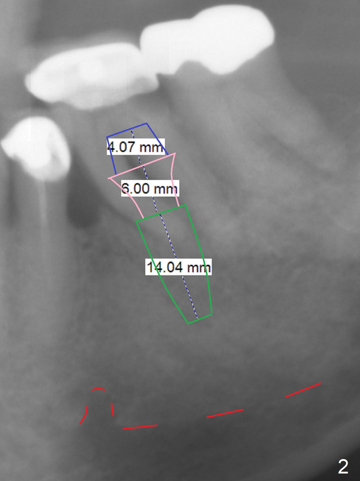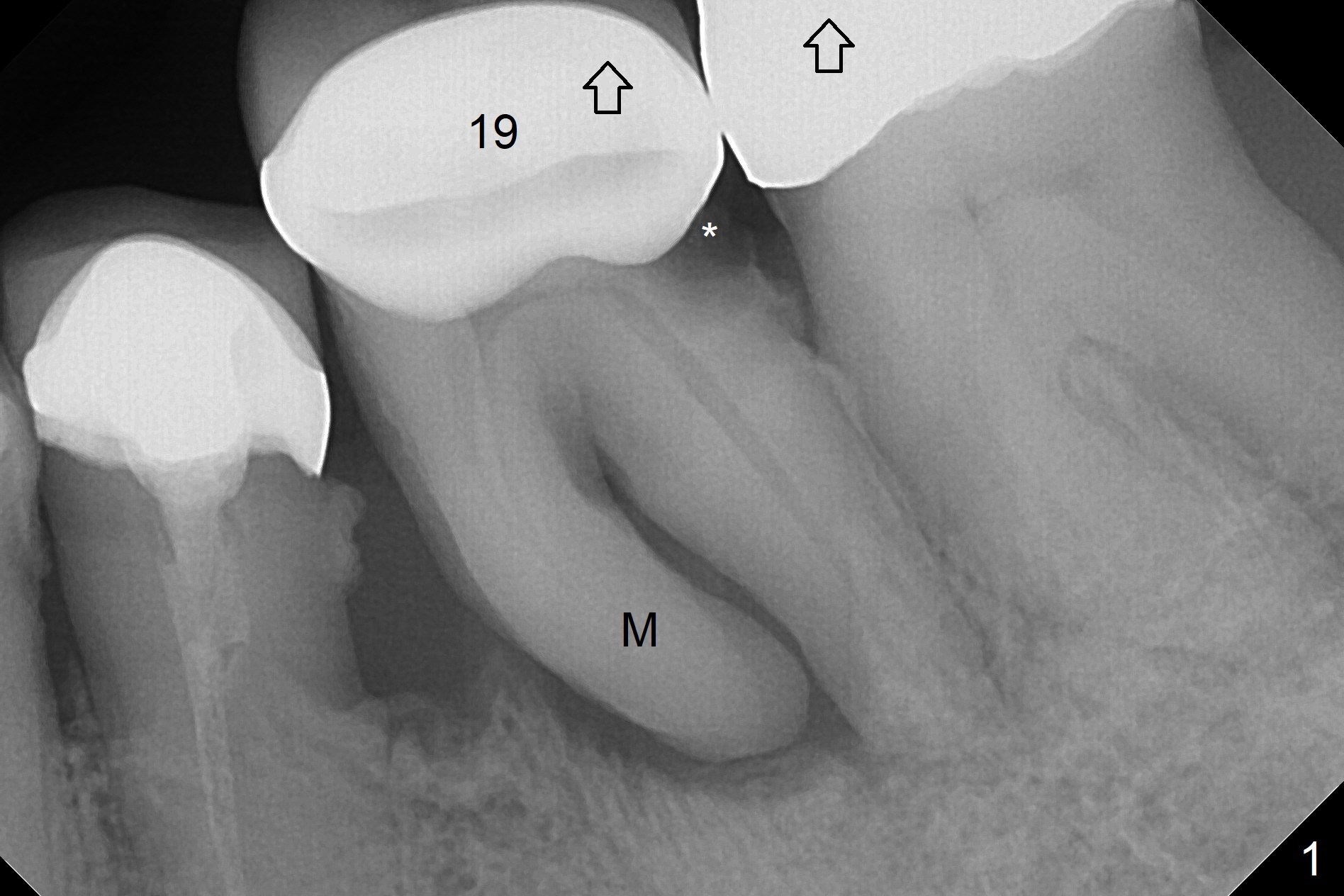 Supraerupted Molar Five months post cementation of #29-31 implant FPD of a 72-year-old man, the supraerupted (Fig.1 arrow) tooth #19 fails (caries (*) and mesial (M) root radiolucency). A 14 mm long implant (Fig.2 green) will be placed deep with 6 mm cuff (pink) and 4 mm abutment (blue). Return to Lower Molar Immediate Implant, Prevent Molar Periimplantitis (Protocols, Table), Armaments, Metronidazole Xin Wei, DDS, PhD, MS 1st edition 06/05/2018, last revision 06/12/2018 |