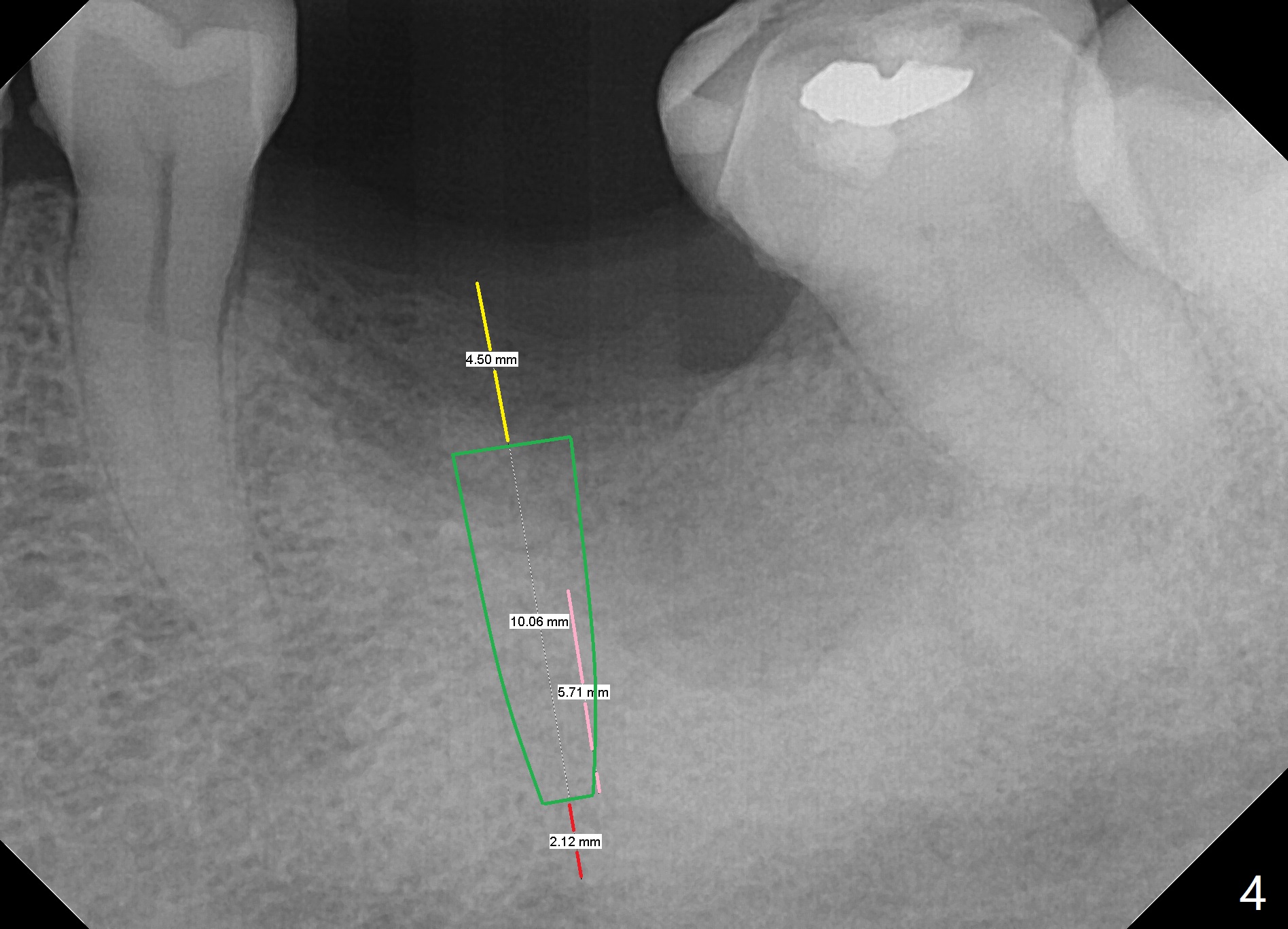 A 59-year-old woman had the tooth #19 with apparently residual roots extracted in her home country ~ 6 months ago (Fig.1). There seems to be severe bone plate resorption, with the buccal crest (Fig.2 red dashed line) 7-8 mm lower than the lingual one (pink dashed line). Following flap reflection, an osteotomy will be established between the crests (Fig.2 white circle). A 4 or 4.5x10 mm implant with high stability (Fig.4 green outline) will be placed ~ 4 mm (yellow line) below the lingual crest and ~ 4 mm above the buccal one. The implant is going to have > 5 mm in the native bone (pink). It may have ~ 2 mm (red line) clearance from the Inferior Alveolar Canal. Since the implant is most likely placed lingually, prepare the Planning Kit and an angled abutment. Vanilla graft will be placed buccally, followed by PRF membranes. One of the latter has a hole for the abutment to penetrate.