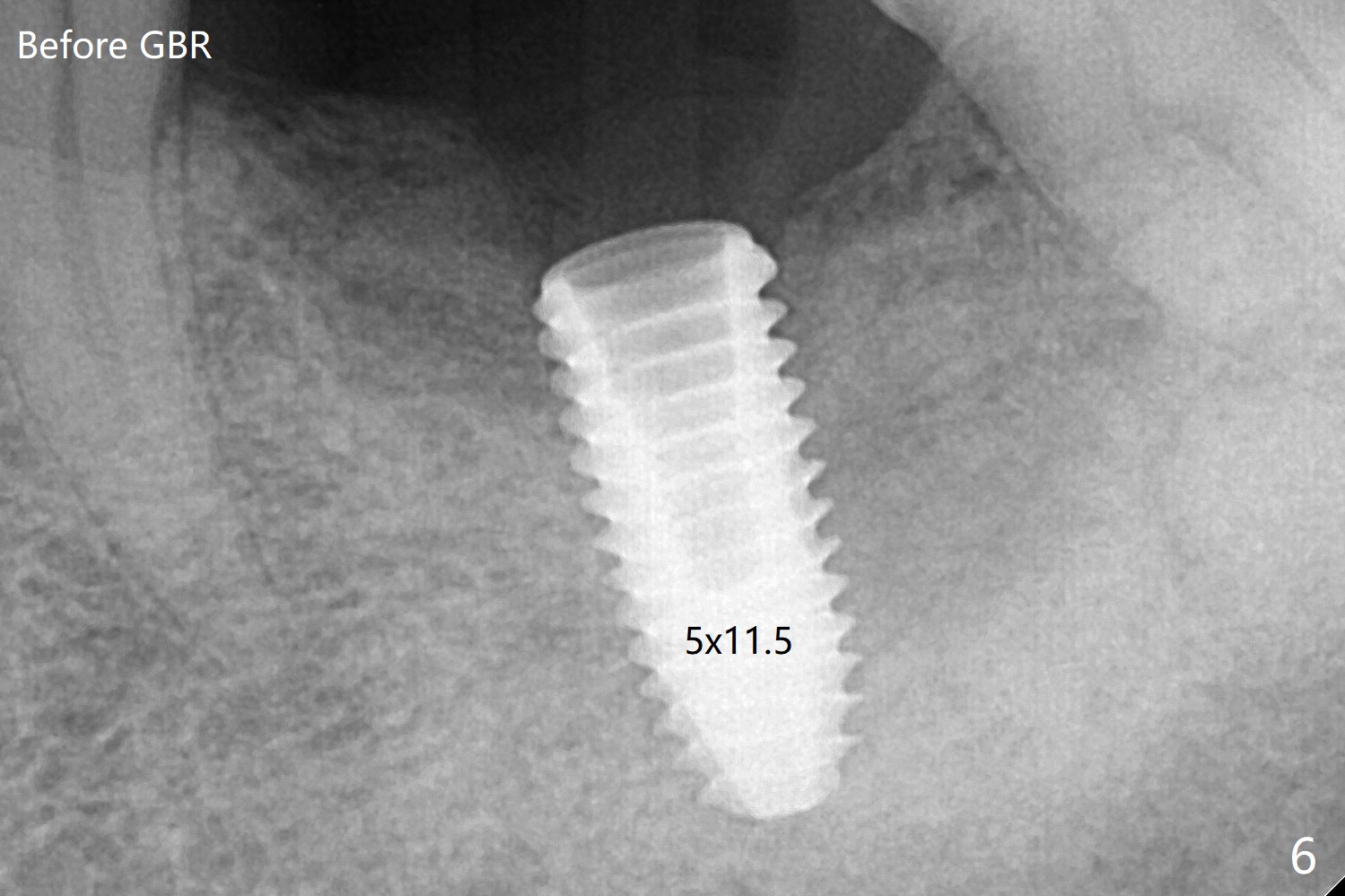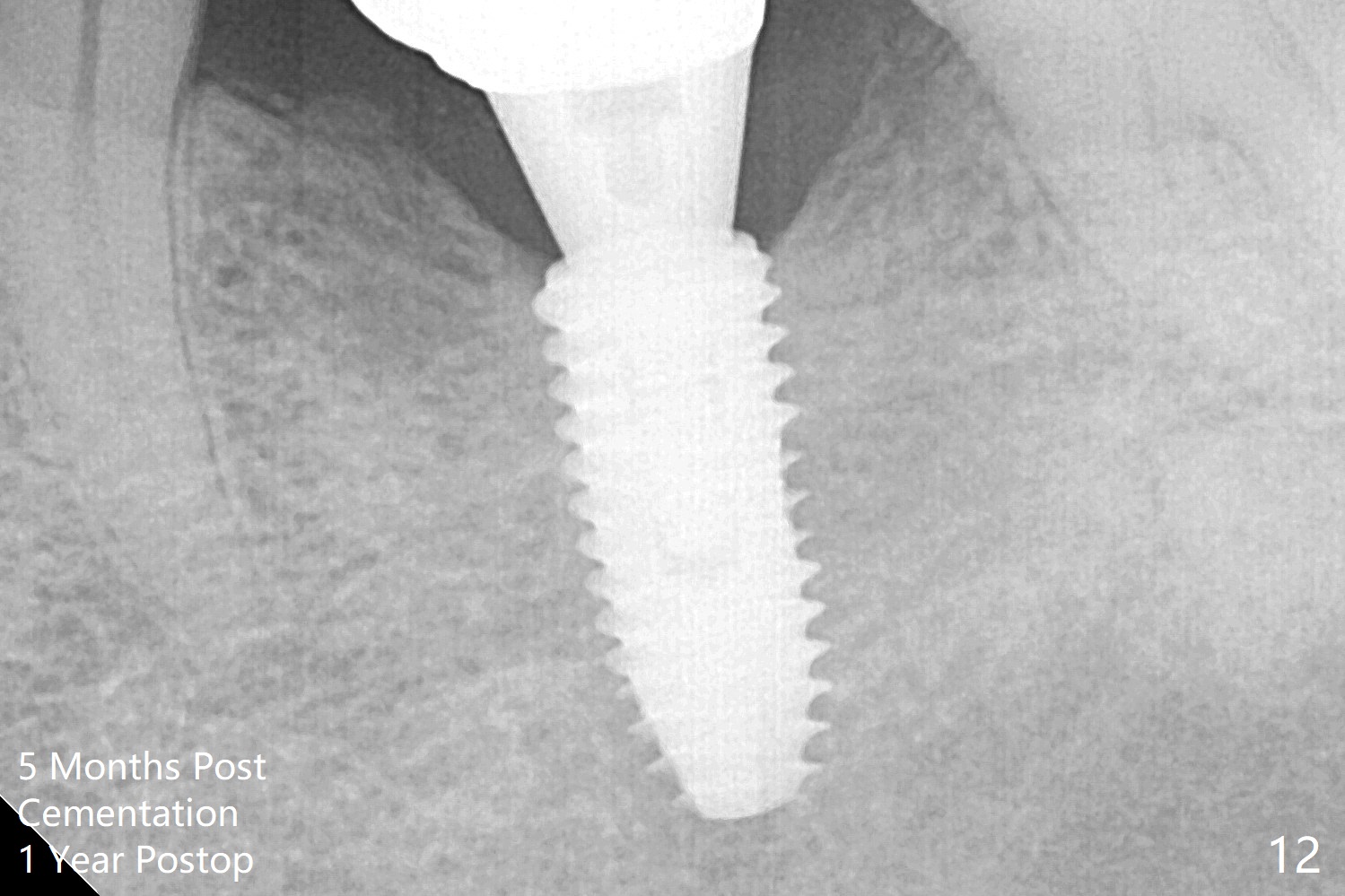 Note radiolucency around the implant (5x11.5 mm) before GBR (Fig.6). The bone density around the implant increases with distinct trabecular pattern consistent with stress 5 months post cementation (1 year postop, Fig.12).