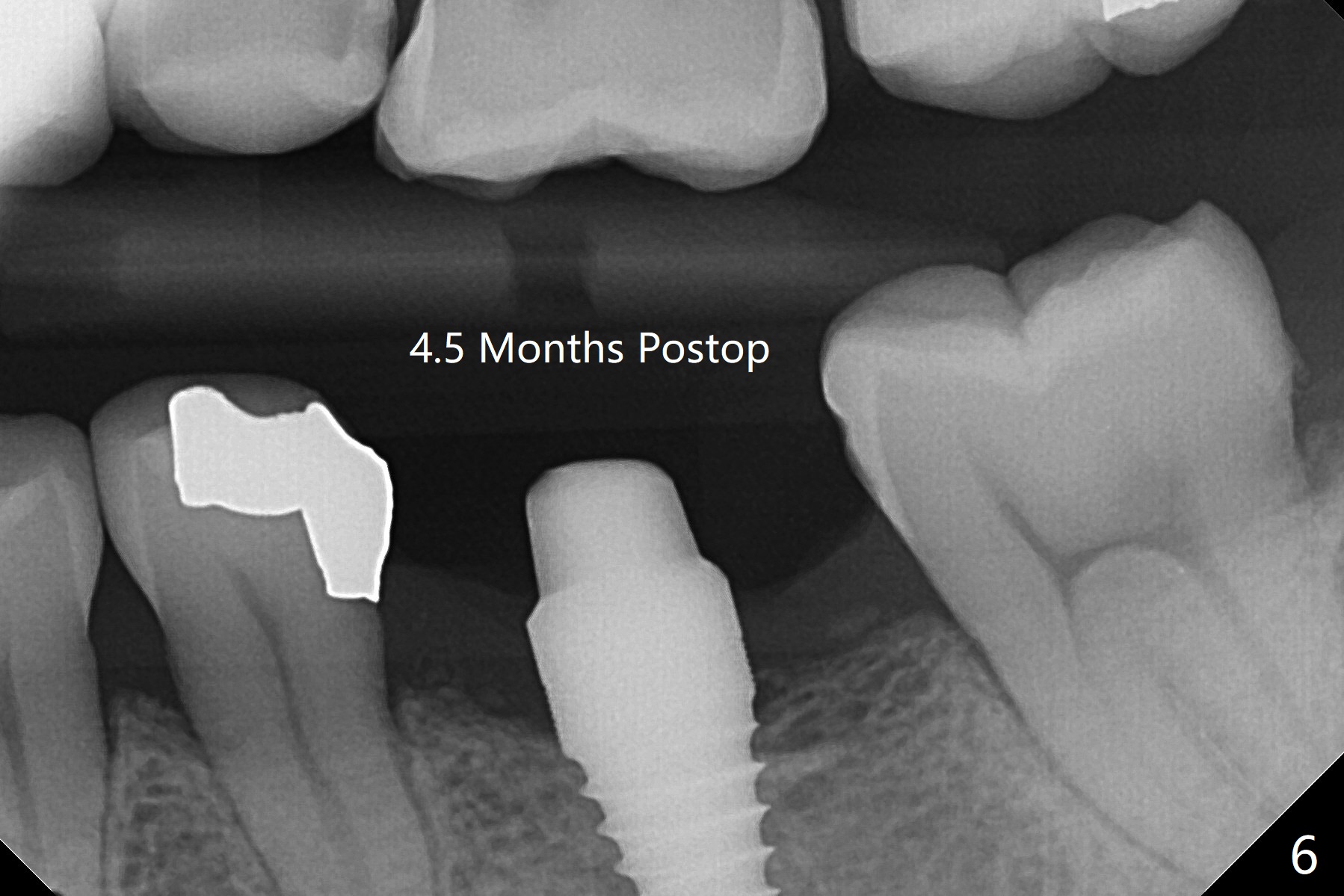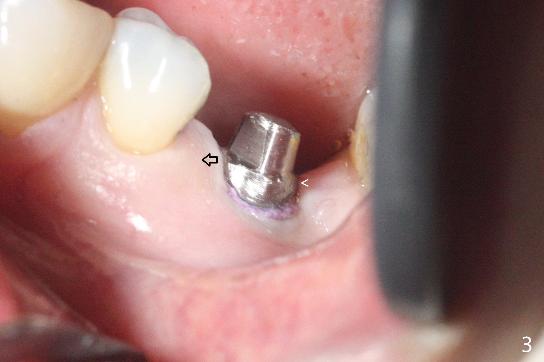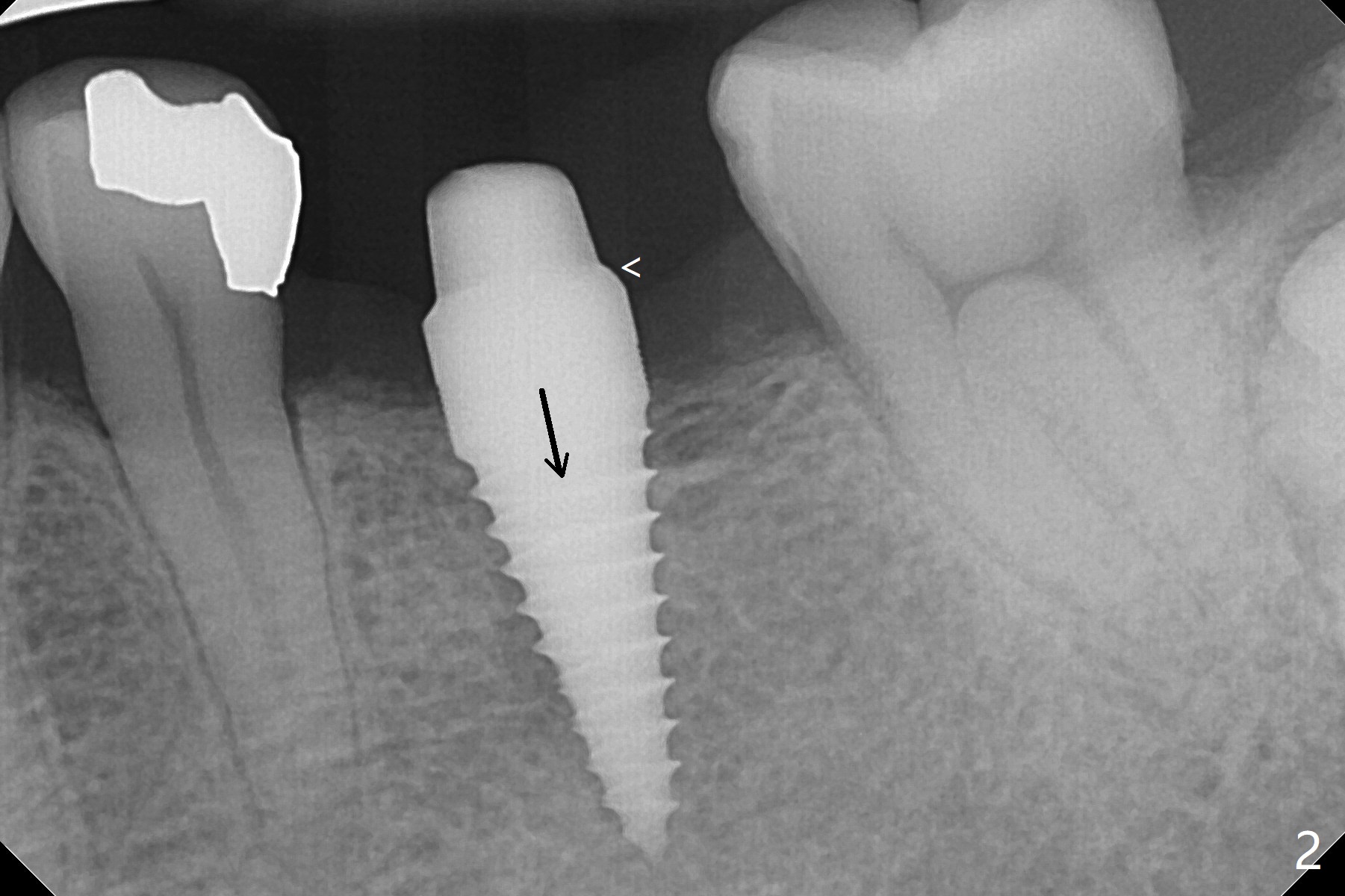 适当更改导板(为两段式接近圆柱状植体设计)钻洞顺序(根尖钻头小,而一段式植体根尖特别尖),5x14毫米一段式软组织水平植体植入,扭力大约35Ncm(图一),略微种深(图二:长箭头)后,磨短基台(与图一对比;左上6伸长),颊侧,远中,舌侧边缘降低(图二,三:<;增加基台高度,提高牙冠固位),制作临时牙冠(图四:P),主要目的将近中牙龈推向近中(图三:空箭头),暴露近中基台边缘,以后好取模。总之,一段式植体需要考虑临时修复。术后两个月临时牙冠和周围牙龈正常(图五)。术后4.5月轻度骨质吸收(图六),临床上看不出来螺纹将要暴露,取模。病人抱怨用临时牙冠咀嚼疼痛,不咬后没有不舒服,其实临时牙冠咬合面穿孔,牙龈正常,永久粘固剂没有外溢(图七)。术后4.5-6个月植体周围骨质吸收(图六,七)。牙槽嵴处钻洞应与植体直径一样才能减少骨质吸收。