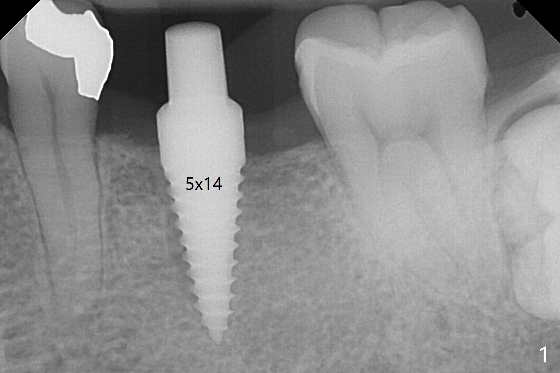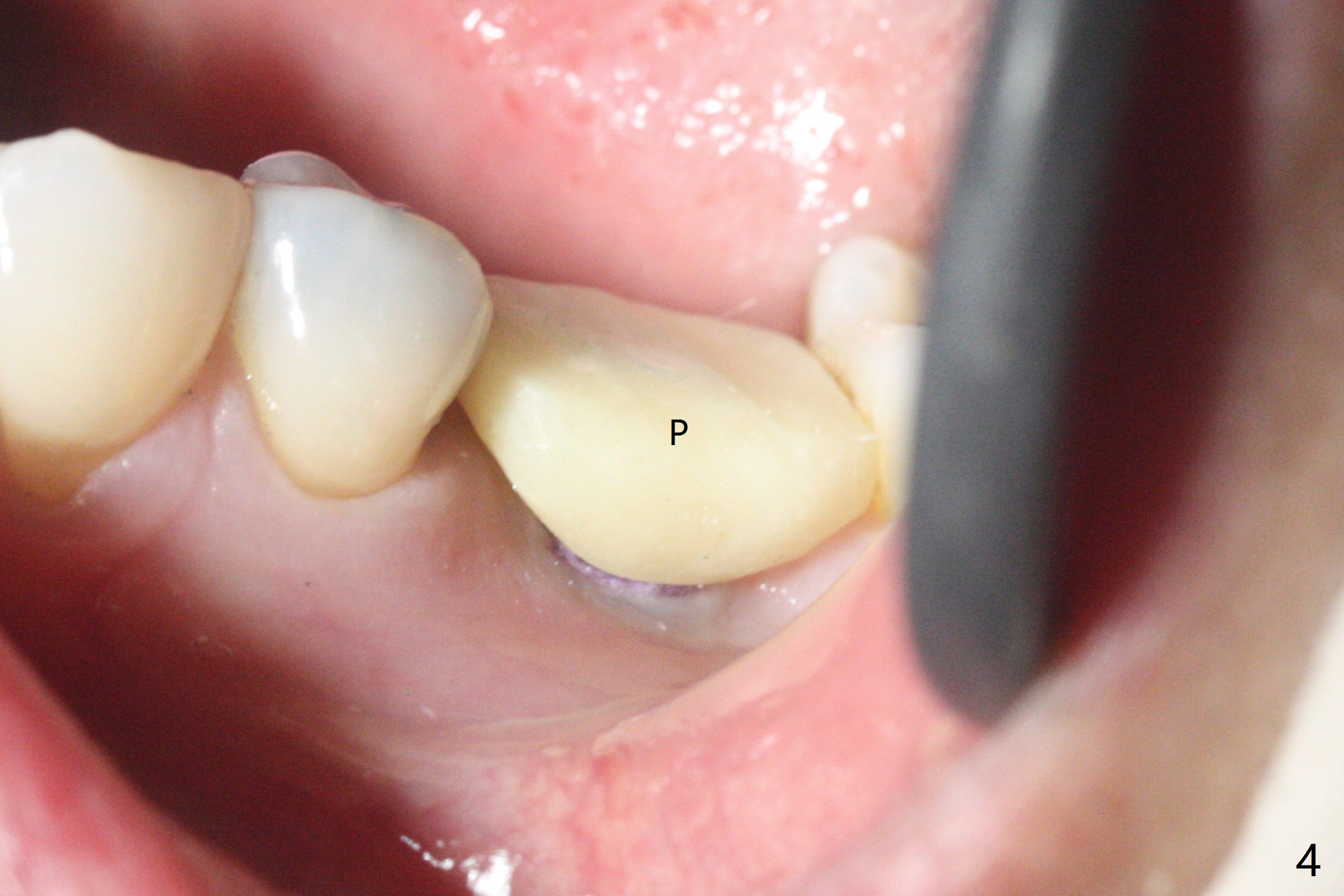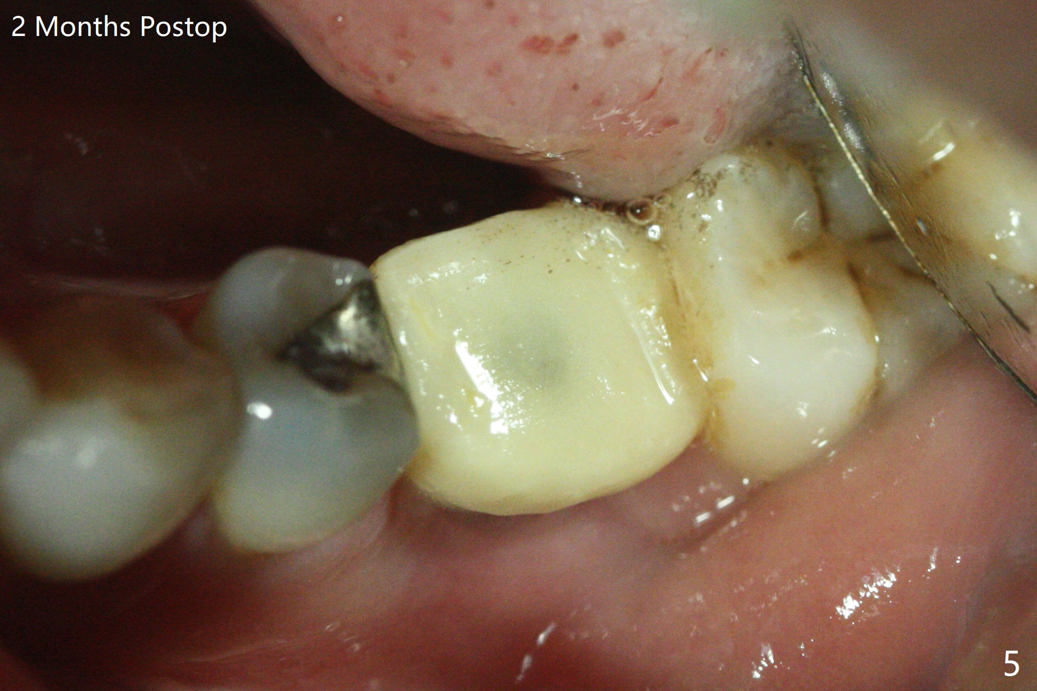 适当更改导板(为两段式接近圆柱状植体设计)钻洞顺序(根尖钻头小,而一段式植体根尖特别尖),5x14毫米一段式软组织水平植体植入,扭力大约35Ncm(图一),略微种深(图二:长箭头)后,磨短基台(与图一对比;左上6伸长),颊侧,远中,舌侧边缘降低(图二,三:<;增加基台高度,提高牙冠固位),制作临时牙冠(图四:P),主要目的将近中牙龈推向近中(图三:空箭头),暴露近中基台边缘,以后好取模。总之,一段式植体需要考虑临时修复。术后两个月临时牙冠和周围牙龈正常(图五)。术后4.5月轻度骨质吸收(图六),临床上看不出来螺纹将要暴露,取模。病人抱怨用临时牙冠咀嚼疼痛,不咬后没有不舒服,其实临时牙冠咬合面穿孔,牙龈正常,永久粘固剂没有外溢(图七)。术后4.5-6个月植体周围骨质吸收(图六,七)。牙槽嵴处钻洞应与植体直径一样才能减少骨质吸收。
