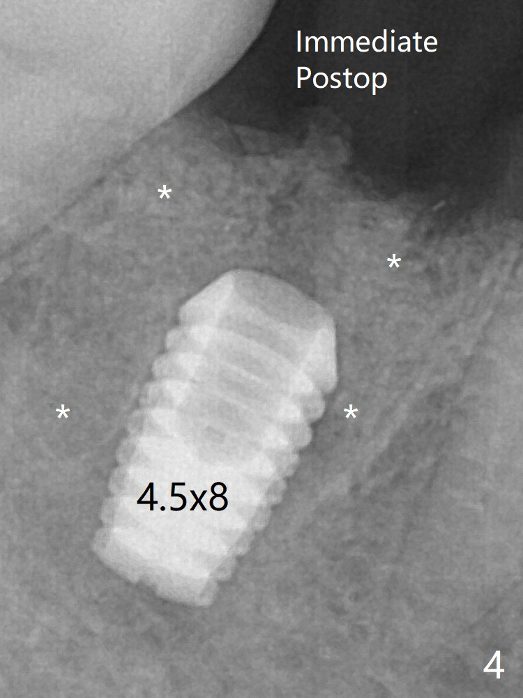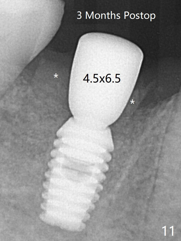 Following 4.5x11.5 mm drill, a 4.5x8 mm Bicon implant is pressed fit; its stability is lightly enhanced with placement of sticky bone in the remaining sockets (Fig.4 *) and around the black plug (Fig.5 P). The implant appears to remain covered by the bone 3 months postop (Fig.11 (* socket shield)). Cortical bone starts to form crestal 7 months postop (Fig.12 arrowheads, coronavirus).