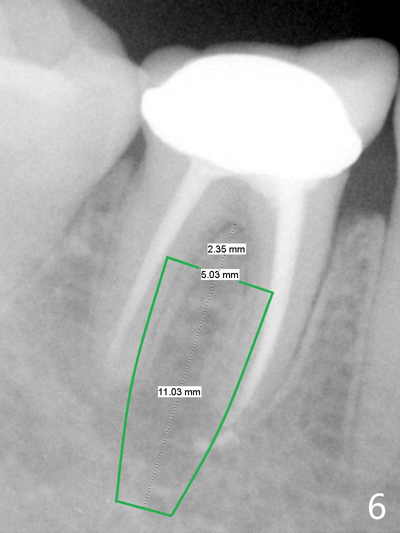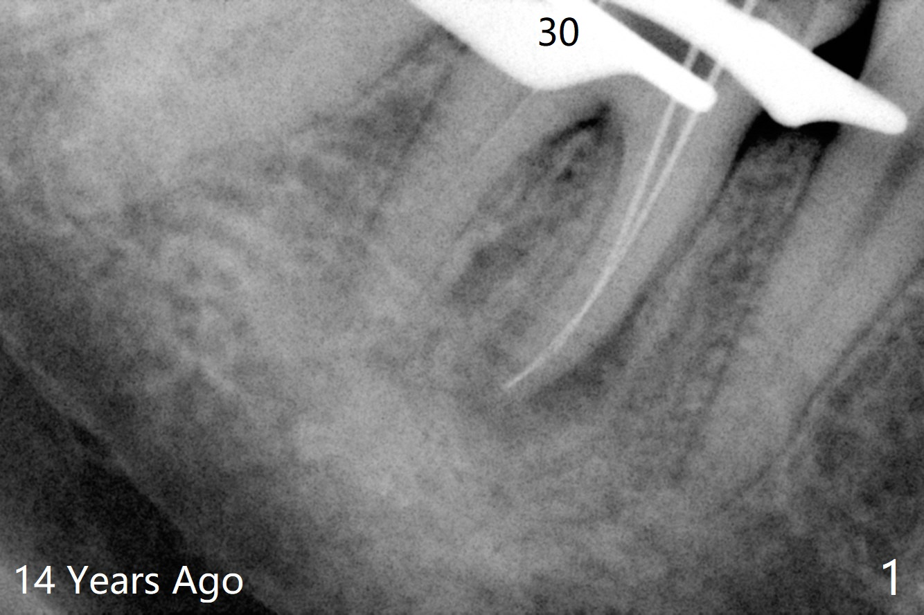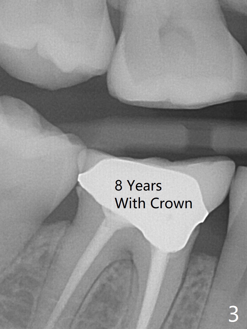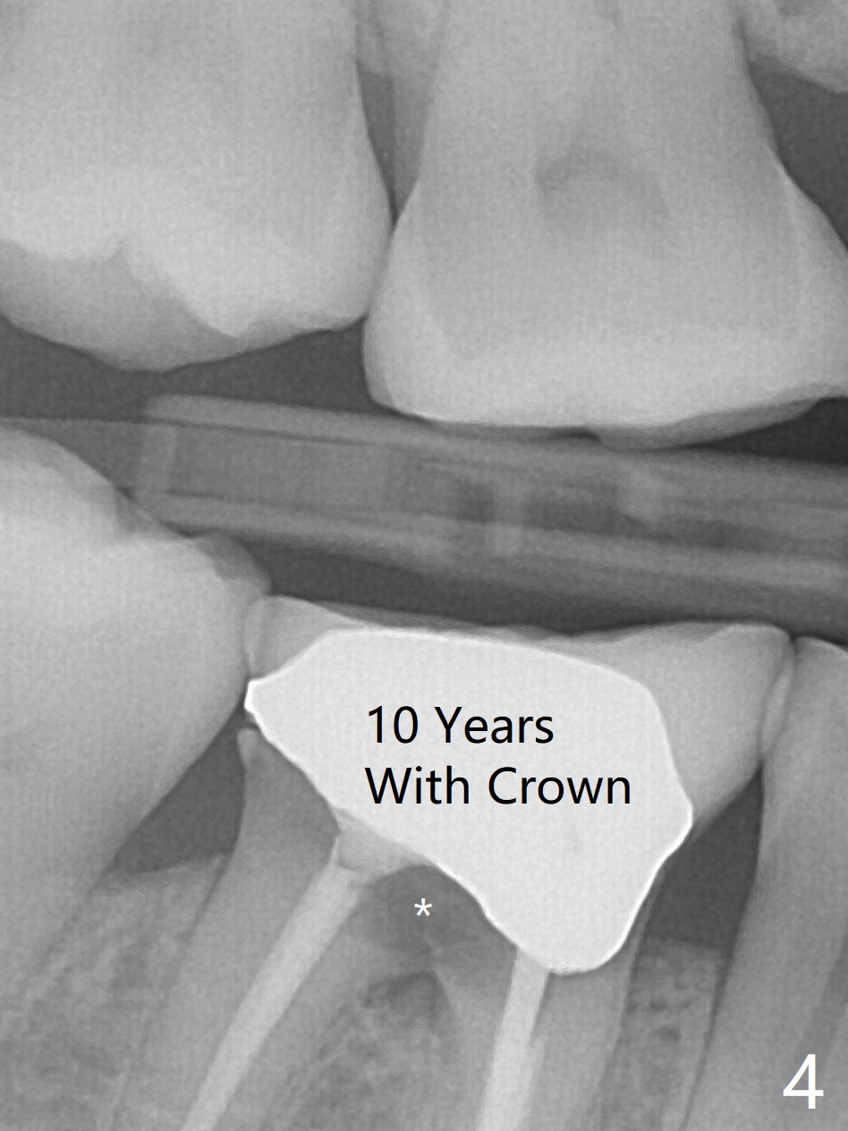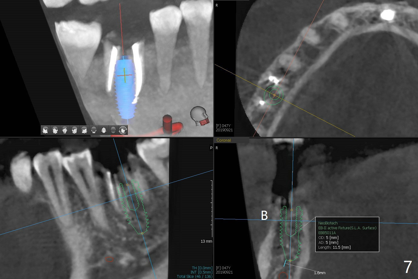 A 47-year-old woman with one carious tooth in her mouth (at #30) received RCT 14 years ago (Fig.1). The molar survives without crown for 3.5 years (Fig.2) and with crown for 8 years (Fig.3). The tooth has 2nd decays 10 years post crown (14 years post RCT, Fig.4 *). The crown dislodges 2 months later (Fig.5). Does the crown inadvertently reduce the longevity of the tooth simply hampering oral hygiene? After osteotomy until 4.5x10 or 13 mm IS drill with guide and 5 mm Bicon reamer free hand, place either 5x6 or 11 mm Bicon implant (Fig.6). Keep the black insertion plug to hold periodontal dressing or a provisional, which will be bonded to the neighboring tooth. Prepare PRFx1 for sticky bone around the not-so-stable implant. A 5x11.5 mm bone-level implant is planned by CT (Fig.7). Socket shield will be conducted to reduce buccal plate collapse. If the osteotomy depth is 10 mm due to limited mouth opening, place 4.5x6 mm Bicon implant. Otherwise 4.5x8 mm one. Return to Lower Molar Immediate Implant, Prevent Molar Periimplantitis (Protocols, Table), Trajectory II, Metronidazole Early Intervention Xin Wei, DDS, PhD, MS 1st edition 09/01/2019, last revision 11/10/2019
