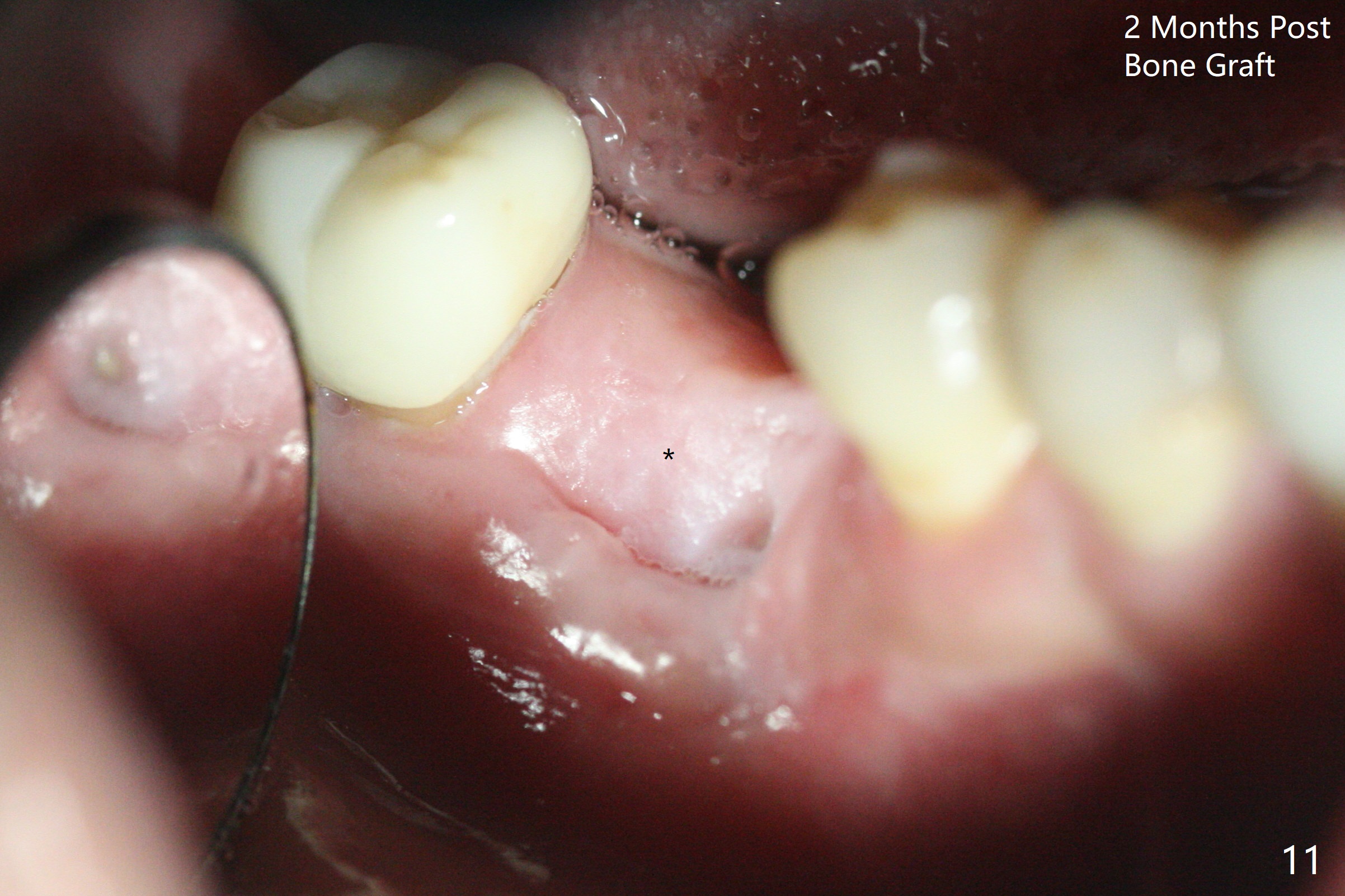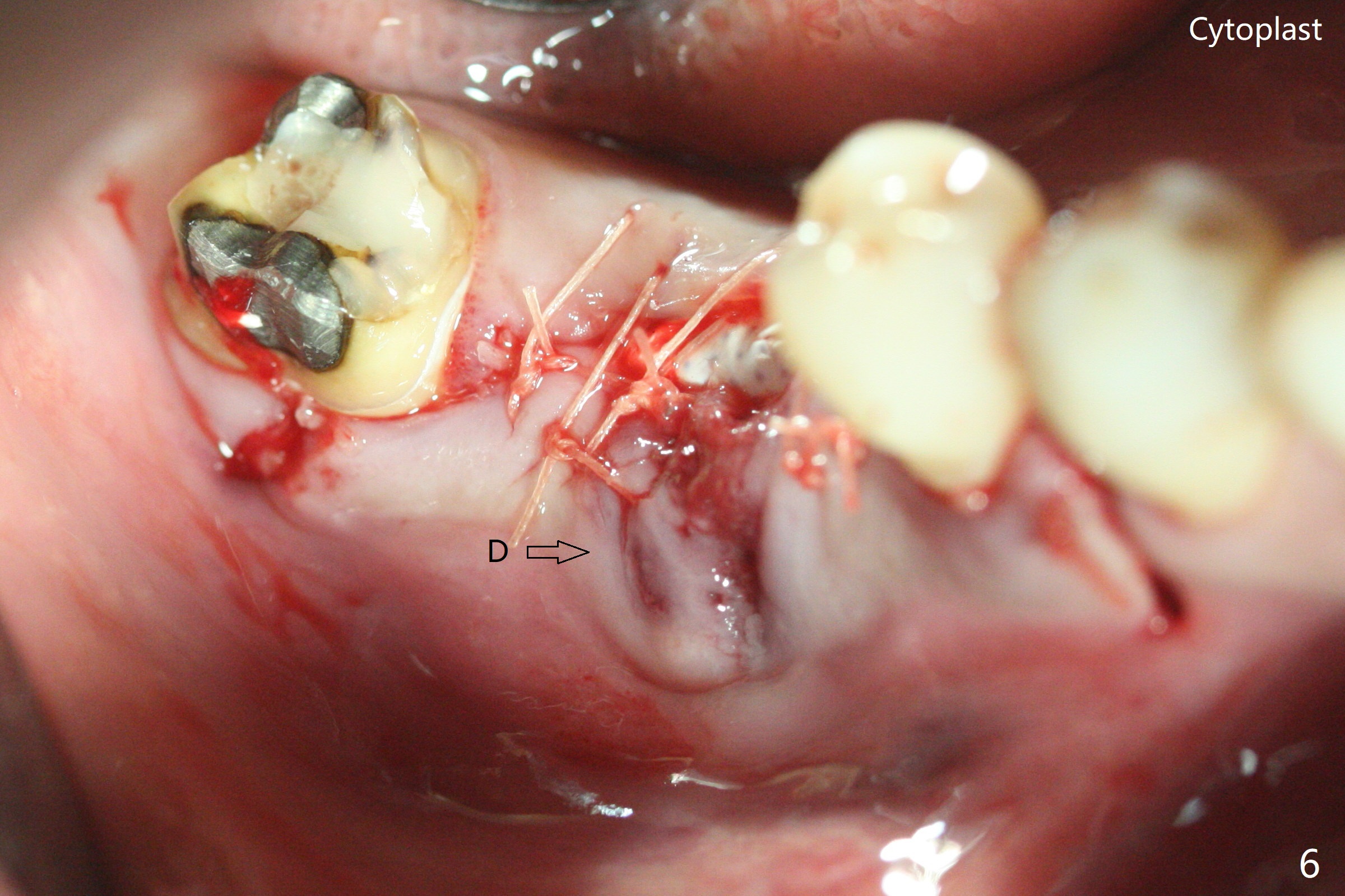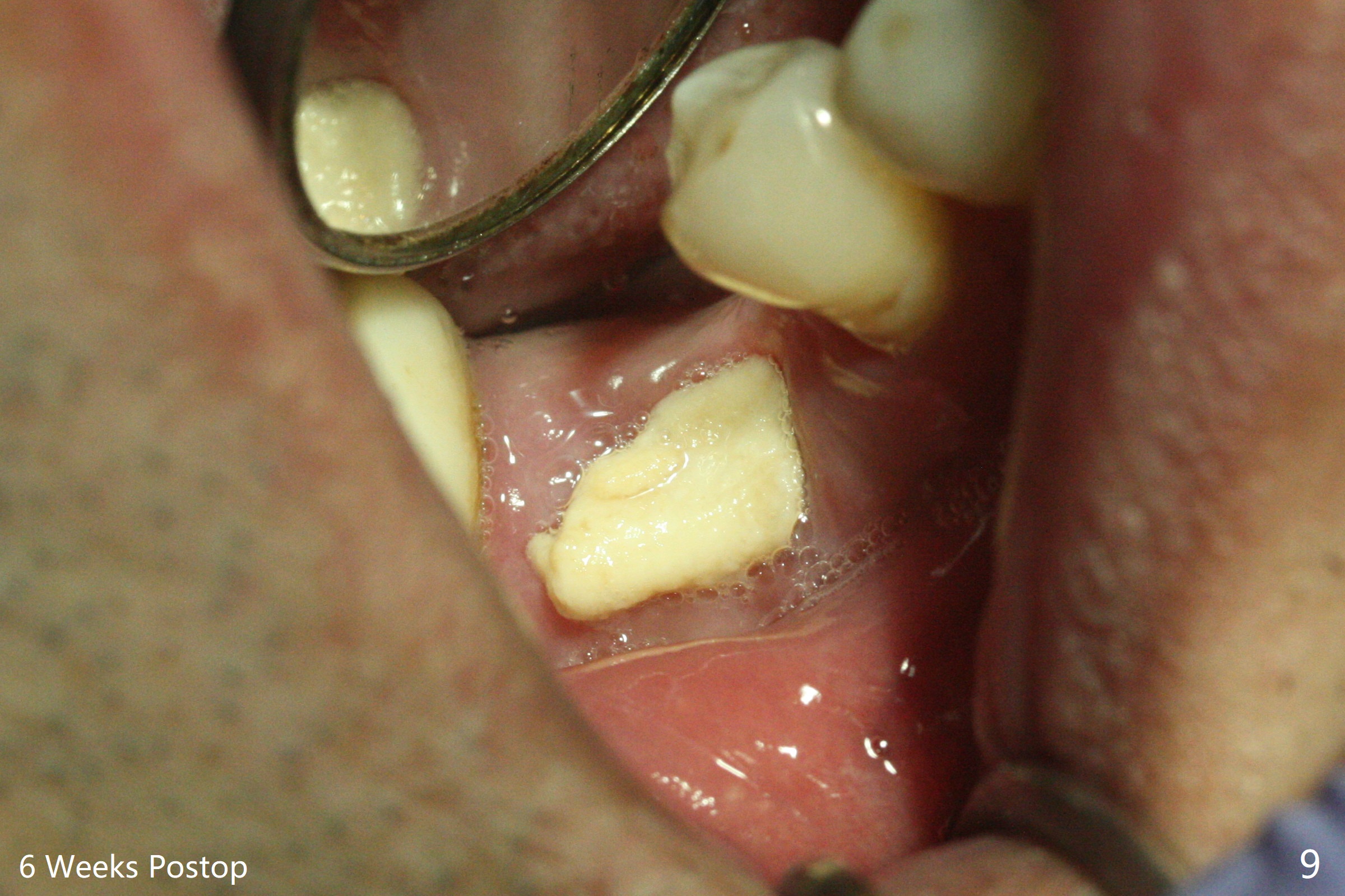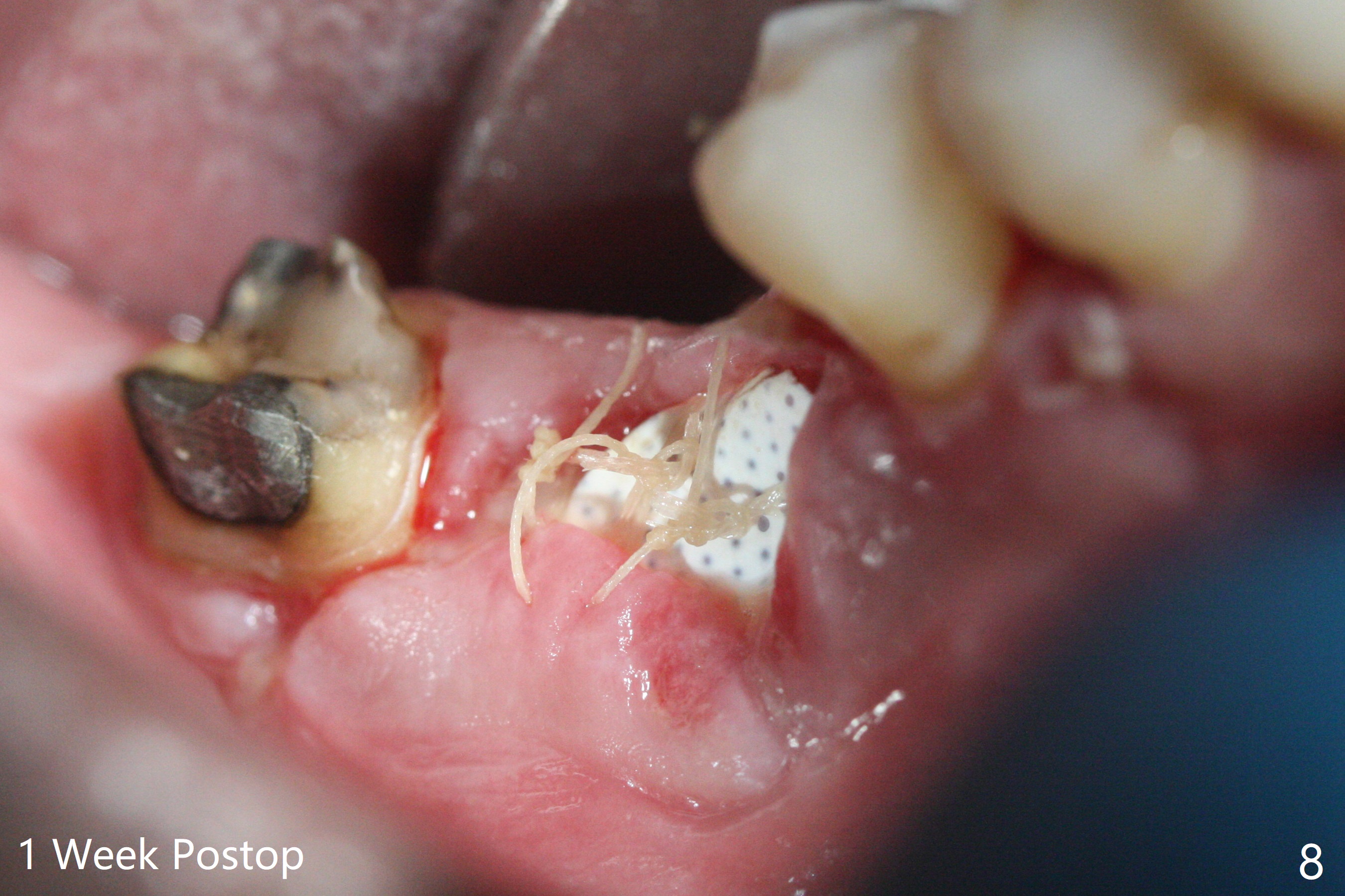 In spite of use of water pik, the coronal threads of the implant at #30 remain exposed 2 months postop (Fig.1). Envelop incision with mesial and distal accessory release ones reveals buccal bony defect (Fig.2). After 2nd spin (1500 RPM for 10 minutes), PRF forms in the red tube (Fig.3 yellow gel-like). Following use of Titanium brush, sticky bone is place (not so bone block-like, Fig.4), followed by a large piece of PRF membrane (from the red tube of Fig.3), Cytoplast (Fig.5,6 white porous) and a small piece of PRF membrane (from the white tube, next to the thin gingiva). The distal (Fig.6 D) and mesial (Fig.7 M) flaps are approximated (arrows without suture) as much as possible as well as lingual. 4-0 Polyglycolic Acid suture is used. Periodontal dressing dislodges 5 days postop. When the patient returns 1 week postop, he is pain free. Although Cytoplast is exposed, the surrounding gingiva seems to be healthy (Fig.8). Later the permanent crown of #31 is temporarily cemented with OHI. It appears that Cytoplast could be used to cover PRF membranes for soft tissue defect, followed by immediate provisional at the stage of immediate implant. The discolored (apparently contaminated) Cytoplast seems to be expelled 6 weeks postop (Fig.9). When the latter is removed, the soft tissue looks normal (Fig.10). Two weeks later, the apparently normal, but thin gingiva forms over the former granulation tissue (Fig.11 *, as compared to Fig.10). There is not enough bone coronal to the implant plateau 2 months post graft (Fig.12). Three months later, bone graft will be re-placed possibly with uncover.