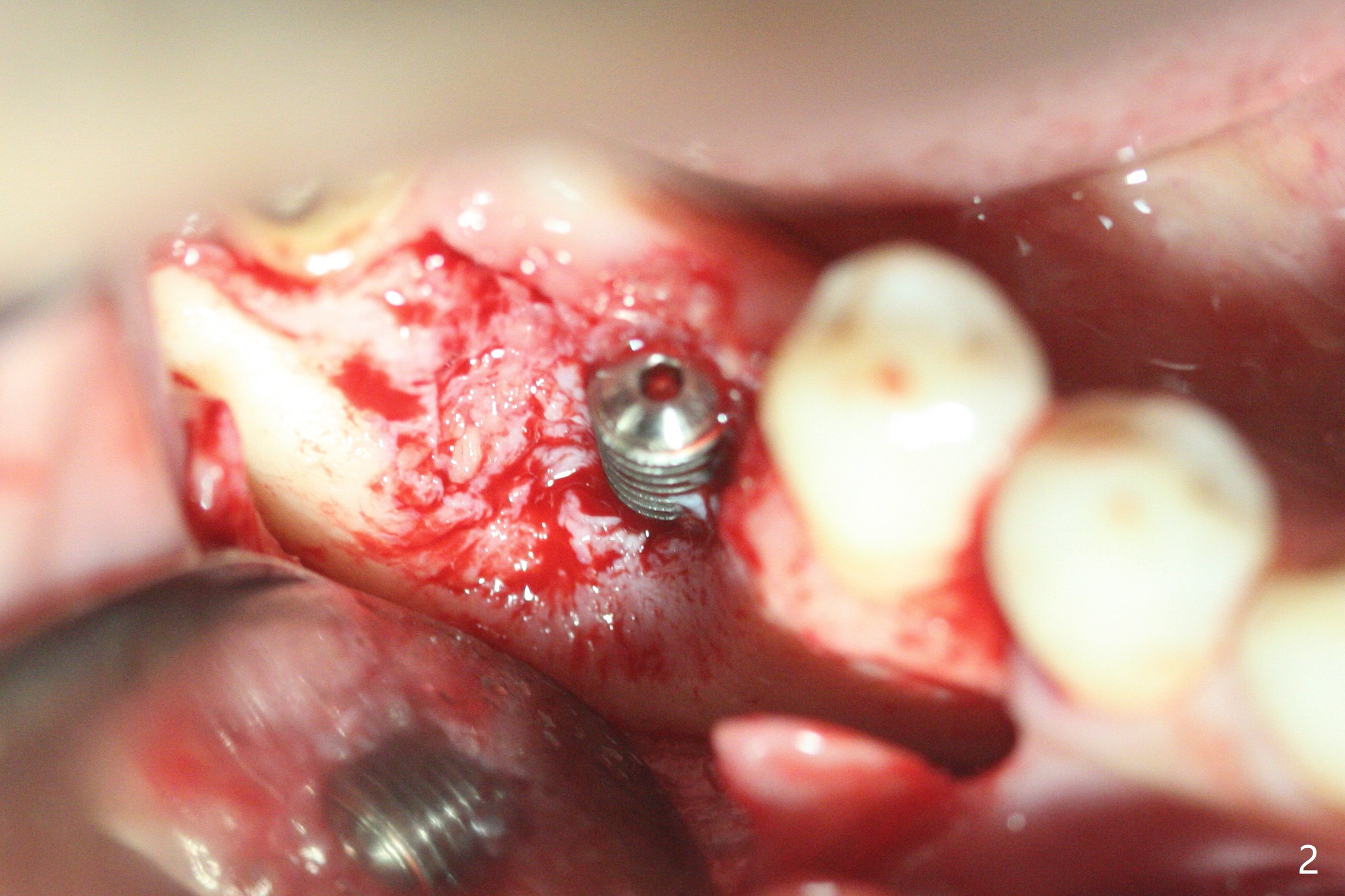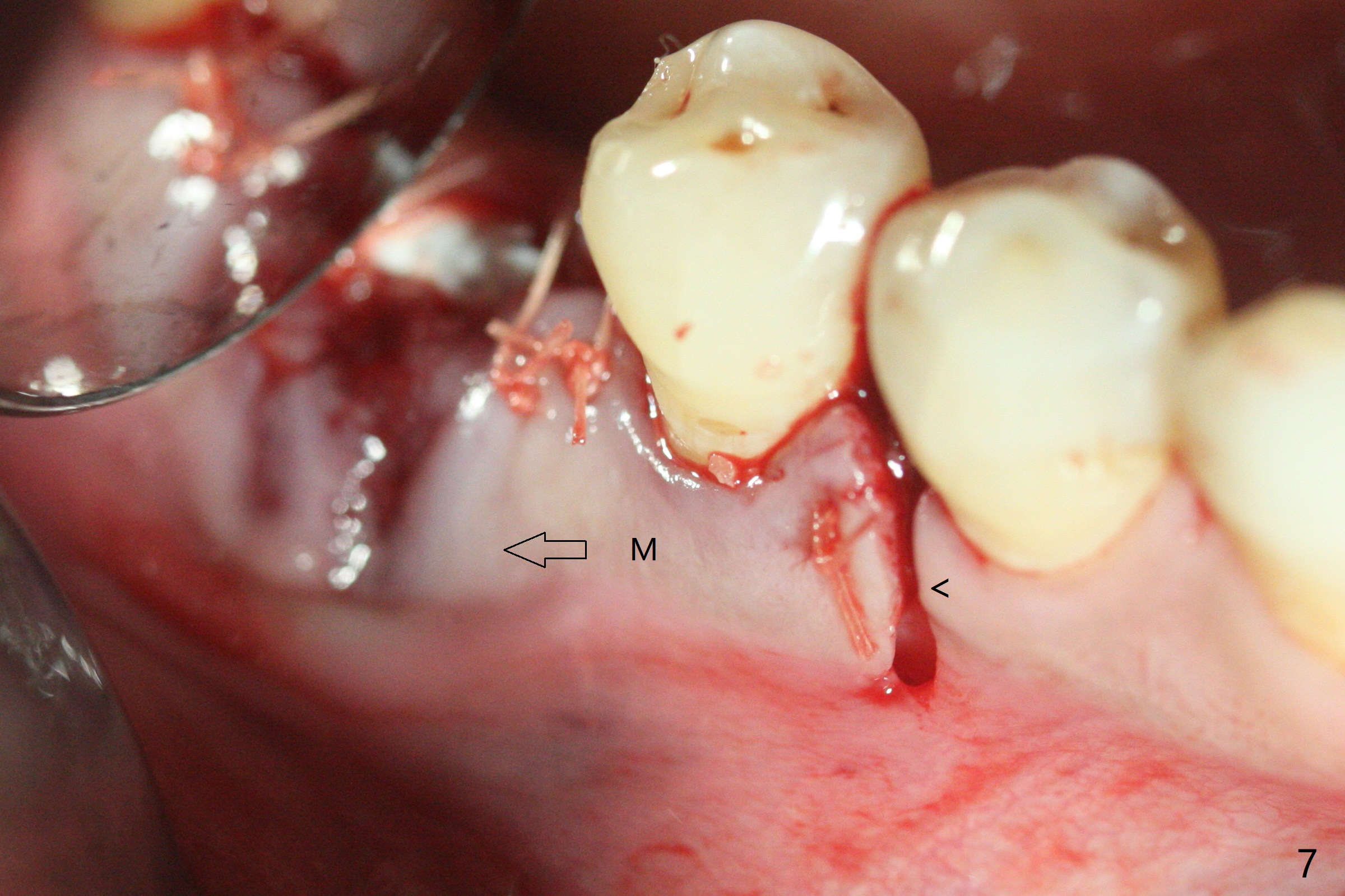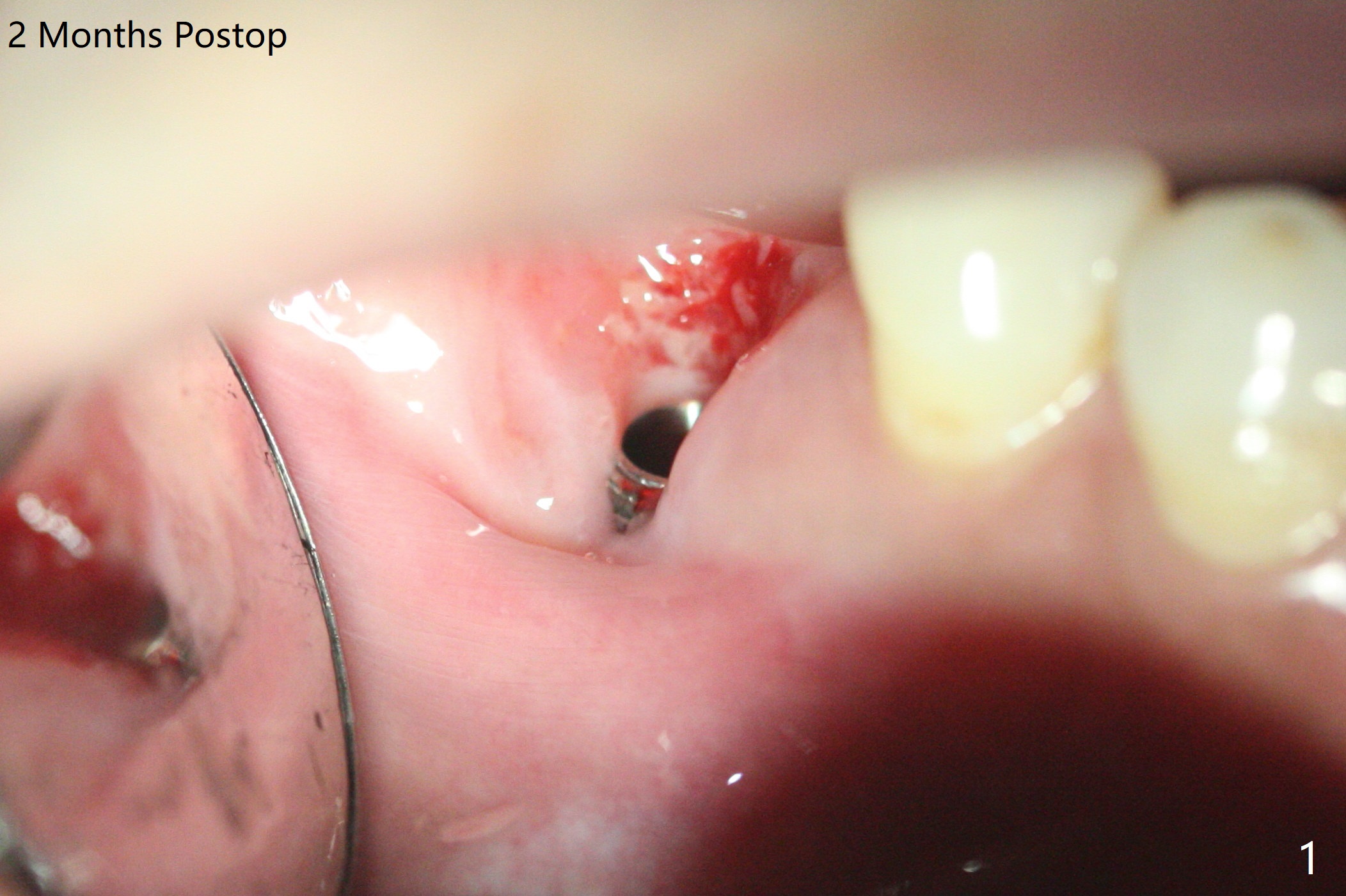In spite of use of water pik, the coronal threads of the implant at #30 remain exposed 2 months postop (Fig.1). Envelop incision with mesial and distal accessory release ones reveals buccal bony defect (Fig.2). After 2nd spin (1500 RPM for 10 minutes), PRF forms in the red tube (Fig.3 yellow gel-like). Following use of Titanium brush, sticky bone is place (not so bone block-like, Fig.4), followed by a large piece of PRF membrane (from the red tube of Fig.3), Cytoplast (Fig.5,6 white porous) and a small piece of PRF membrane (from the white tube, next to the thin gingiva). The distal (Fig.6 D) and mesial (Fig.7 M) flaps are approximated (arrows without suture) as much as possible as well as lingual. 4-0 Polyglycolic Acid suture is used. Periodontal dressing dislodges 5 days postop. When the patient returns 1 week postop, he is pain free. Although Cytoplast is exposed, the surrounding gingiva seems to be healthy (Fig.8). Later the permanent crown of #31 is temporarily cemented with OHI. It appears that Cytoplast could be used to cover PRF membranes for soft tissue defect, followed by immediate provisional at the stage of immediate implant. The discolored (apparently contaminated) Cytoplast seems to be expelled 6 weeks postop (Fig.9). When the latter is removed, the soft tissue looks normal (Fig.10). Two weeks later, the apparently normal, but thin gingiva forms over the former granulation tissue (Fig.11 *, as compared to Fig.10). There is not enough bone coronal to the implant plateau 2 months post graft (Fig.12). Three months later, bone graft will be re-placed possibly with uncover.