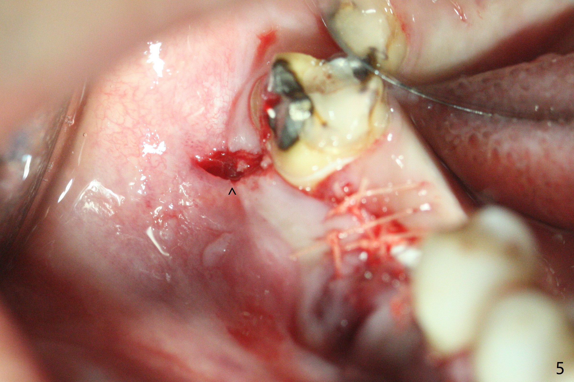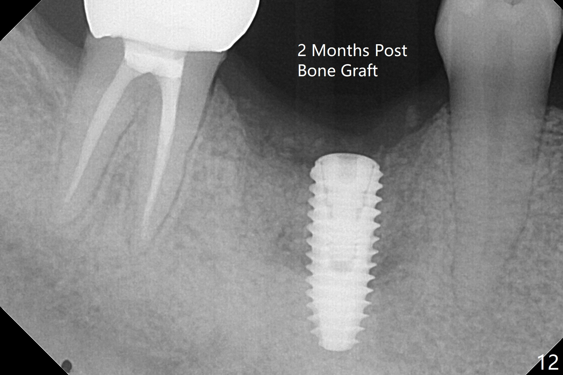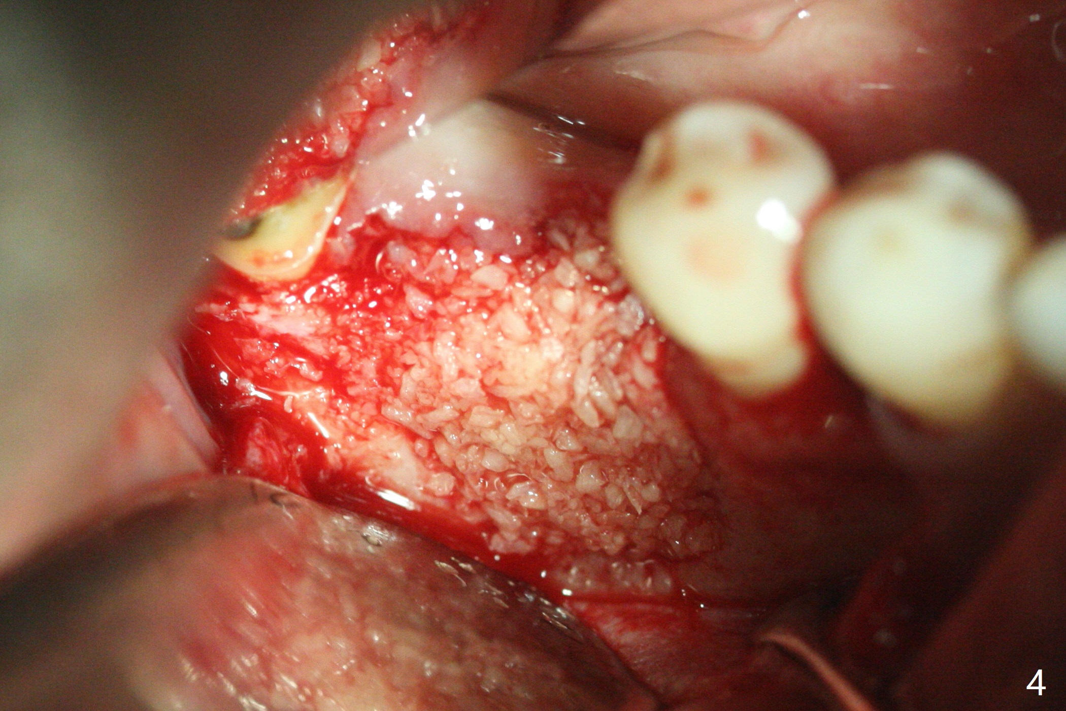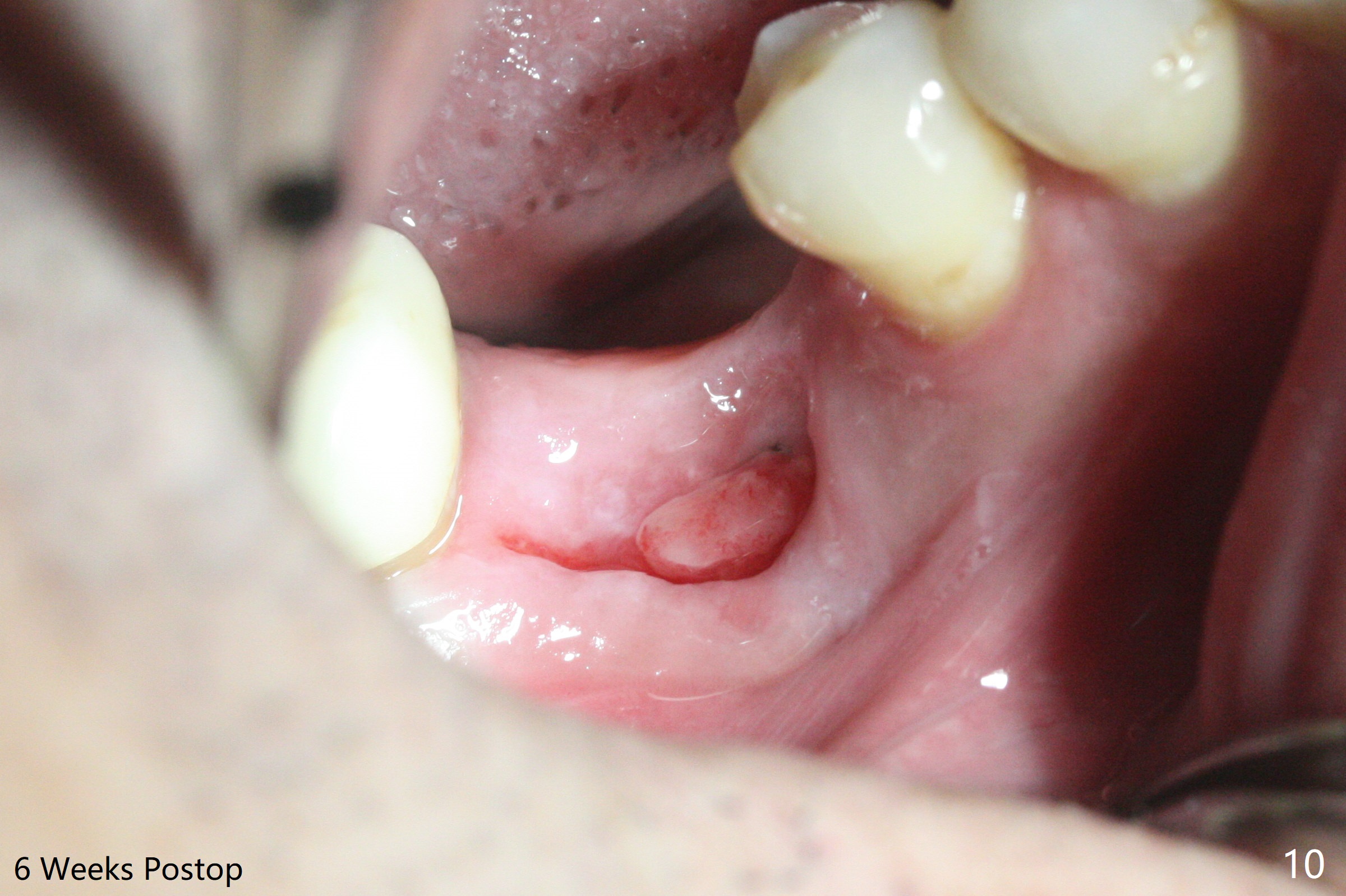 In spite of use of water pik, the coronal threads of the implant at #30 remain exposed 2 months postop (Fig.1). Envelop incision with mesial and distal accessory release ones reveals buccal bony defect (Fig.2). After 2nd spin (1500 RPM for 10 minutes), PRF forms in the red tube (Fig.3 yellow gel-like). Following use of Titanium brush, sticky bone is place (not so bone block-like, Fig.4), followed by a large piece of PRF membrane (from the red tube of Fig.3), Cytoplast (Fig.5,6 white porous) and a small piece of PRF membrane (from the white tube, next to the thin gingiva). The distal (Fig.6 D) and mesial (Fig.7 M) flaps are approximated (arrows without suture) as much as possible as well as lingual. 4-0 Polyglycolic Acid suture is used. Periodontal dressing dislodges 5 days postop. When the patient returns 1 week postop, he is pain free. Although Cytoplast is exposed, the surrounding gingiva seems to be healthy (Fig.8). Later the permanent crown of #31 is temporarily cemented with OHI. It appears that Cytoplast could be used to cover PRF membranes for soft tissue defect, followed by immediate provisional at the stage of immediate implant. The discolored (apparently contaminated) Cytoplast seems to be expelled 6 weeks postop (Fig.9). When the latter is removed, the soft tissue looks normal (Fig.10). Two weeks later, the apparently normal, but thin gingiva forms over the former granulation tissue (Fig.11 *, as compared to Fig.10). There is not enough bone coronal to the implant plateau 2 months post graft (Fig.12). Three months later, bone graft will be re-placed possibly with uncover.