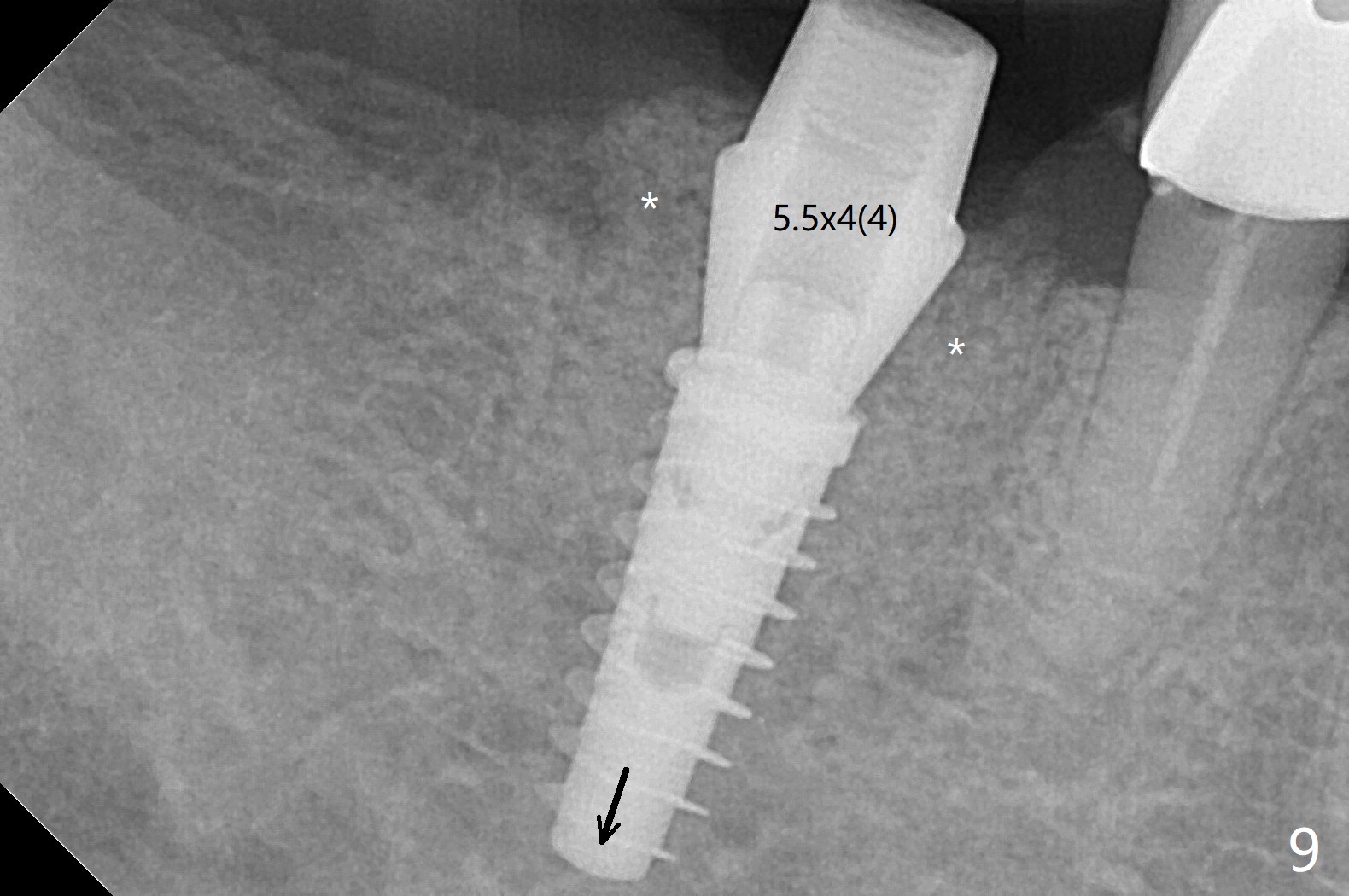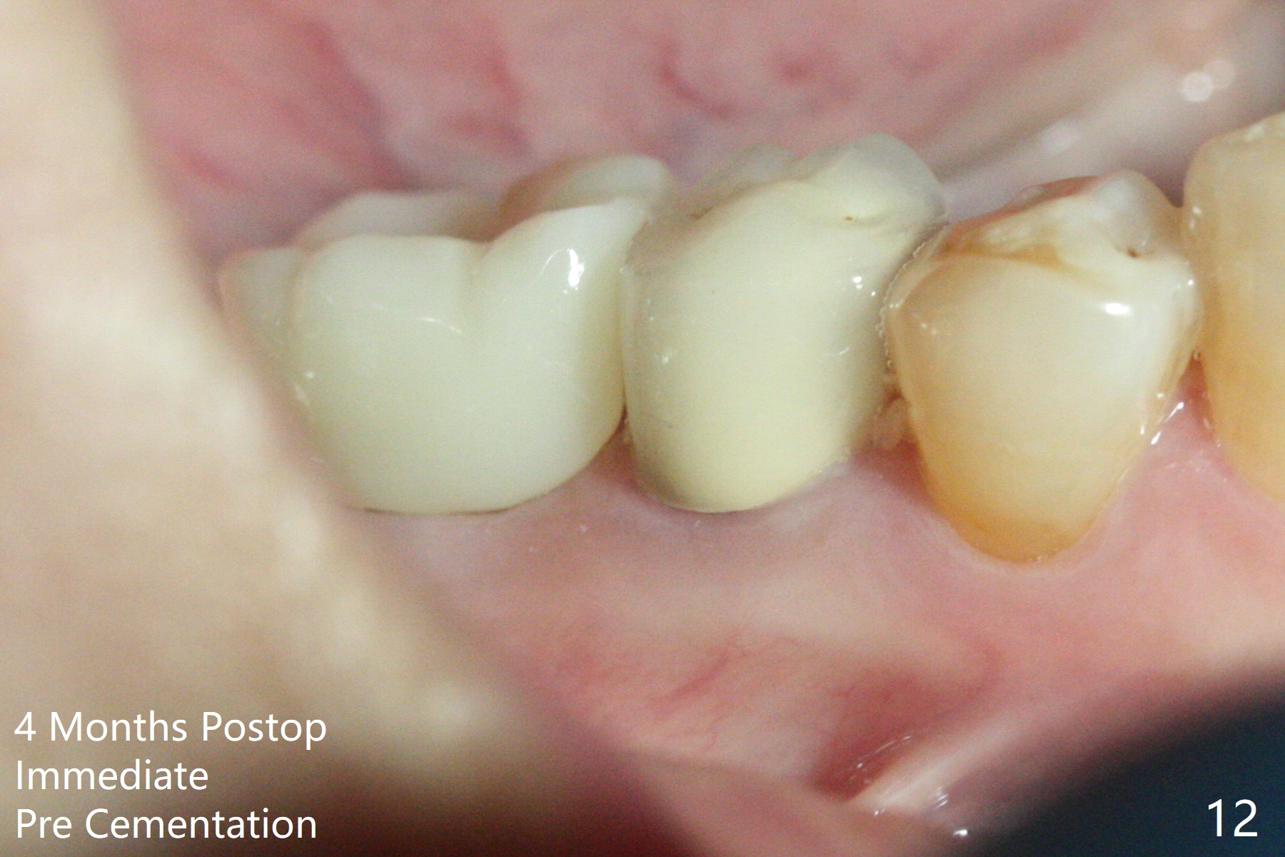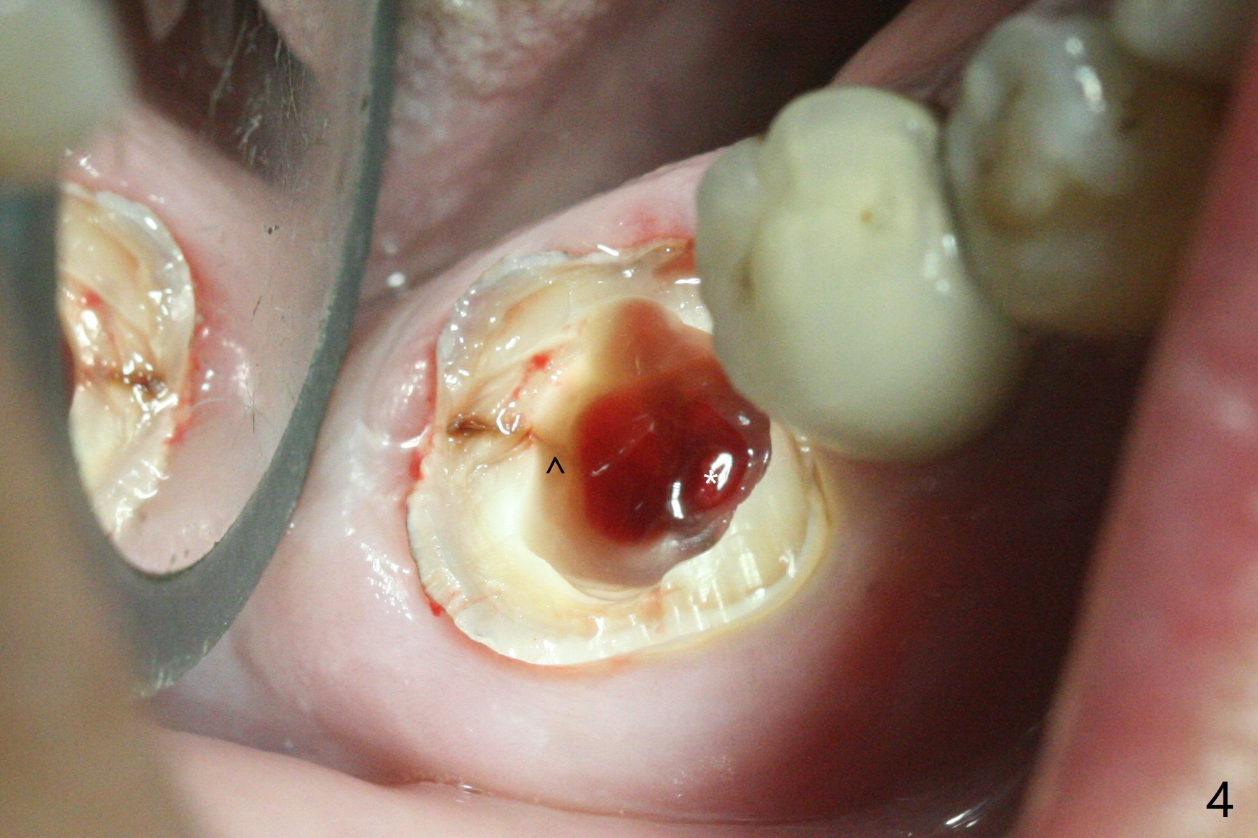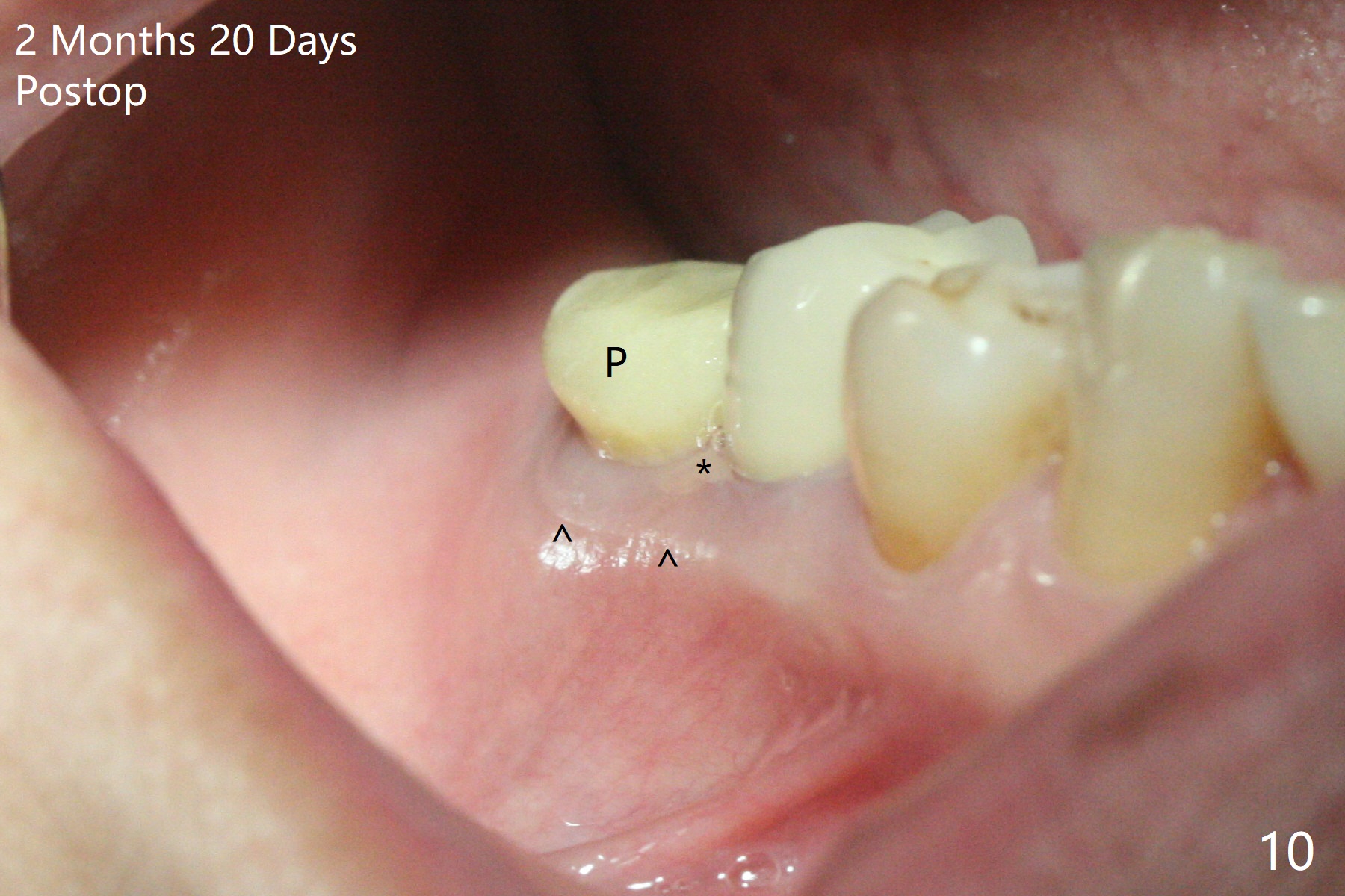 A 59-year-old woman with severe pain and mobility at #30 returns to clinic for extraction and implant on emergency basis (Fig.1 ^: crazing line). To prevent osteotomy deviation off the septum, the crown is sectioned (Fig.2) and the coronal end of the septum is exposed. In fact the initial osteotomy is blind (Fig.3). After increasing the access (Fig.4), trying to change trajectory and increasing the depth and diameter of the osteotomy, the trajectory deviates to the distal socket (Fig.5). Following root extraction, debridement of the sockets and minor trajectory change, a 4x11 mm dummy implant is placed (Fig.6). With a drastic change in osteotomy, the dummy implant position is somewhat acceptable with a 5.2x4 mm planning abutment (Fig.7 P). After placement of bone graft around the 4.5x11 mm final implant to enhance stability, a 5.5x4(3) mm definitive abutment is placed in a restorable position (Fig.8). The implant turns while the abutment screw is hand tightened. Since there is an apical space (Fig.8 <), the implant is then placed ~ 1mm deeper with ~ 30 Ncm (Fig.9). A longer cuffed abutment is inserted and more bone graft is placed (*). In summary, roots in the sockets do not seem to help free hand osteotomy in the lower 1st molar. It is also difficult to control pain during acute infection. Block anesthesia has to be administered, increasing the chance of nerve injury. Either guided surgery or delayed implant should be conducted. There is no postop paresthesia, although the buccal gingiva is slightly erythematou, edematous and tender 1 week posotp. Oral Amoxicillin is prescribed for one more week. The keratinized gingiva (Fig.10 ^) and the papilla (*) are maintained in place around the immediate provisional (P) 2 months 20 days postop. The soft tissue remains normal 4 months postop (Fig.11) and immediate pre cementation (Fig.12).