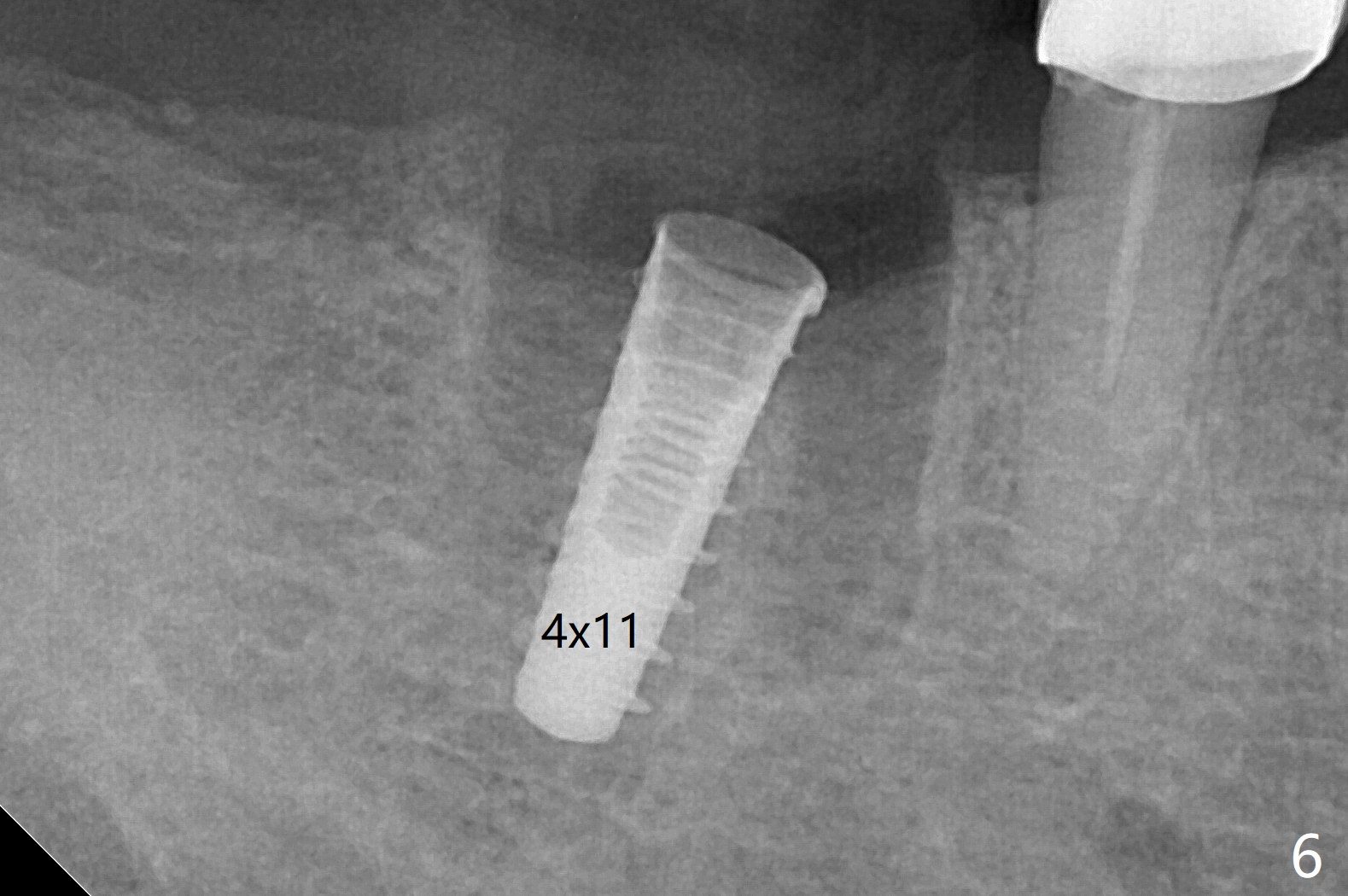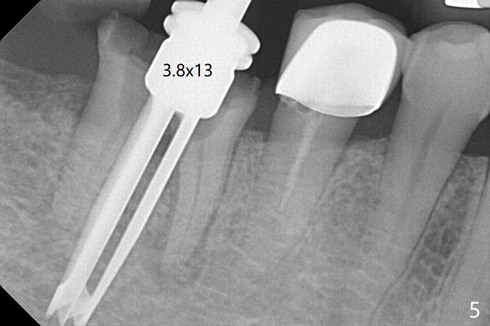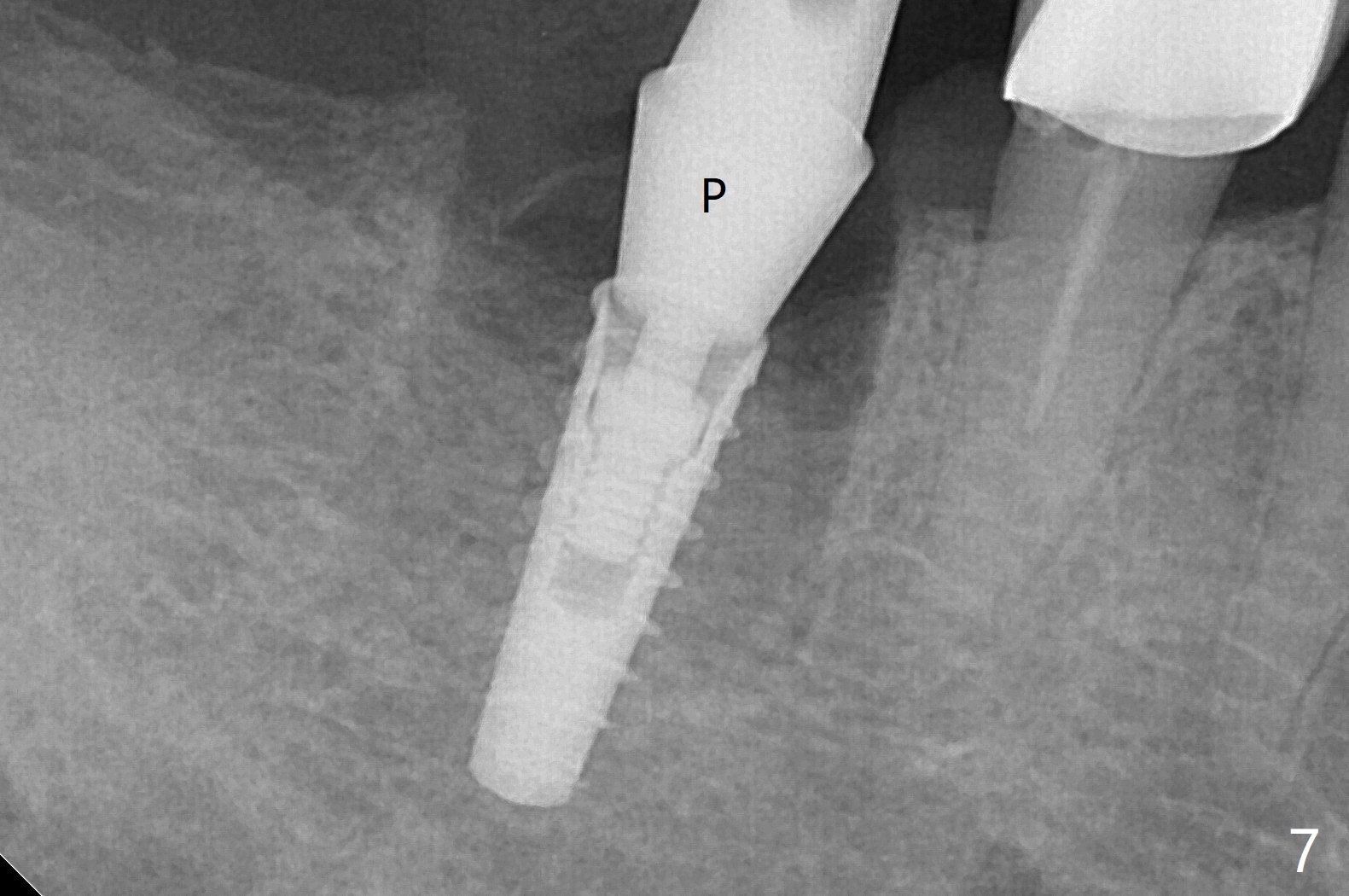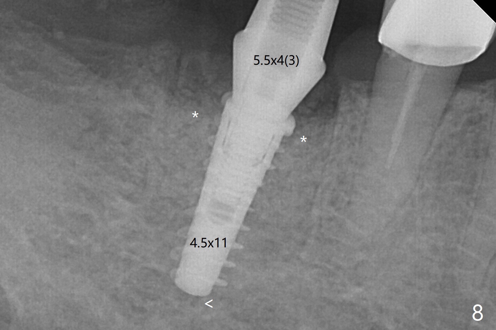 A 59-year-old woman with severe pain and mobility at #30 returns to clinic for extraction and implant on emergency basis (Fig.1 ^: crazing line). To prevent osteotomy deviation off the septum, the crown is sectioned (Fig.2) and the coronal end of the septum is exposed. In fact the initial osteotomy is blind (Fig.3). After increasing the access (Fig.4), trying to change trajectory and increasing the depth and diameter of the osteotomy, the trajectory deviates to the distal socket (Fig.5). Following root extraction, debridement of the sockets and minor trajectory change, a 4x11 mm dummy implant is placed (Fig.6). With a drastic change in osteotomy, the dummy implant position is somewhat acceptable with a 5.2x4 mm planning abutment (Fig.7 P). After placement of bone graft around the 4.5x11 mm final implant to enhance stability, a 5.5x4(3) mm definitive abutment is placed in a restorable position (Fig.8). The implant turns while the abutment screw is hand tightened. Since there is an apical space (Fig.8 <), the implant is then placed ~ 1mm deeper with ~ 30 Ncm (Fig.9). A longer cuffed abutment is inserted and more bone graft is placed (*). In summary, roots in the sockets do not seem to help free hand osteotomy in the lower 1st molar. It is also difficult to control pain during acute infection. Block anesthesia has to be administered, increasing the chance of nerve injury. Either guided surgery or delayed implant should be conducted. There is no postop paresthesia, although the buccal gingiva is slightly erythematou, edematous and tender 1 week posotp. Oral Amoxicillin is prescribed for one more week. The keratinized gingiva (Fig.10 ^) and the papilla (*) are maintained in place around the immediate provisional (P) 2 months 20 days postop. The soft tissue remains normal 4 months postop (Fig.11) and immediate pre cementation (Fig.12).