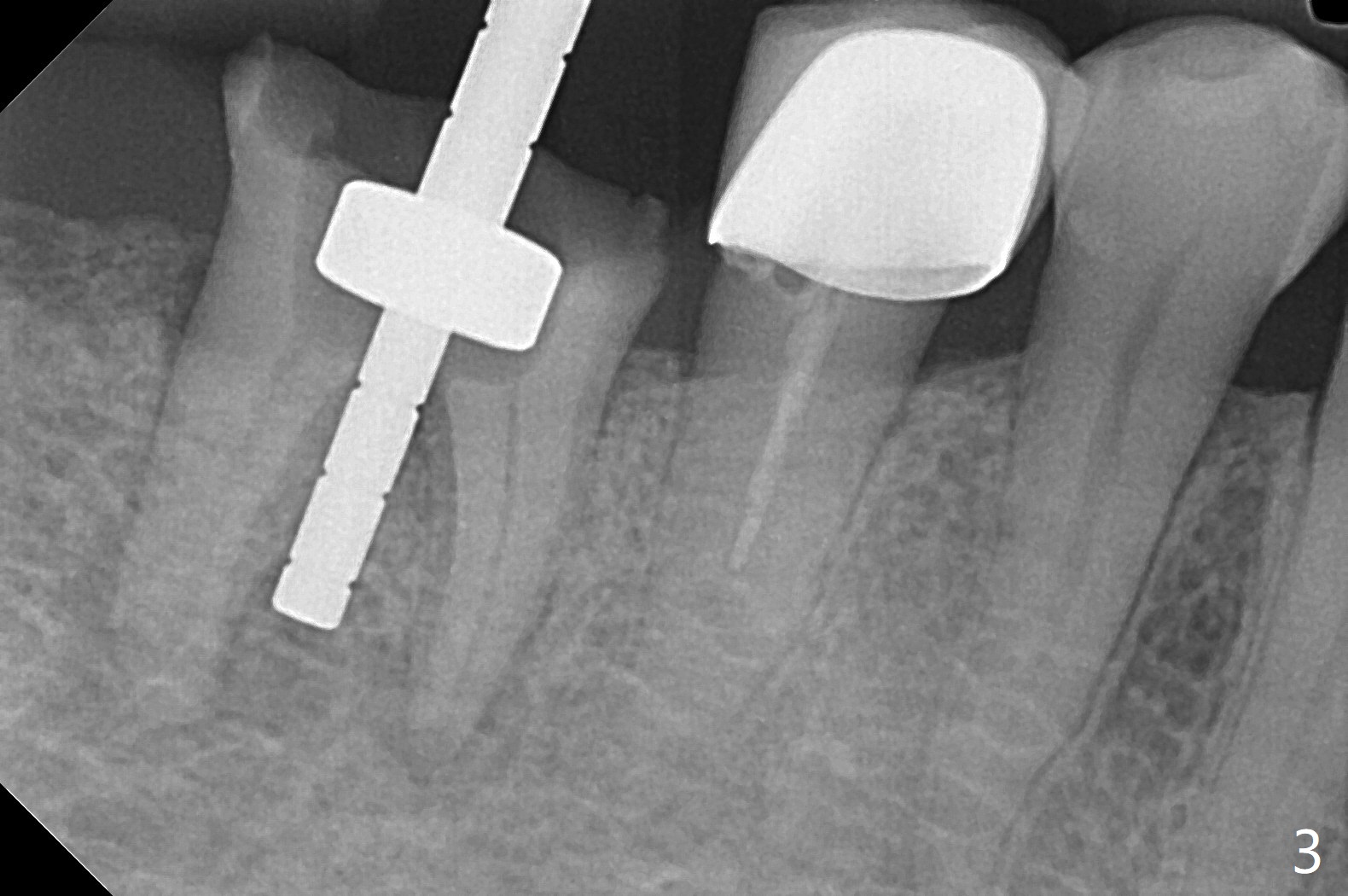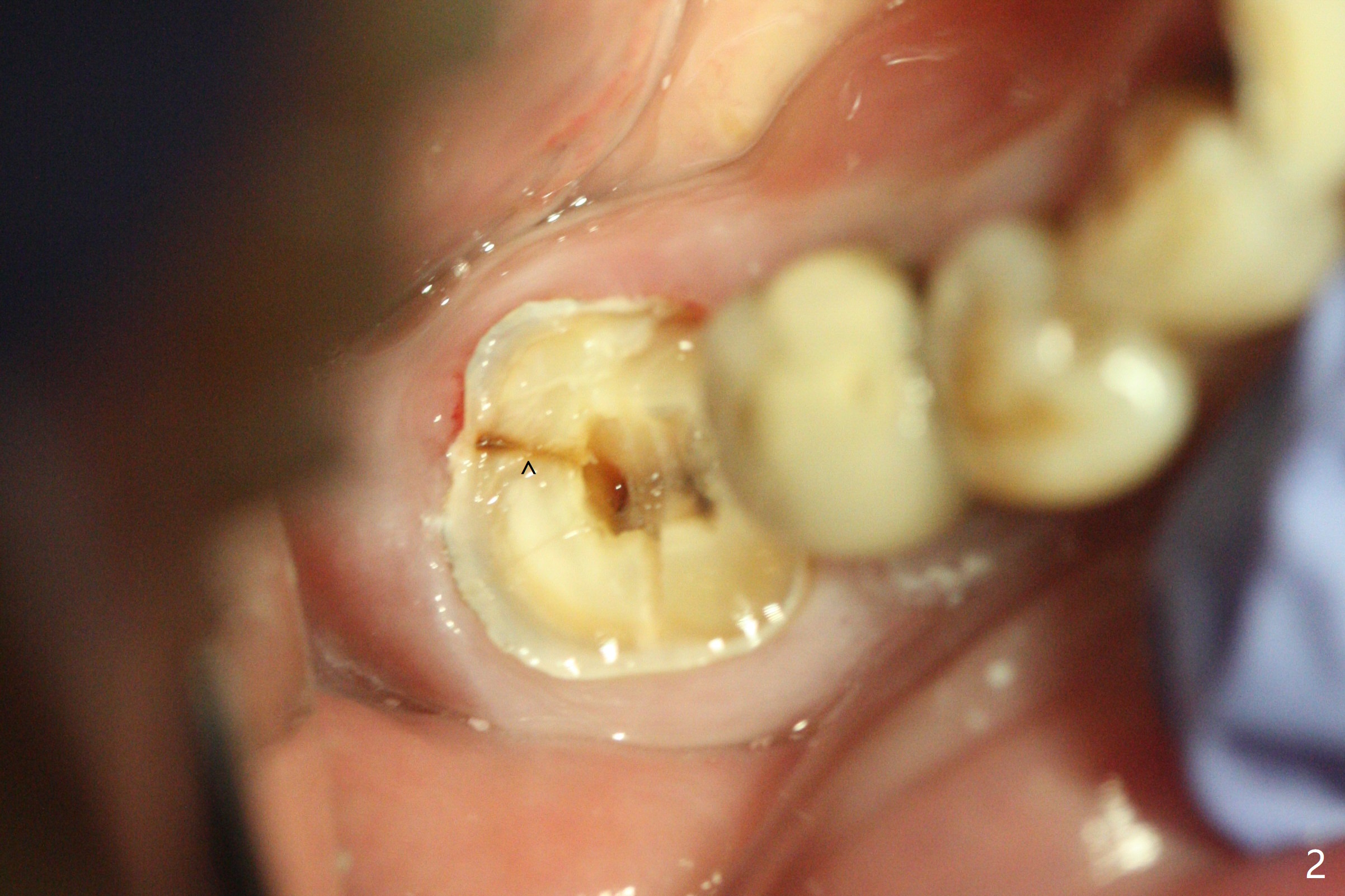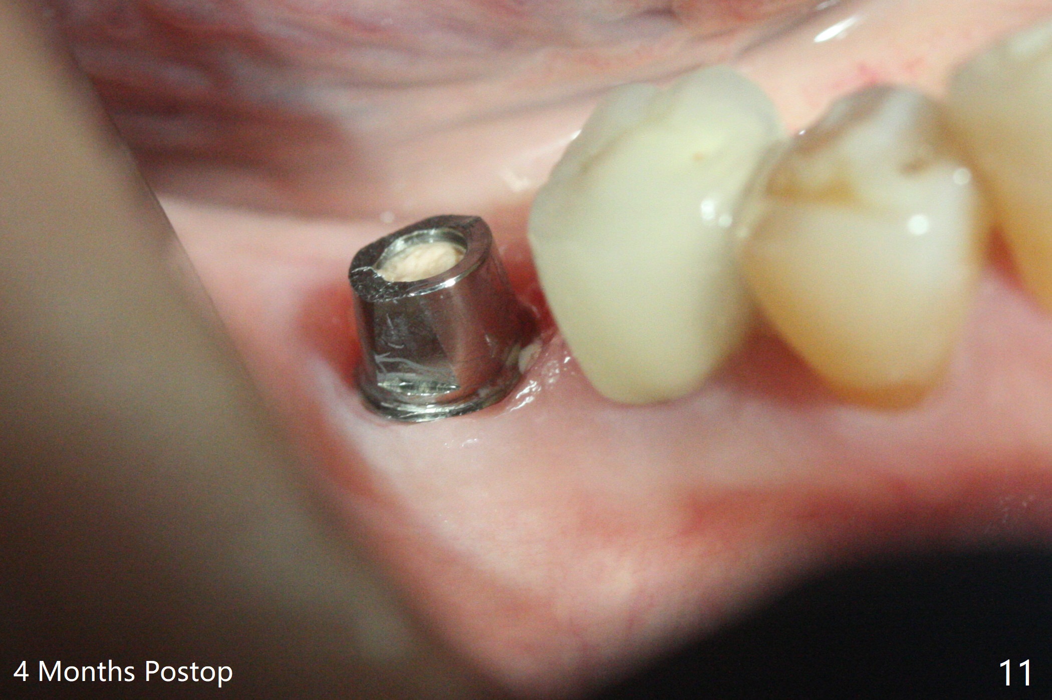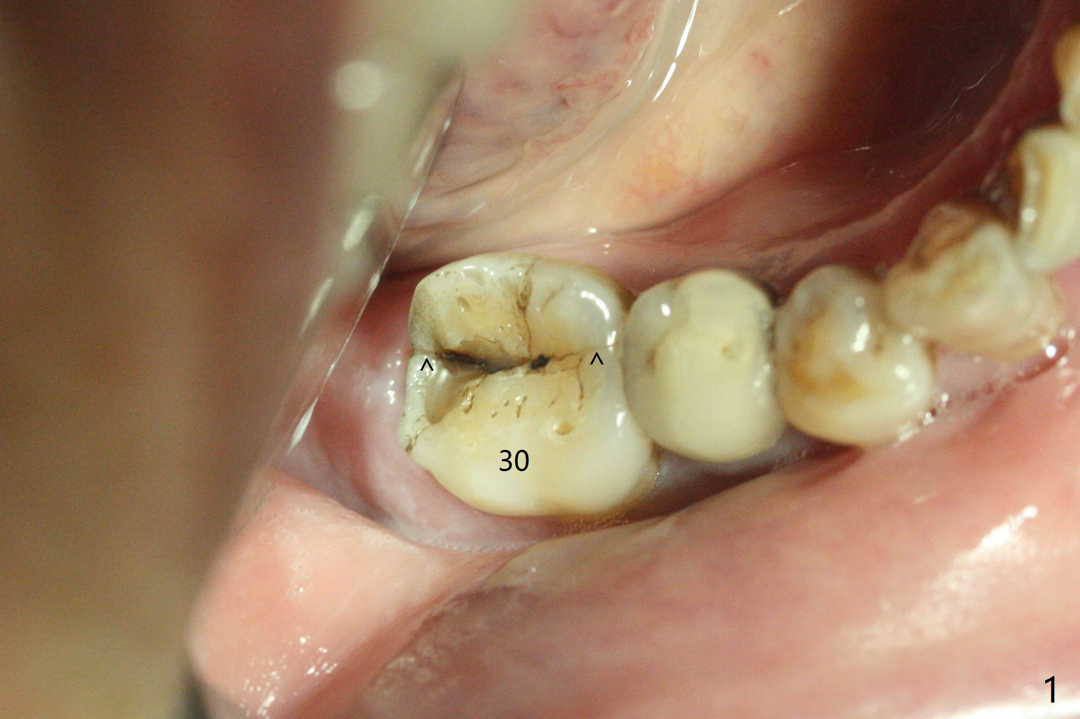 A 59-year-old woman with severe pain and mobility at #30 returns to clinic for extraction and implant on emergency basis (Fig.1 ^: crazing line). To prevent osteotomy deviation off the septum, the crown is sectioned (Fig.2) and the coronal end of the septum is exposed. In fact the initial osteotomy is blind (Fig.3). After increasing the access (Fig.4), trying to change trajectory and increasing the depth and diameter of the osteotomy, the trajectory deviates to the distal socket (Fig.5). Following root extraction, debridement of the sockets and minor trajectory change, a 4x11 mm dummy implant is placed (Fig.6). With a drastic change in osteotomy, the dummy implant position is somewhat acceptable with a 5.2x4 mm planning abutment (Fig.7 P). After placement of bone graft around the 4.5x11 mm final implant to enhance stability, a 5.5x4(3) mm definitive abutment is placed in a restorable position (Fig.8). The implant turns while the abutment screw is hand tightened. Since there is an apical space (Fig.8 <), the implant is then placed ~ 1mm deeper with ~ 30 Ncm (Fig.9). A longer cuffed abutment is inserted and more bone graft is placed (*). In summary, roots in the sockets do not seem to help free hand osteotomy in the lower 1st molar. It is also difficult to control pain during acute infection. Block anesthesia has to be administered, increasing the chance of nerve injury. Either guided surgery or delayed implant should be conducted. There is no postop paresthesia, although the buccal gingiva is slightly erythematou, edematous and tender 1 week posotp. Oral Amoxicillin is prescribed for one more week. The keratinized gingiva (Fig.10 ^) and the papilla (*) are maintained in place around the immediate provisional (P) 2 months 20 days postop. The soft tissue remains normal 4 months postop (Fig.11) and immediate pre cementation (Fig.12).
