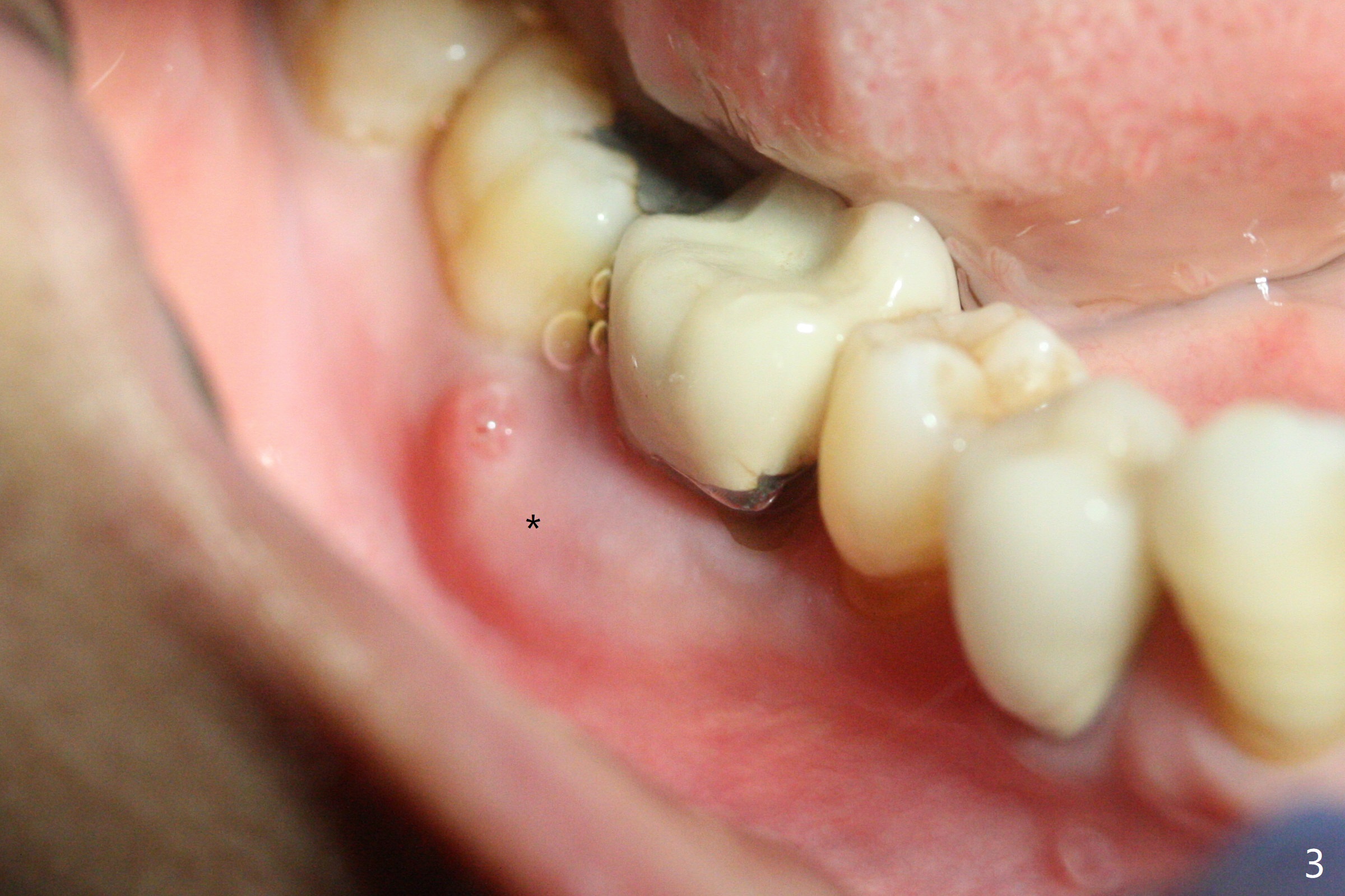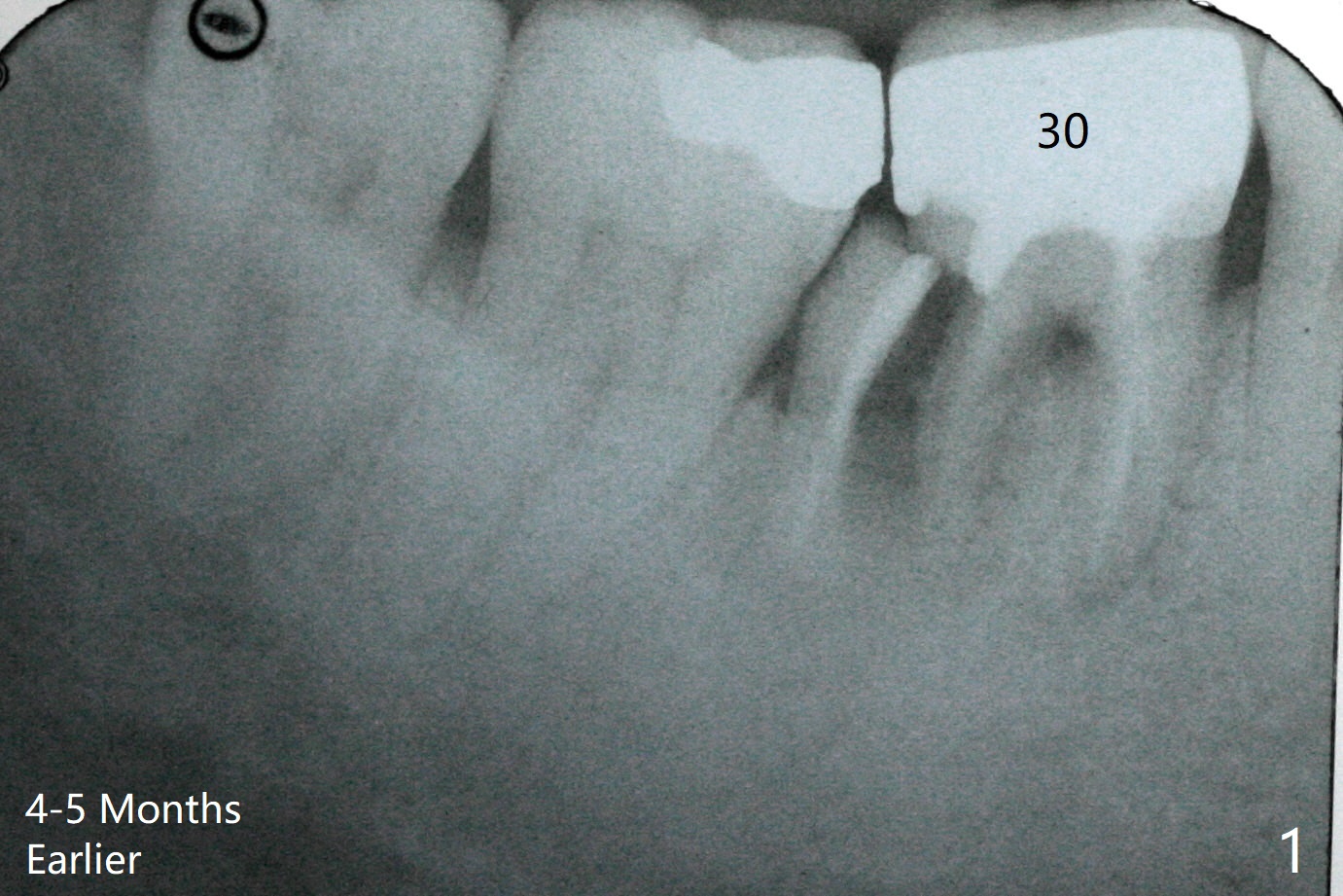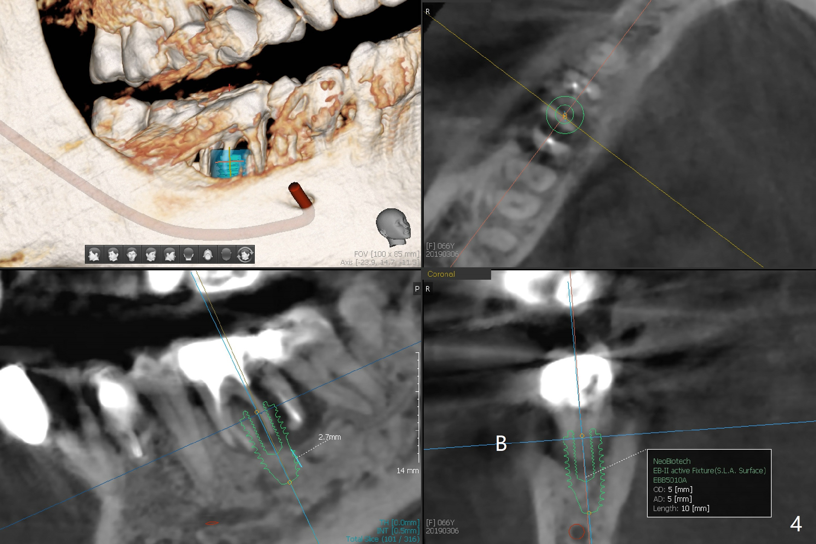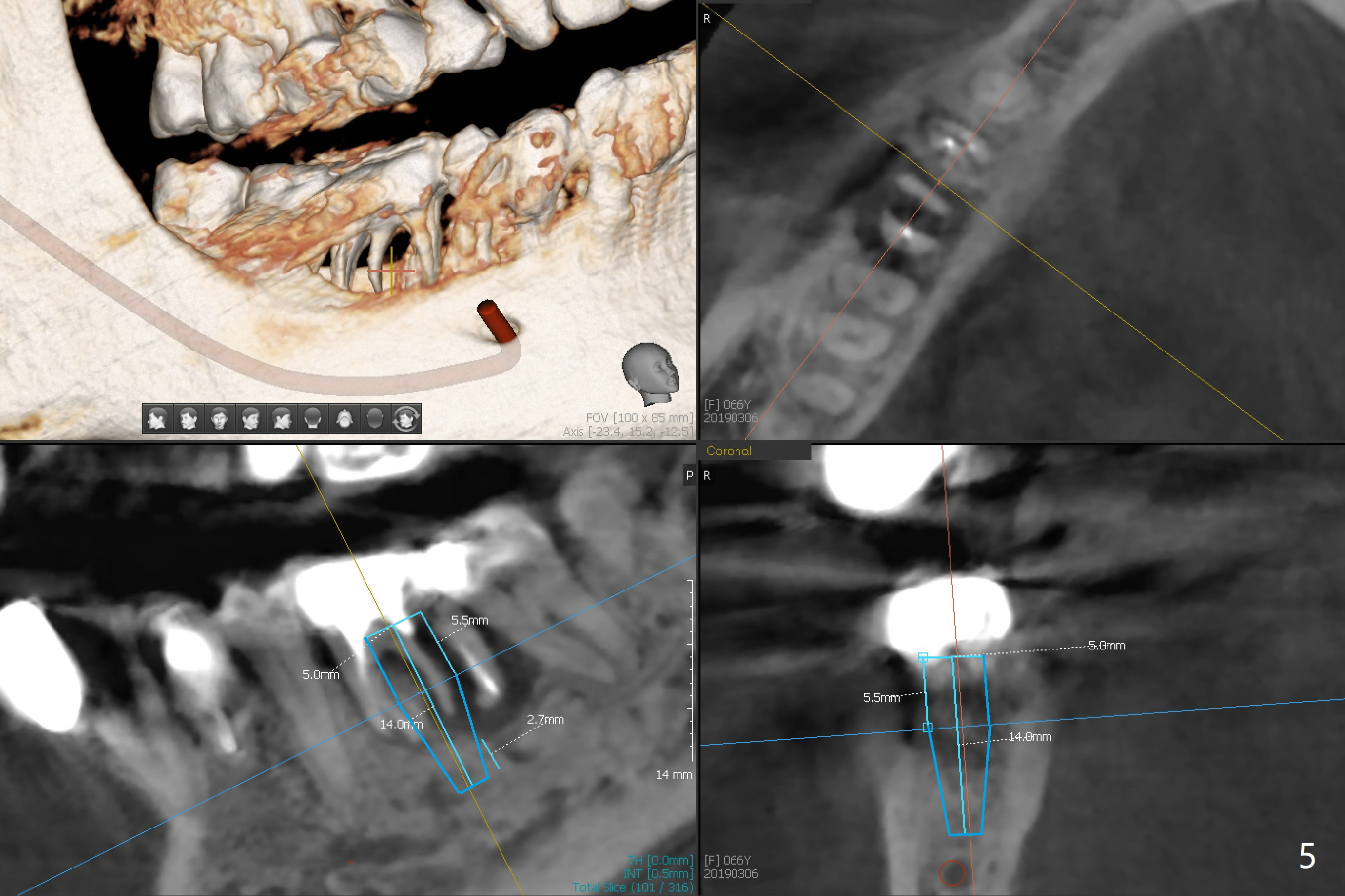 A 66-year-old woman loses a lot of bone at #30 in 4-5 months (Fig.1,2). There is severe buccal swelling, suggesting loss of the buccal plate and easy collapse of the gingiva after bone graft. In addition to an immediate provisional, periodontal dressing will be applied for support and seal. To prevent abutment screw loosening, guide will be used for implant placement in the most ideal trajectory (Fig.4). A tissue-level implant will provide with more security in prevention of screw loosening (Fig.5). If immediate implant is impossible, bone graft will be placed. Four months later, retake 5x5 cm CT for lab to determine the fitness of the guide.