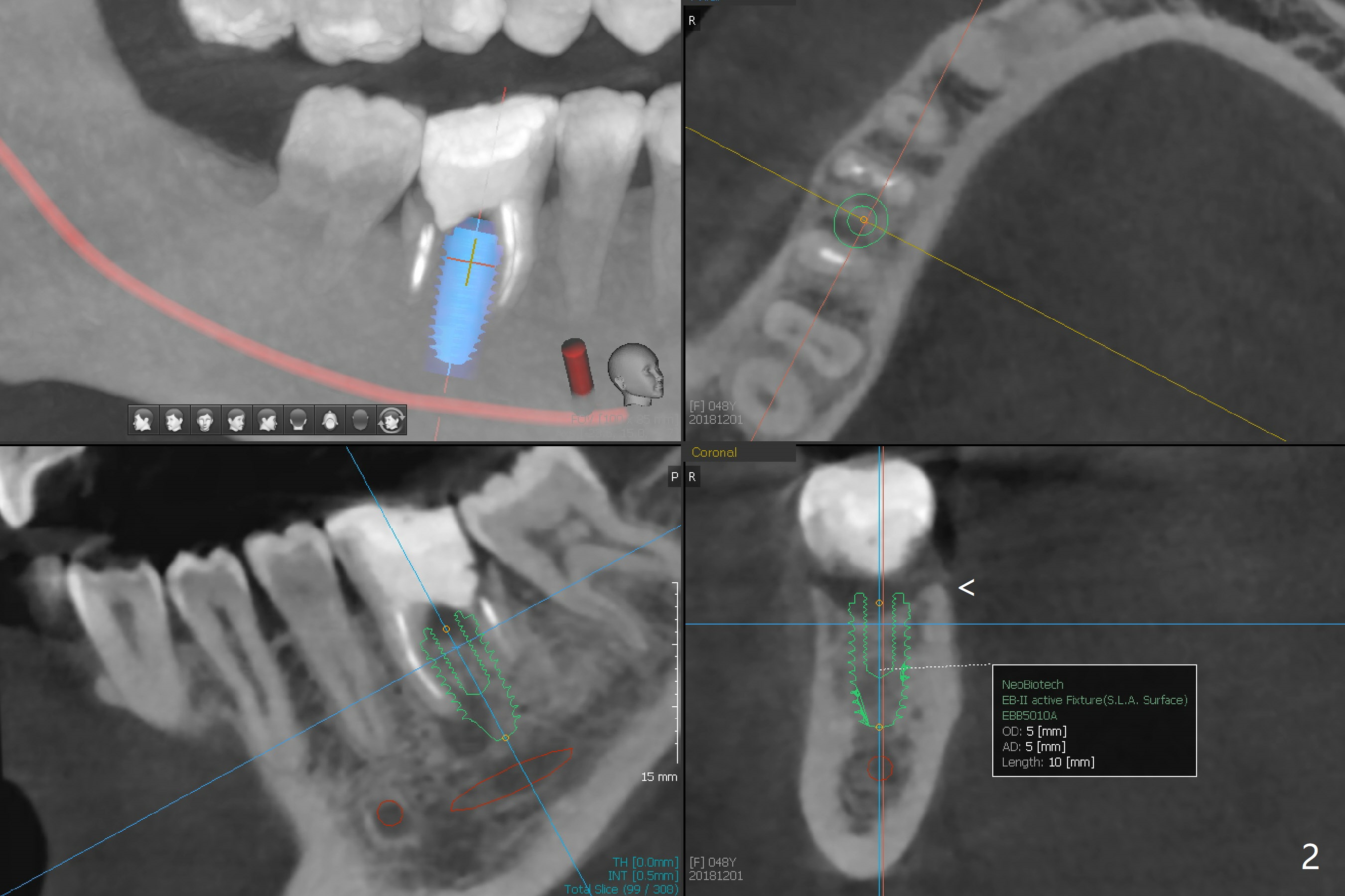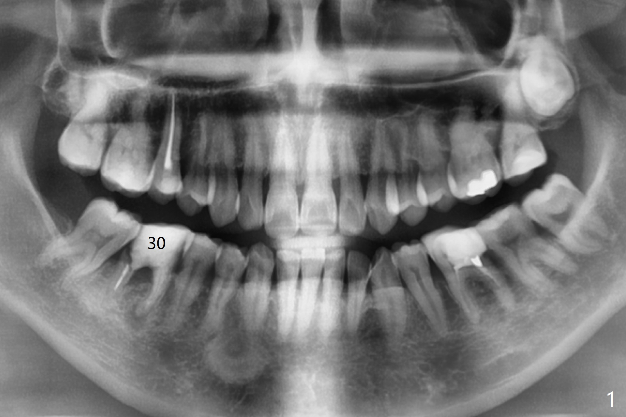 A 48-year-old woman has chewing pain at #30 with distal root fracture and a large mesial apical lesion (Fig.1). To reduce abutment screw loosening, guided surgery is planned with implant placed at the crestal level (Fig.2 <). Because of the large apical lesion, a longer implant (11.5 mm) will be placed than that Fig.2 indicates.