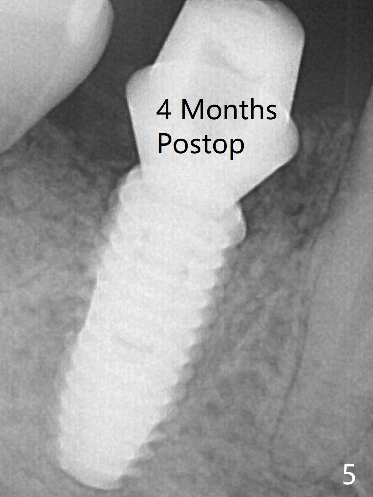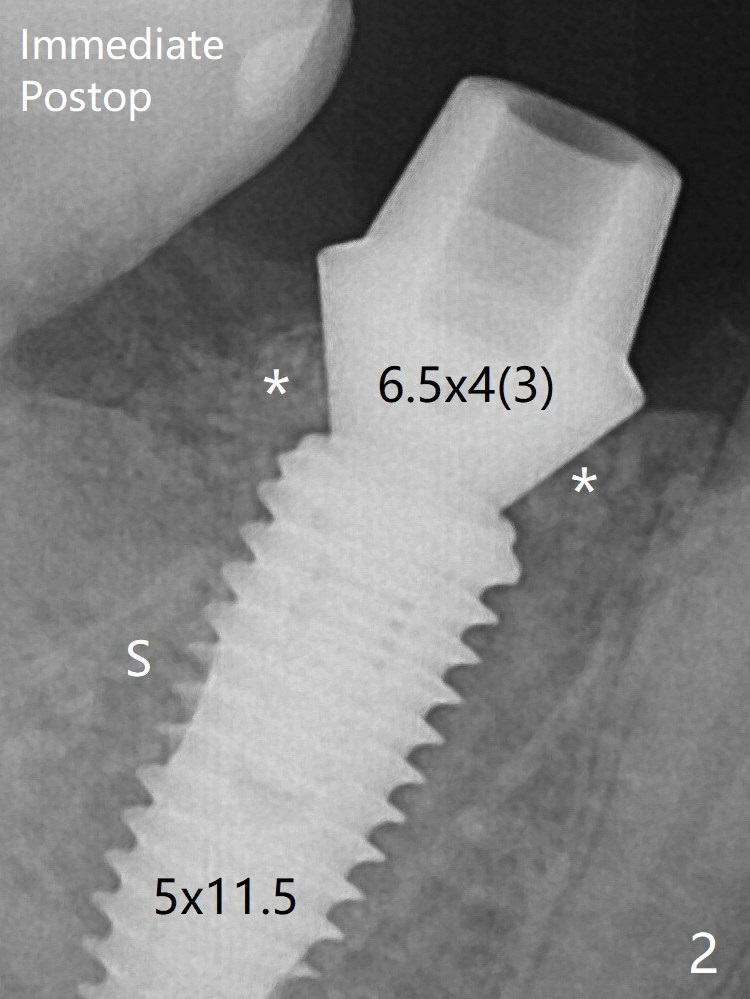 After extraction of #30 (Fig.1 (S: septum)), a 5x11.5 mm implant is placed with guide mainly in the mesial socket (mesial to the septum (S) with >35 Ncm; after immediate placement of a 6.5x4(3) mm abutment, allograft is placed (Fig.2 *). There is not too much loss of bone graft 4 months postop (Fig.5). In fact the mesial and distal sockets heal. The implant plateau is covered with the bone 8 months post cementation (Fig.6 arrowheads ( *: addition of porcelain for the distal gingival embrasure)).