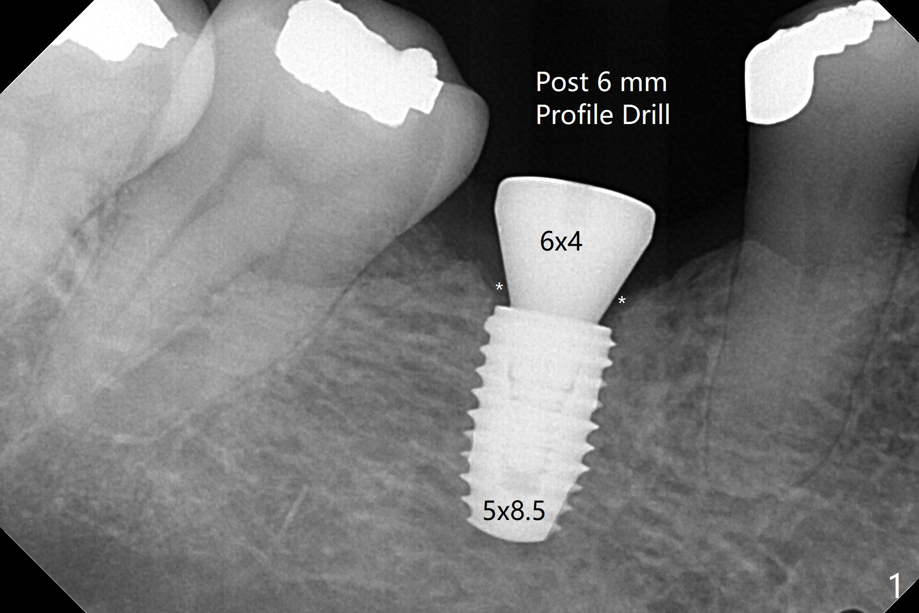 使用导板植入5x8.5毫米植体(图一:相当深)后,使用6毫米Profile钻头。安置6x4毫米愈合基台,后者与近中,远中牙槽嵴之间有距离(*),所以基台就能完全就位(<)。术后即刻使用这种钻头,可以避免二期手术。