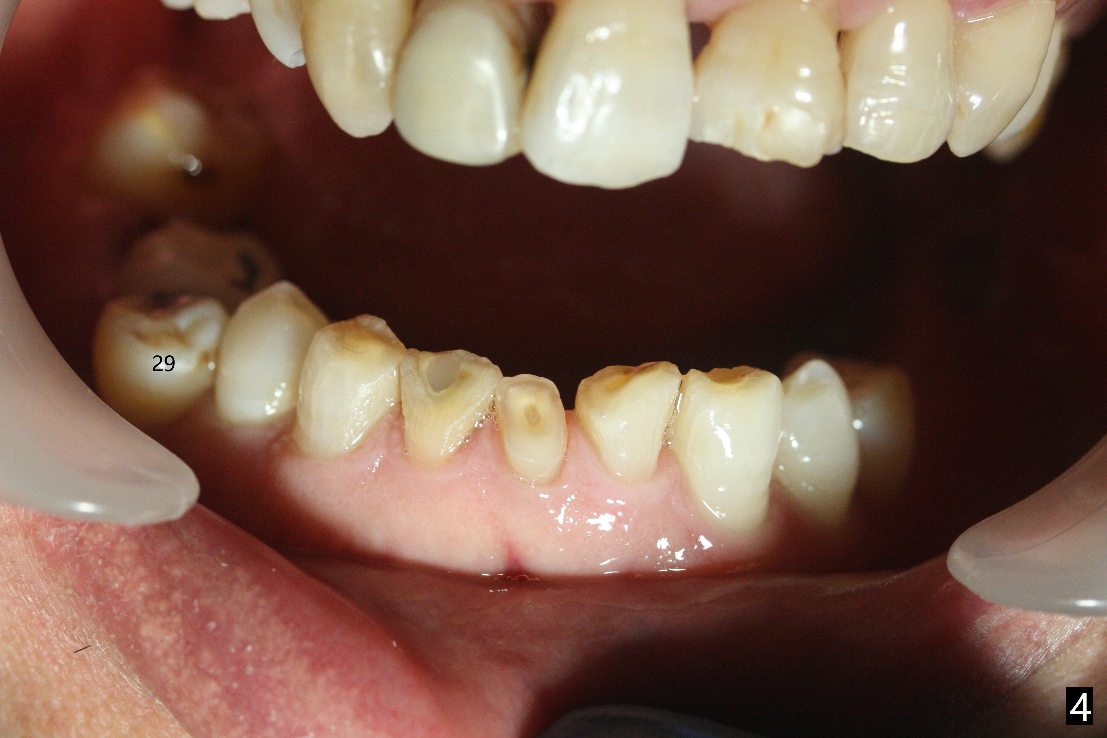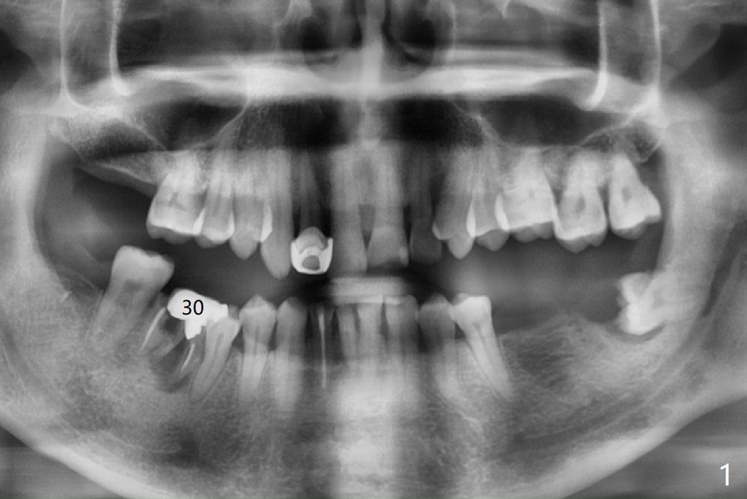 A 61-year-old man presented to clinic for new patient examination last year (Fig.1). He was not interested in extraction and implant at #30 because of finance. This year he requested treatment since he cannot chew well (Fig.2). After exam, extraction and implant at #30 appear not to be a priority, since there is anterior deep bite (Fig.3) with posterior occlusal collapse (Fig.4) as well as #29 malposition.