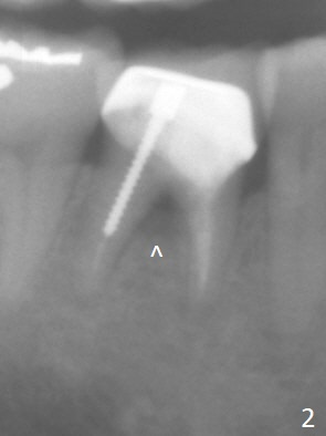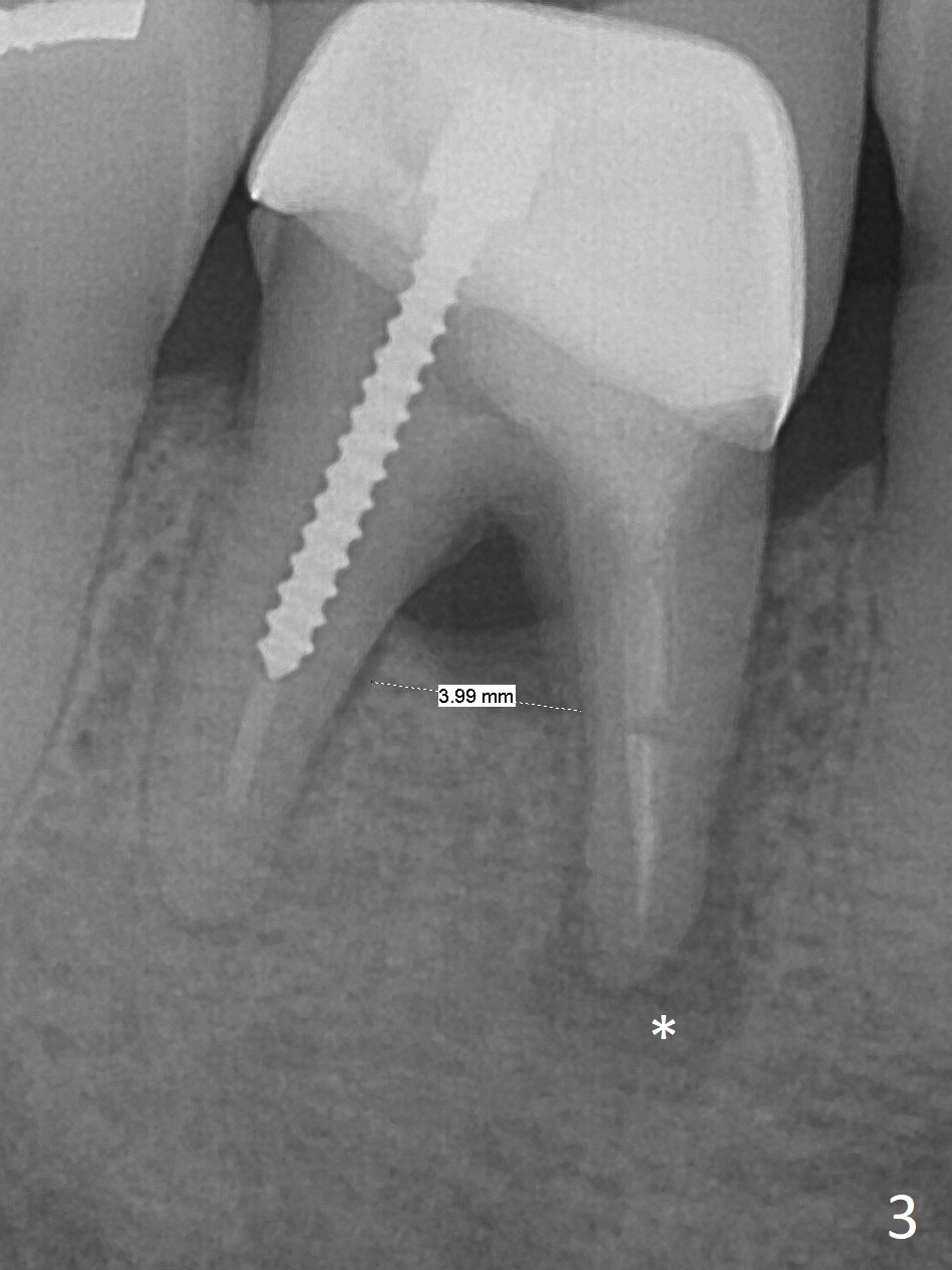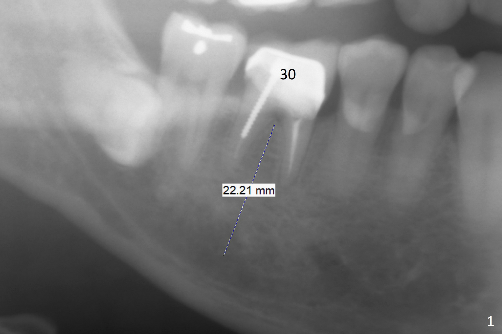 There appears no bone resorption at the septum of the tooth #30 of a 61-year-old man with 22 mm of bone (Fig.1; 10 years ago). The septum starts to have bone loss without symptom 3 years earlier (Fig.2 ^). Now the tooth is symptomatic with bone lesion also involving the mesial apex (Fig.3 *). Osteotomy will be initiated in the flattened septum with 4 mm mesiodistal width. Prior to placing a 13 mm IS implant, the depth of the last 2nd drill will be 15 mm. Prepare Magic Expanders. Place Magic Split blade buccolingually to expand the septum mesiodistally.