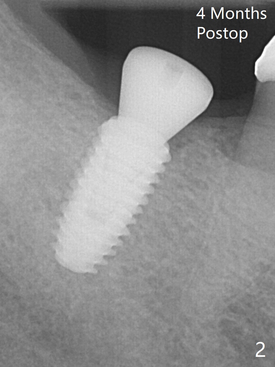 Two carpules of anesthetic is administered at #30 for the apprehensive patient, as compared to one for most cases. He is extremely pleased when the guided surgery is finished in a quick and painless manner (Fig.1). There is no bone loss 4 months postop (Fig.2); impression is taken.