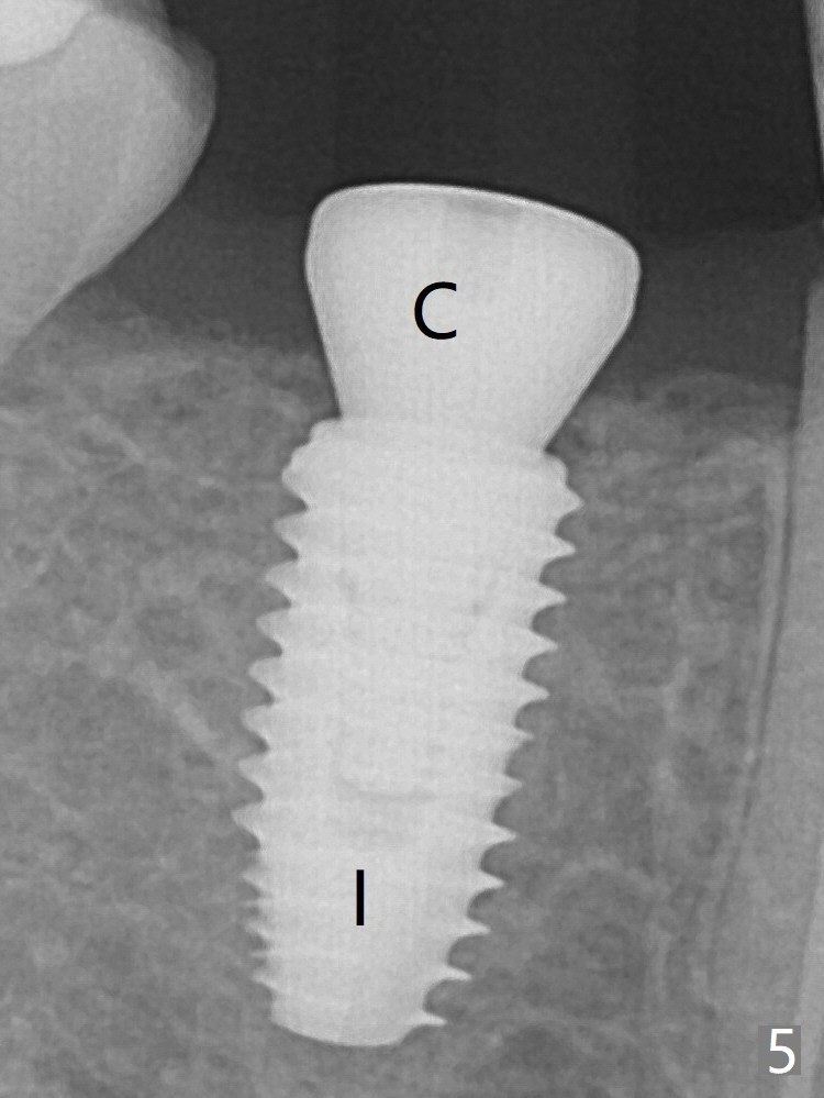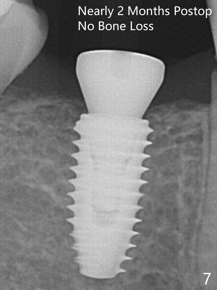 Everything happens so quick that when a 5.5x3 mm healing abutment is placed (Fig.4), you are pleased to feel that the implant is stable (Fig.5). The patient returns for impression nearly 2 months postop (Fig.7,8). It appears that the implant has osteointegrated without bone loss (Fig.7). Guided surgery seems to be less traumatic than free hand one. The soft tissue is healthy around the just placed cementation abutment (Fig.8 (5.2x4(2) mm).