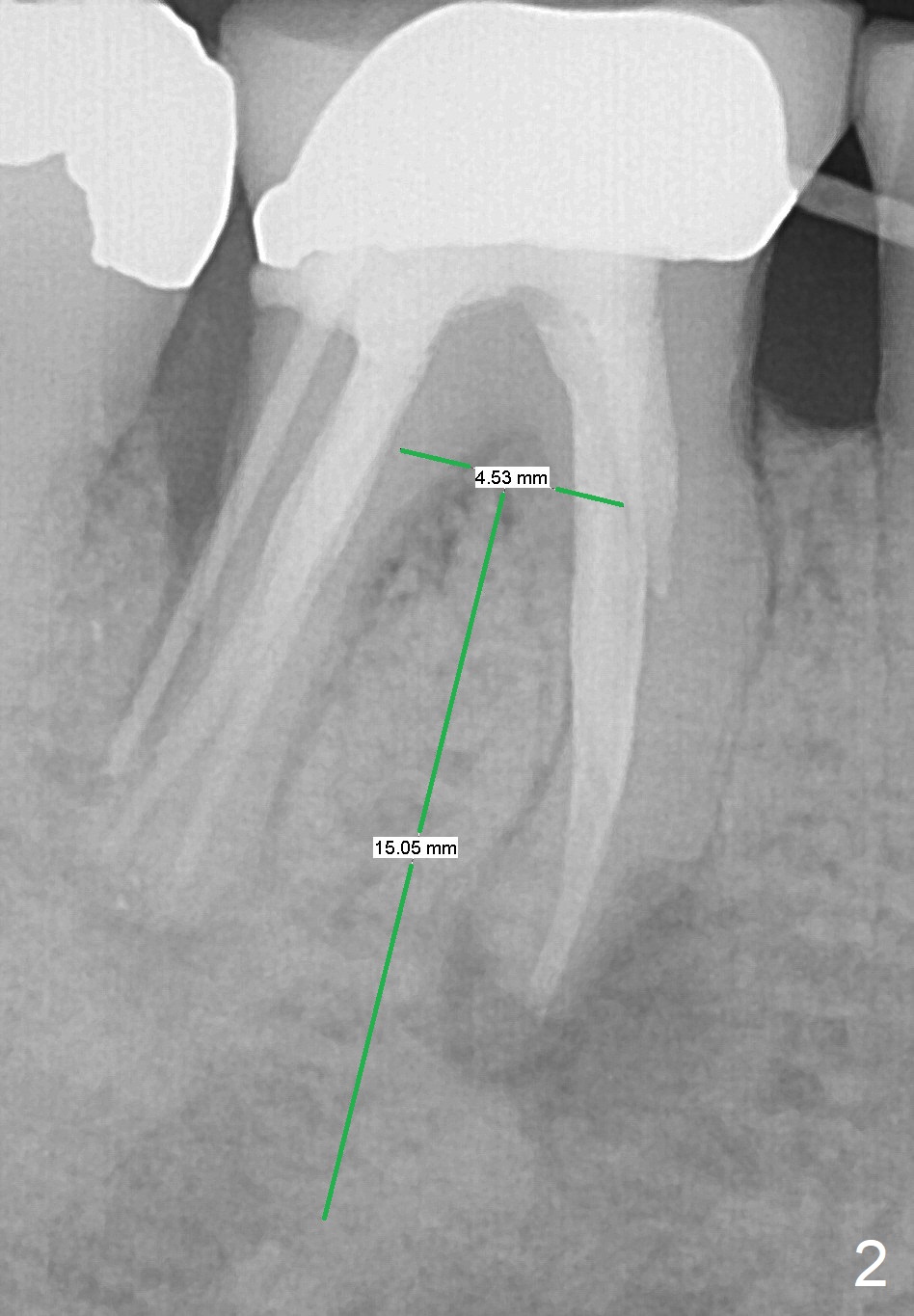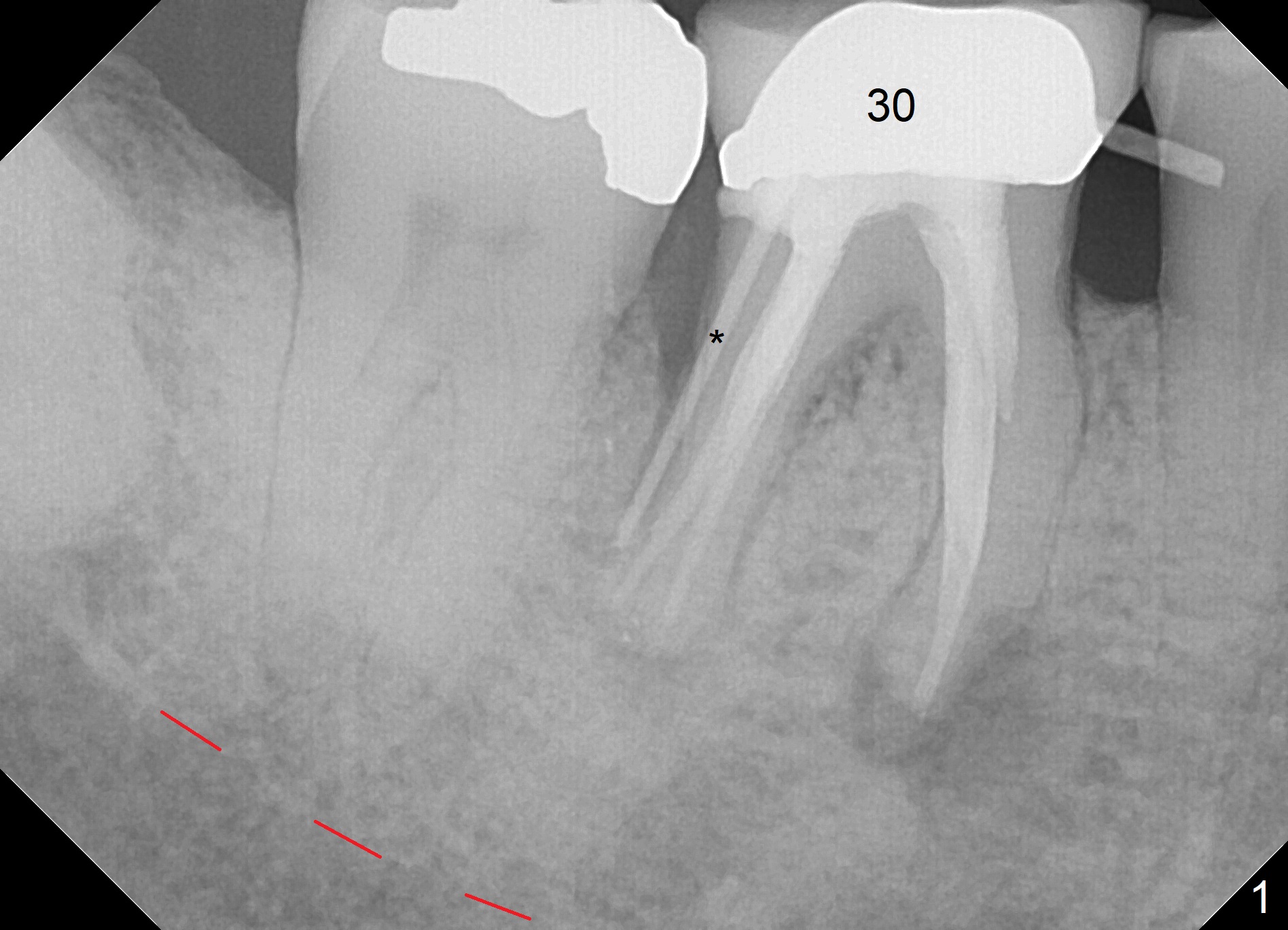 A 79-year-old woman with osteoporosis has pain and buccal swelling 9 years post RCT at #30 (Fig.1 (* gutta percha inserted in fistula)). It appears that the tooth should be replaced by a long implant with better surface treatment for osteointegration (Fig.2). Let the implant heal more than 4 months with progressive loading. Take preop photos to show the buccal infection. For the best trajectory, take PA immediately after 2 mm drill and watch for the deviation of the osteotomy. Place Osteogen plug in the apical portion of the sockets and allograft in the coronal half. Start osteotomy as lingual as possible. The patient is nervous. Comfort her.