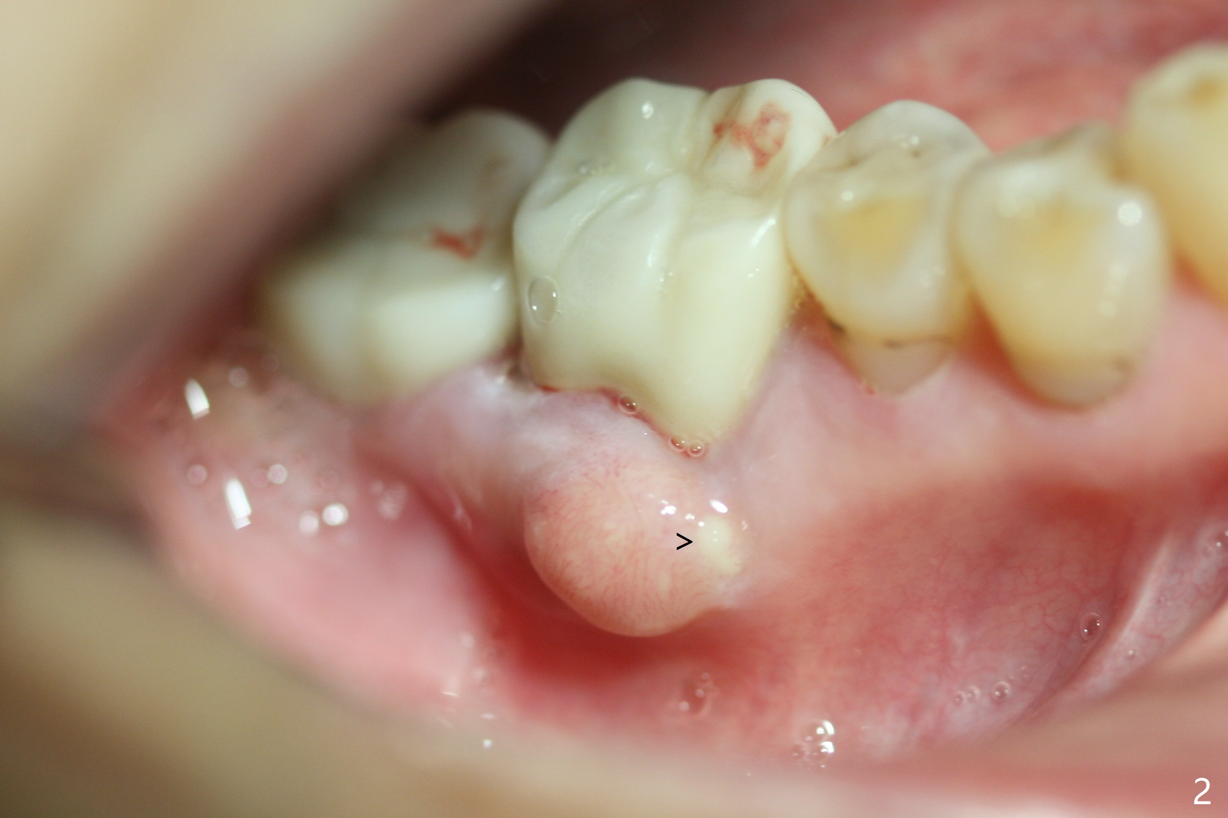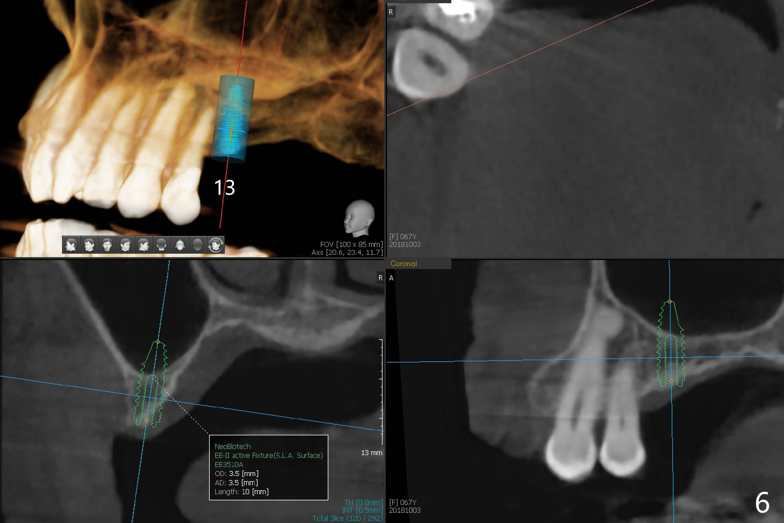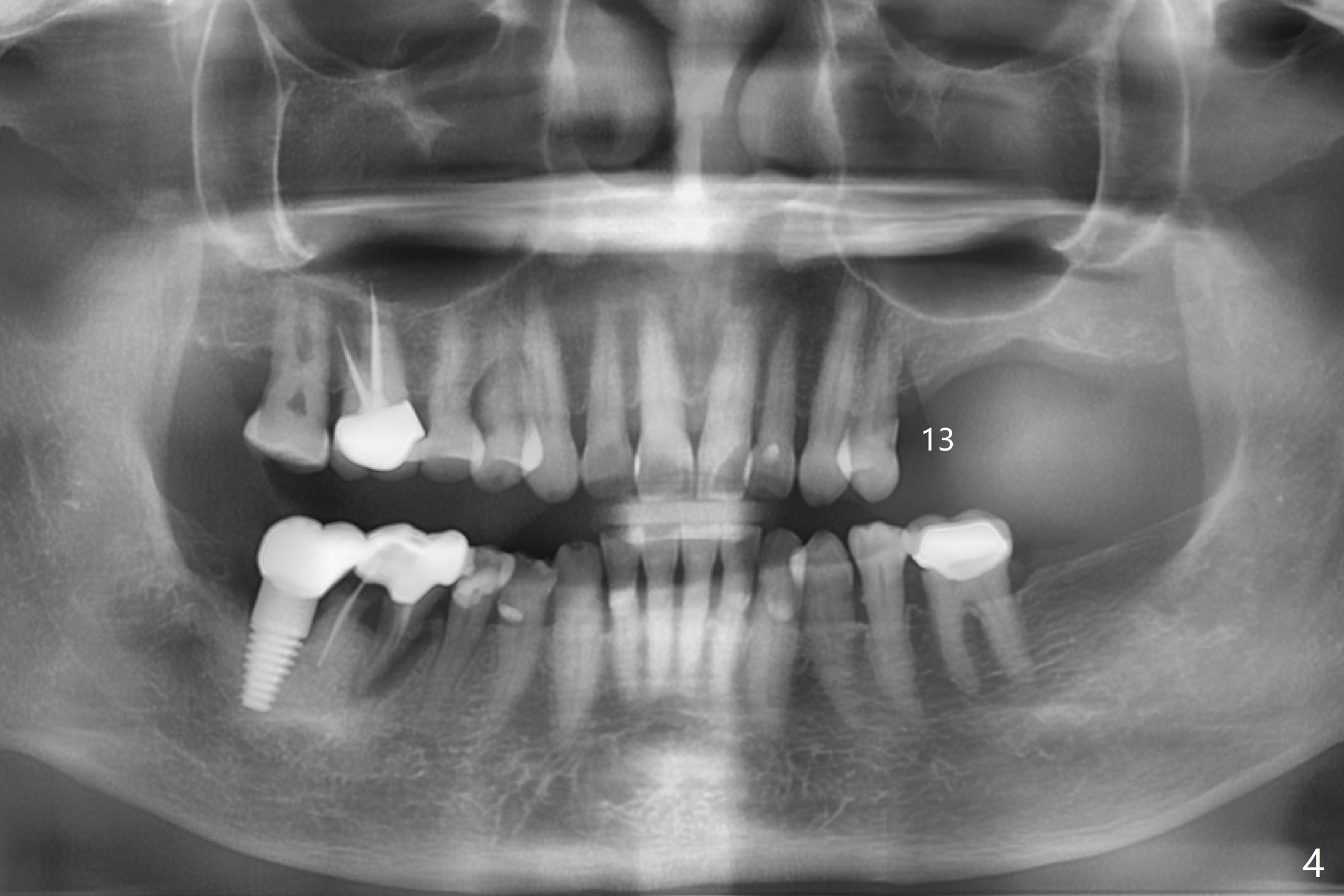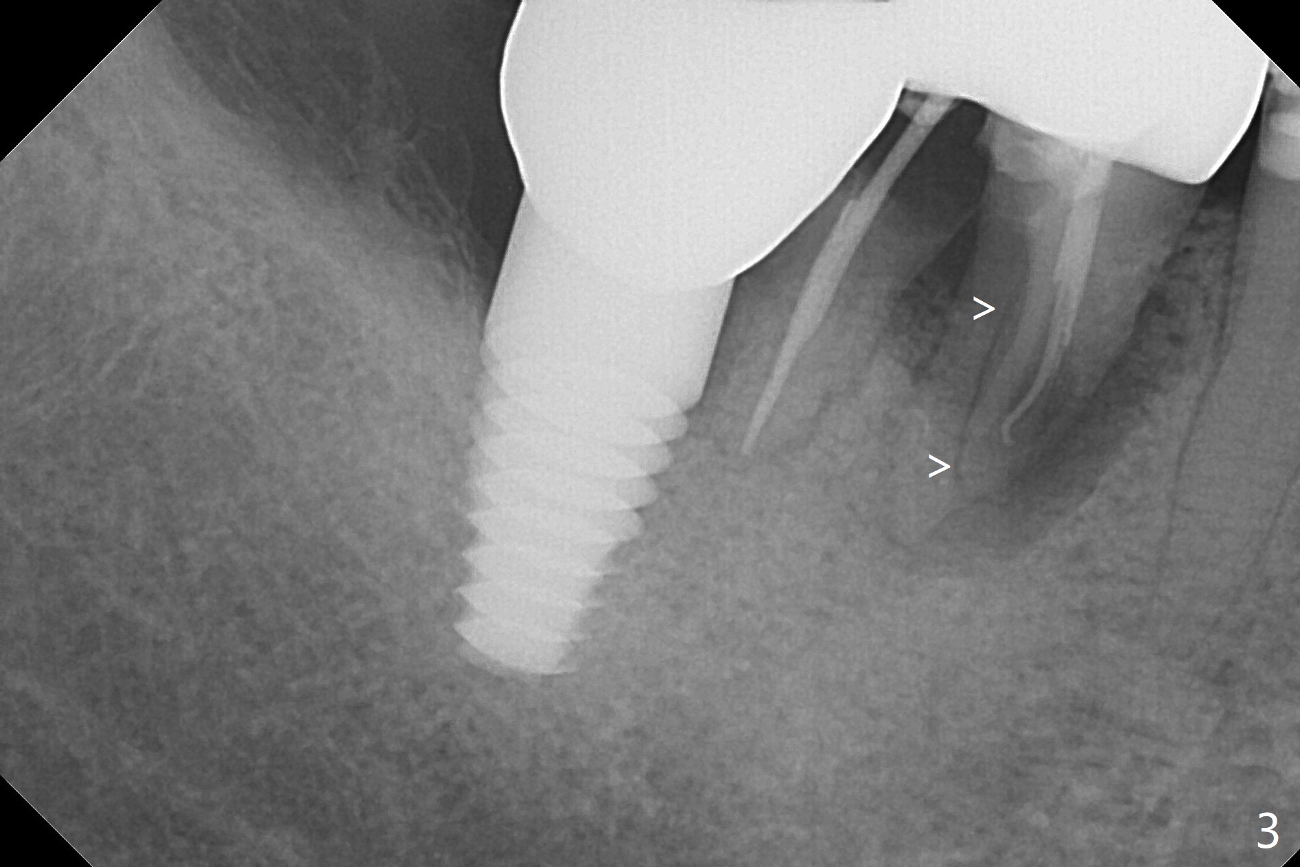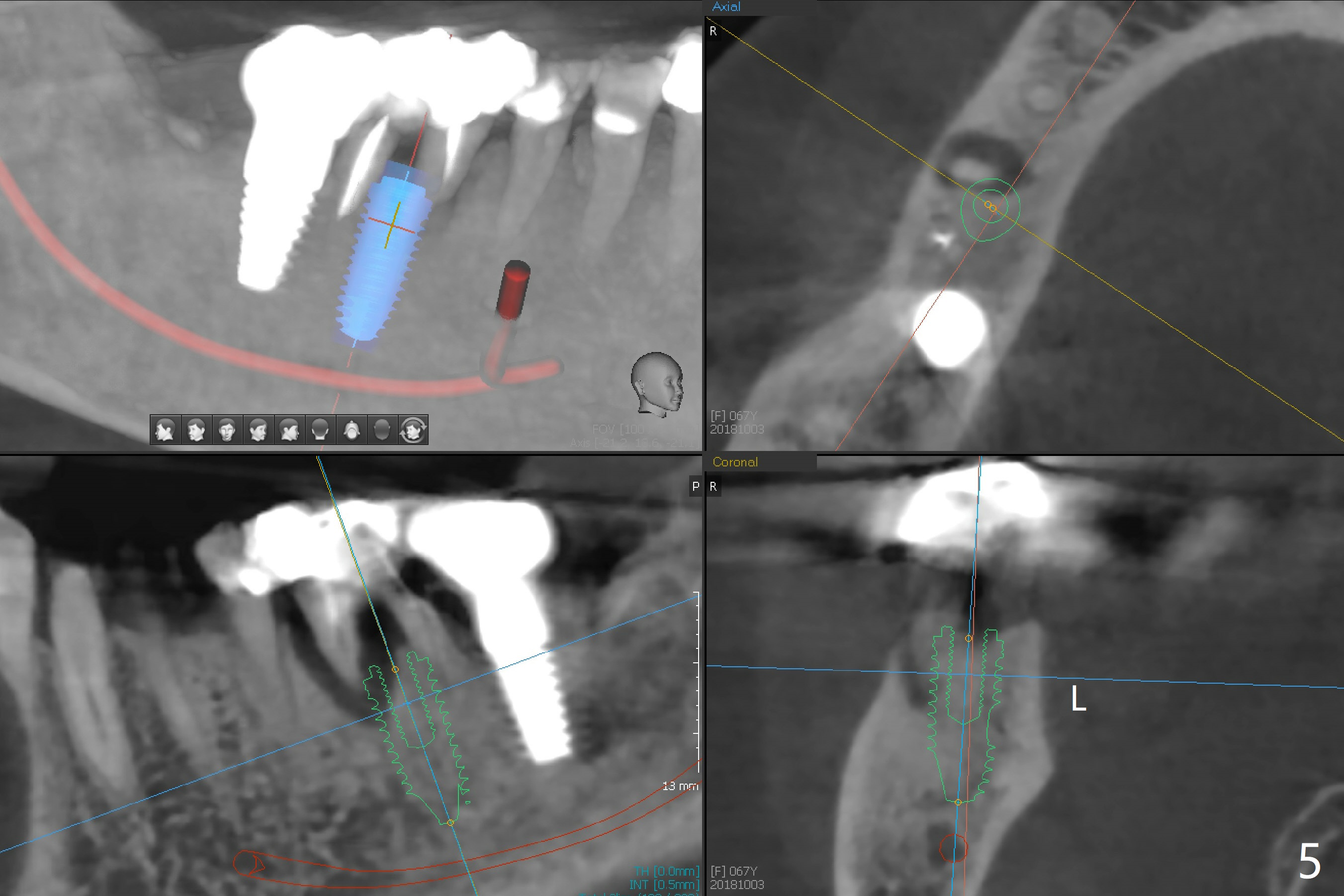 A 67-year-old woman masticates on the right side (Fig.1 (5 years post #30 RCT), as compared to Fig.4,6). One year and 6 months later, there is a fistula mesiobuccal to the tooth #30 (Fig.2 >,4) with mesial root fracture (Fig.3 >). Impression is taken for guide; a 5x11.5 mm implant will be placed slightly distal and lingual to the center of the septum (Fig.5).