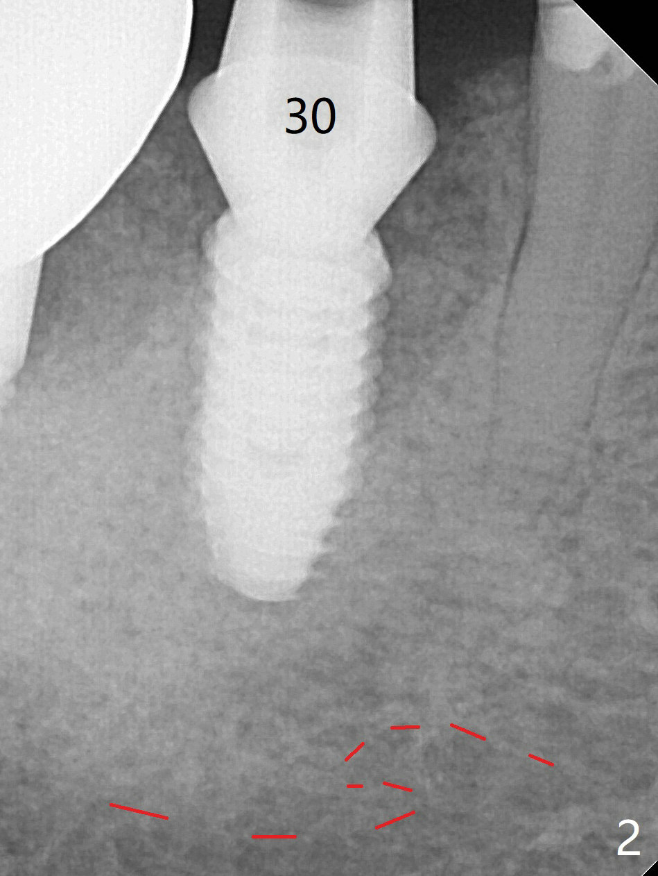 Trajectory is as good as expected with >50 Ncm (Fig.2 (red dashed line: superior border of the Inferior Alveolar Canal)). With insertion of Vanilla allograft with autogenous bone and a 6.5x4(3) mm cementation abutment, an immediate provisional is fabricated to keep the graft in place. While the crestal bone resorbs (Fig.4 *), the density of the mesial socket increases 6.5 months postop.