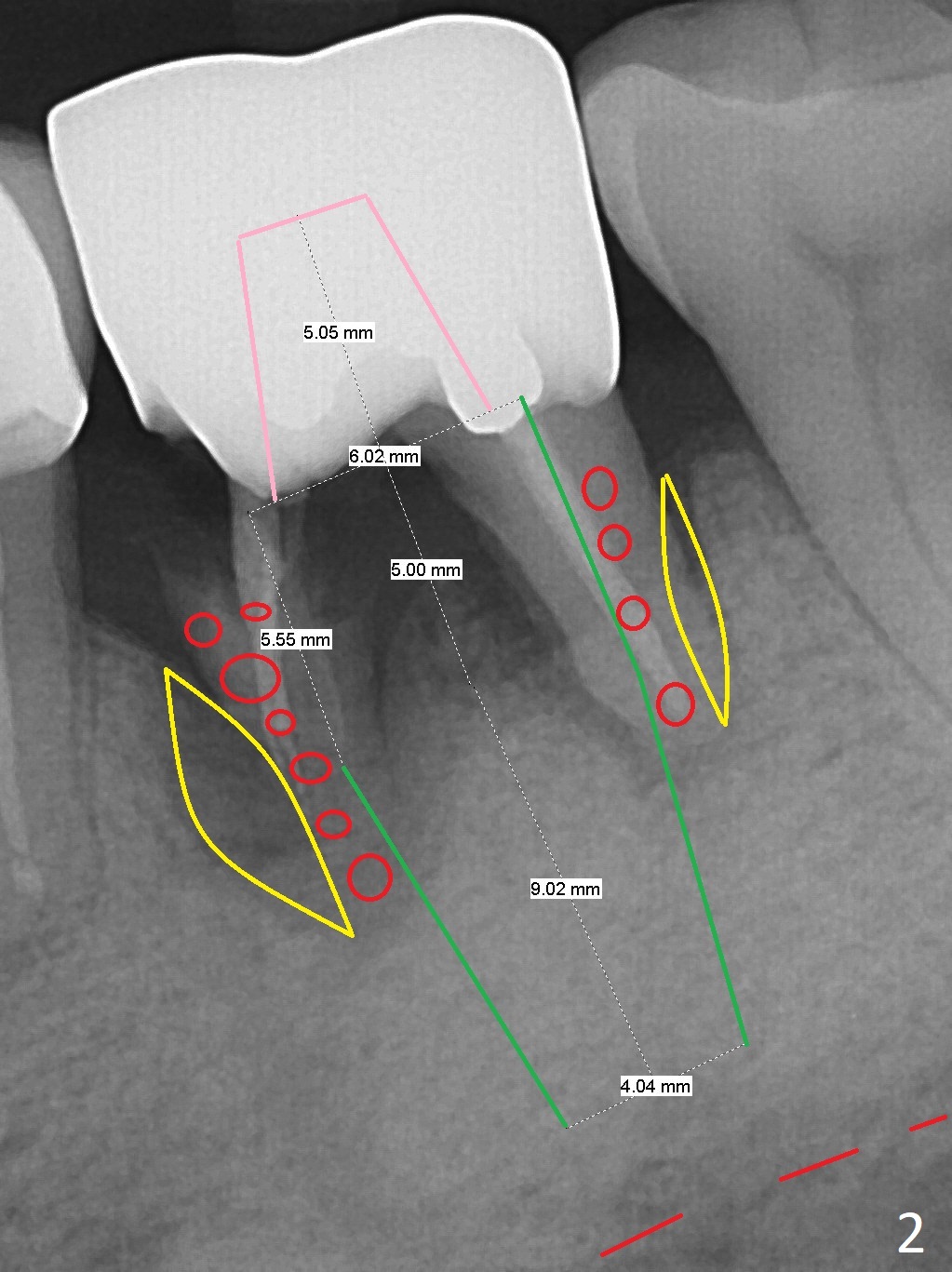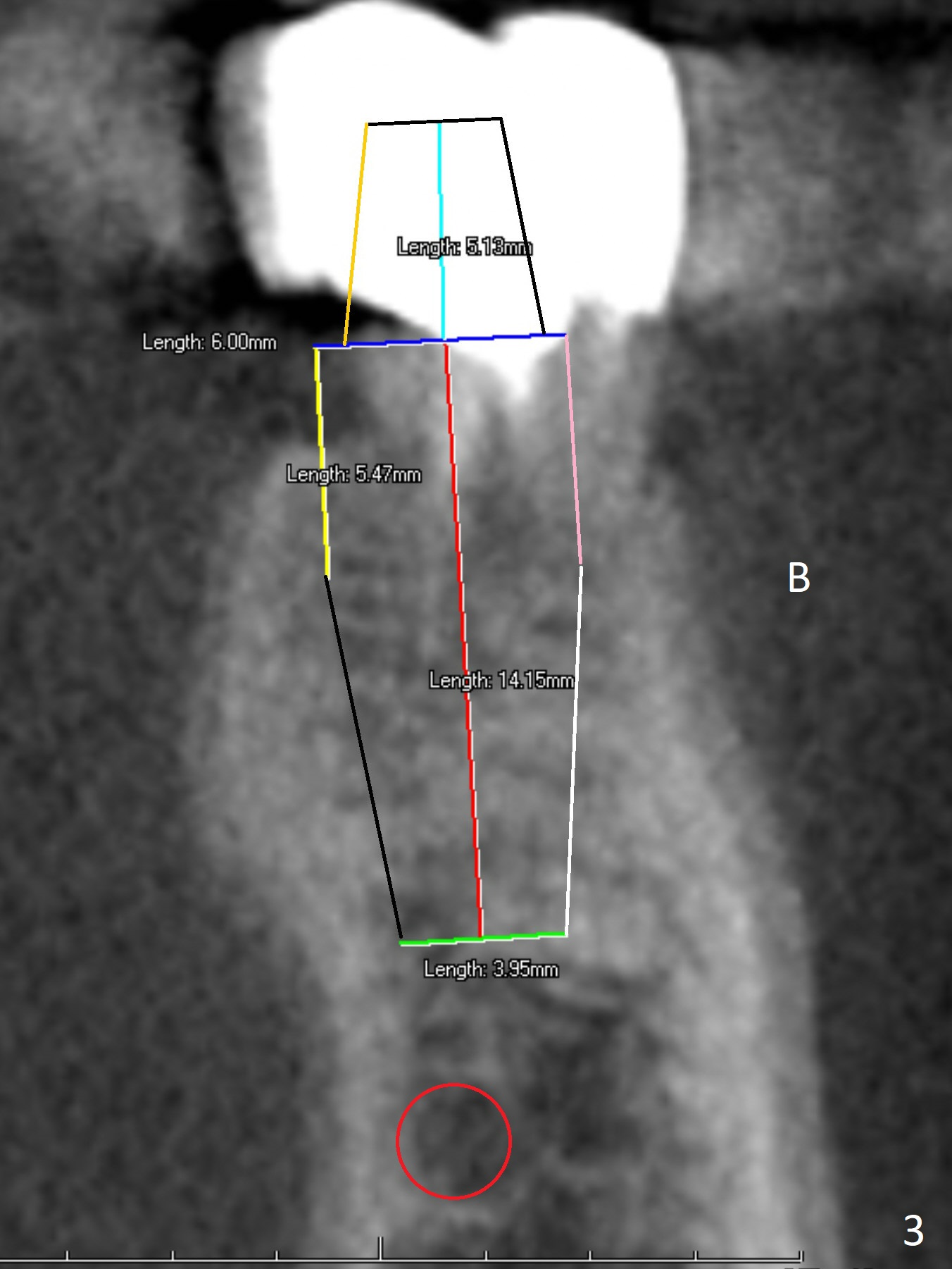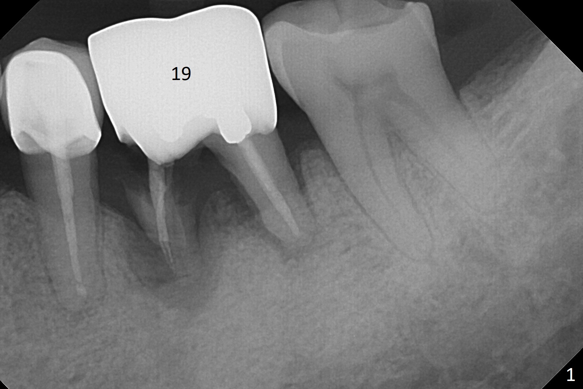 A 64-year-old man feels that the lower right 1st molar irritates the tongue. The mesial root fragment is sharp lingually (Fig.1). Initial osteotomy depth is 14 mm (gingival margin, Fig.2), as lingual as possible (Fig.3 CT taken on 01/21/2011).