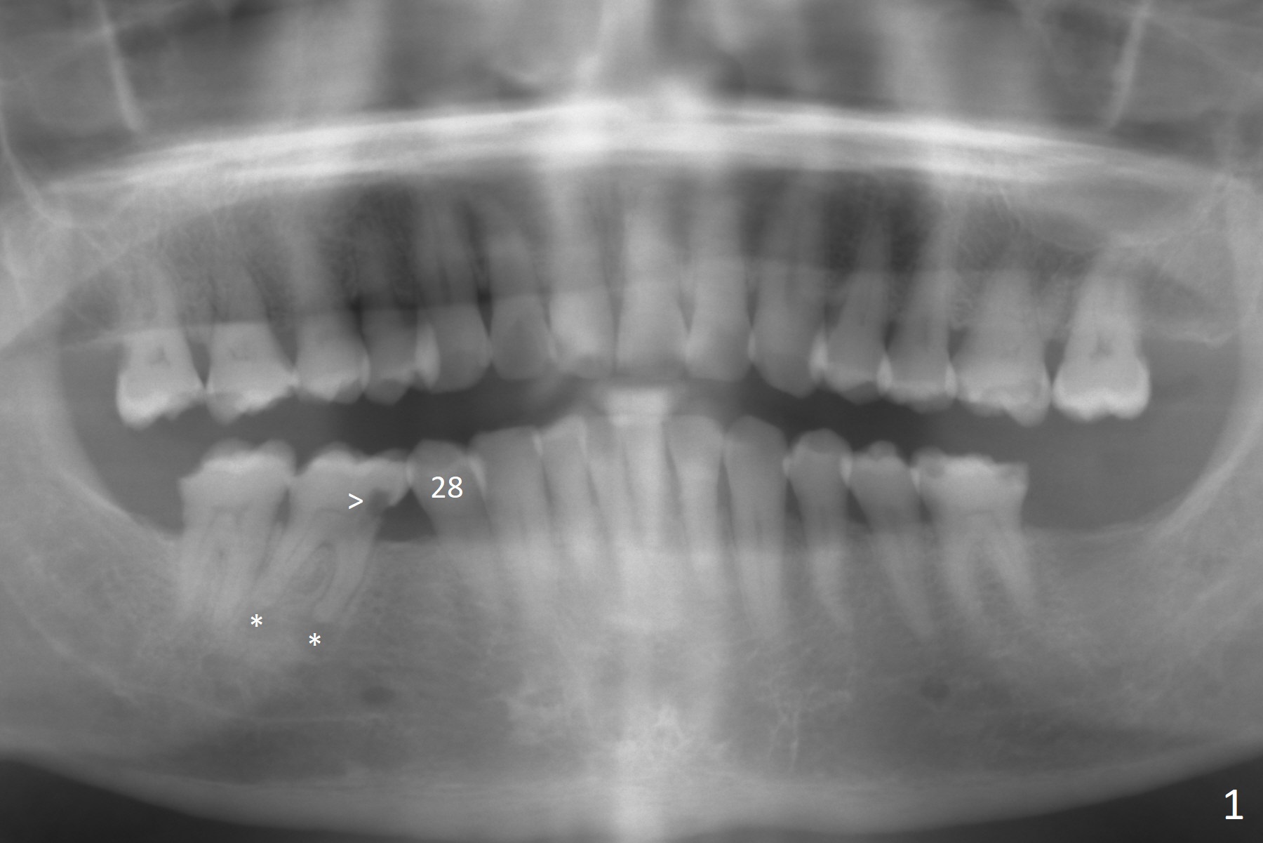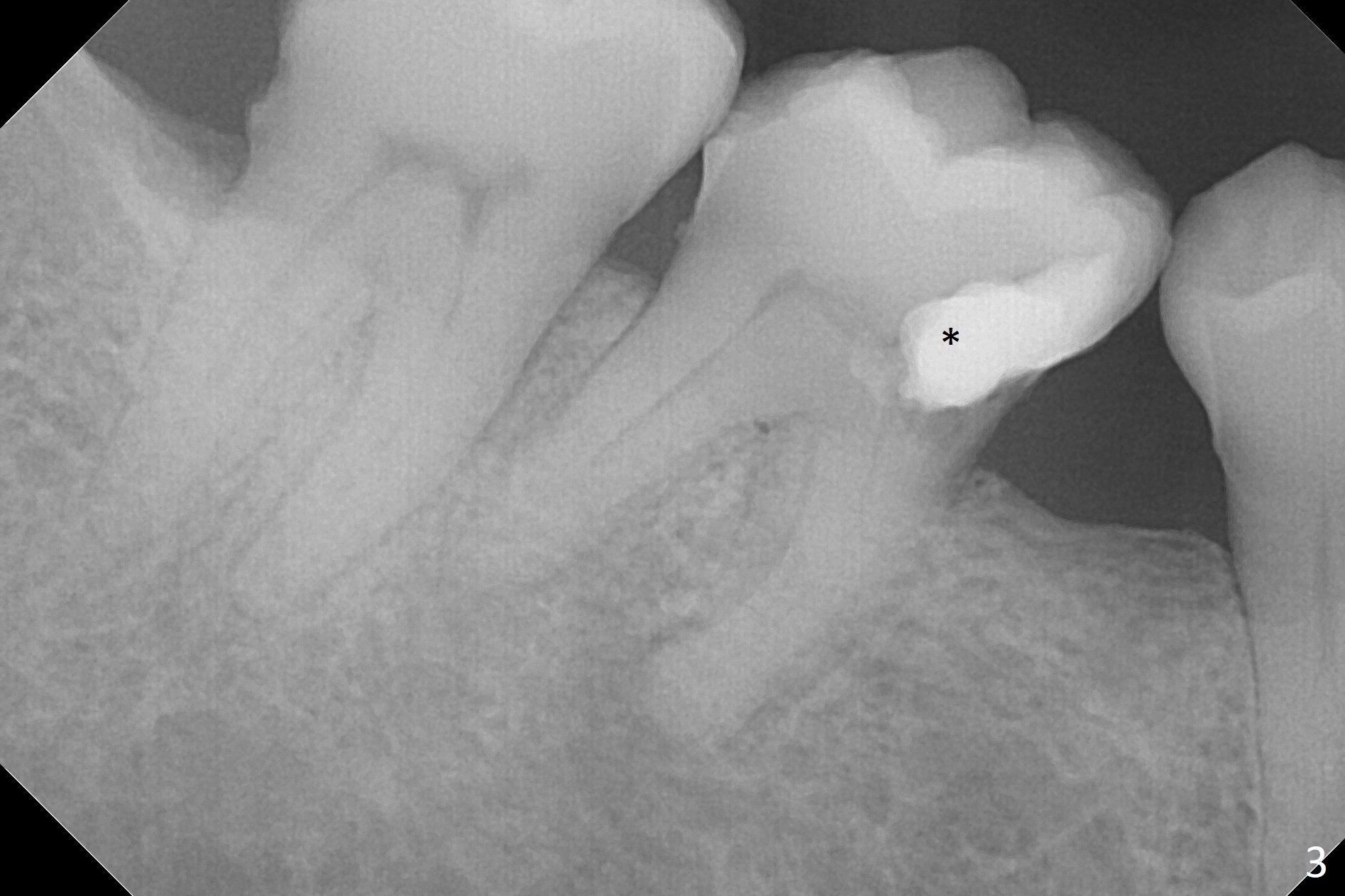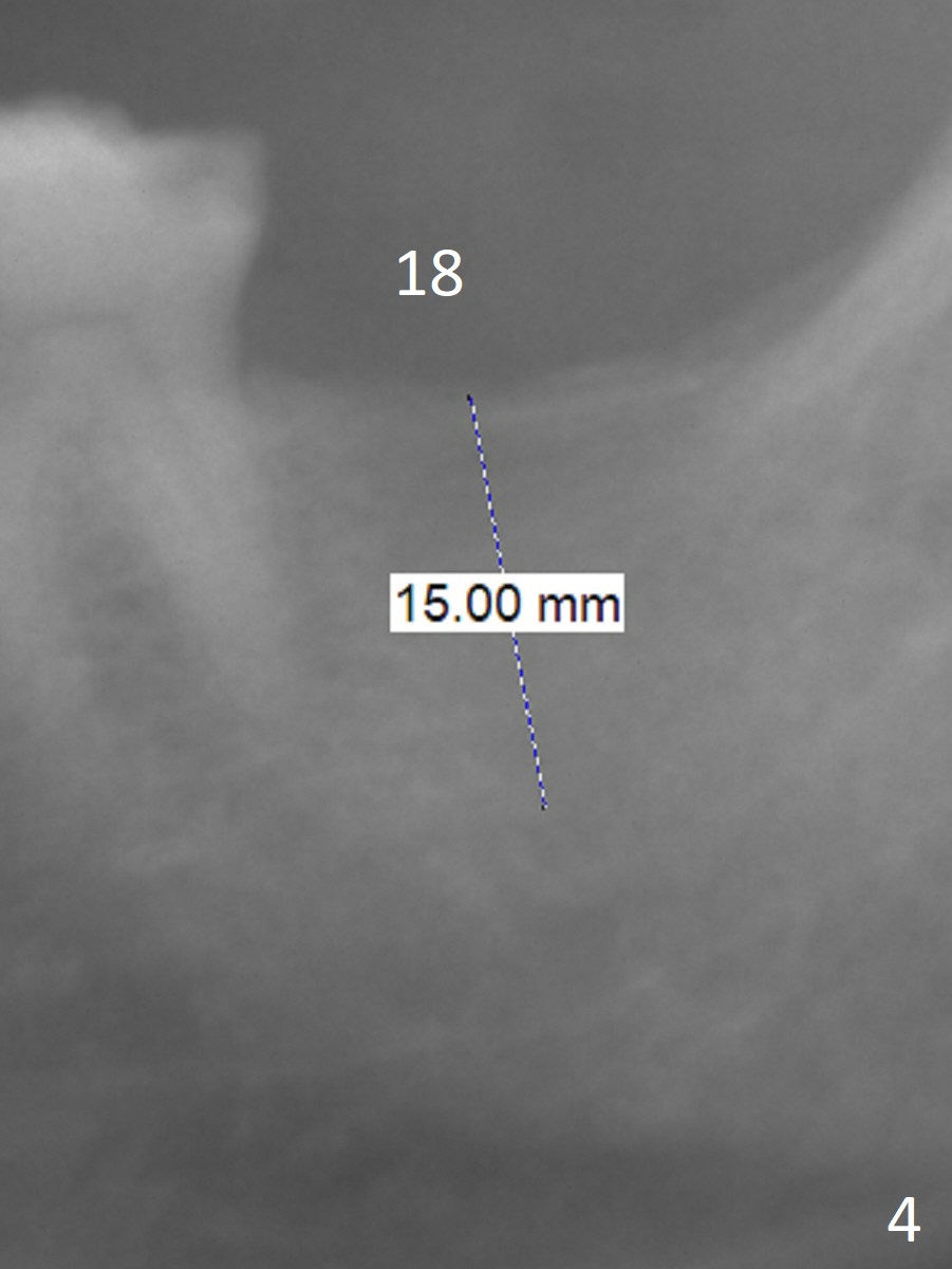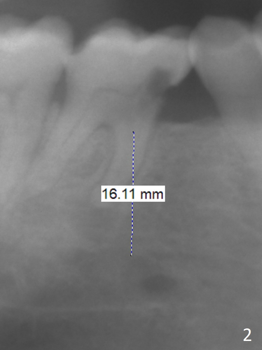 A 58-year-old man has history of temporomandibular joint disorder as related to severe occlusal breakdown and missing tooth #18 (Fig.1,4). The tooth #29 is also missing; the tooth #30 has shifted and tilted mesial. Severe pain develops at #30 two years after MOL composite (Fig.3). The patient insists on extraction and implant, although pulpotomy has been done to alleviate the pain. Although there is sufficient bone height, IS implants will be used because of primary stability and apparent better implant/abutment binding as compared to IBS (with tendency of screw loosening). Osteotomy will be initiated in the mesial socket at #30. Measure the whole length of drills. Find 17-8 mm mark, which will be used as soft tissue landmark.
