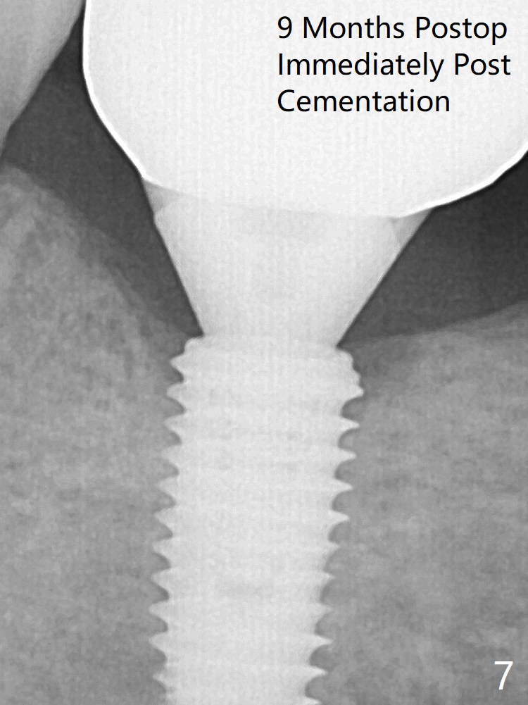 Since the Inferior Alveolar Canal is invisible (Fig.1,2 (pan should have been taken)), a 5x11.5 mm implant is placed with <20 Ncm. When a 6.5x5.5(3) mm abutment is placed, the underlying implant is turned (Fig.3).The patient returns for uncover 8 months postop; although the implant has osteointegrated apparently, the crestal bone resorbs to the implant plateau level (Fig.6 arrow). It seems that the immediate implant should be routinely placed 2-3 mm deeper. The open margin is closed with composite when the abutment/crown is removed after cementation (Fig.7).