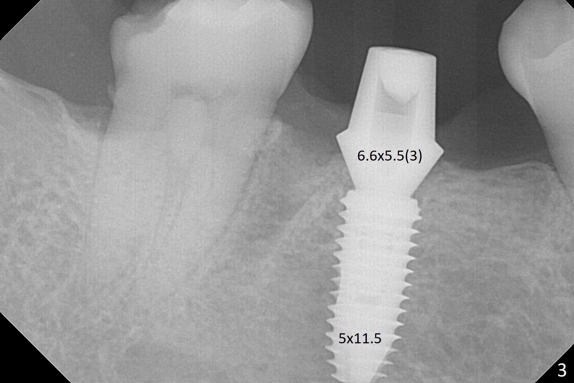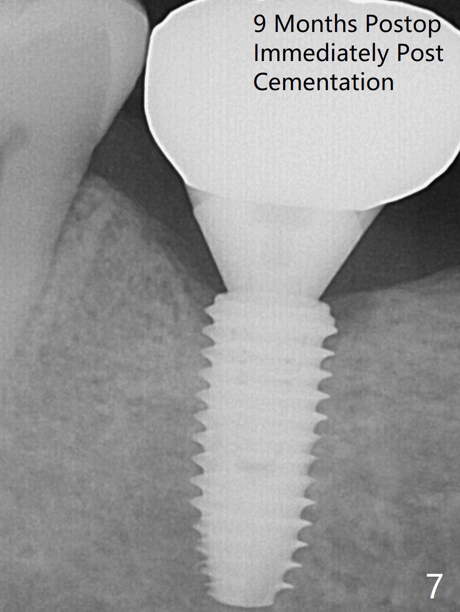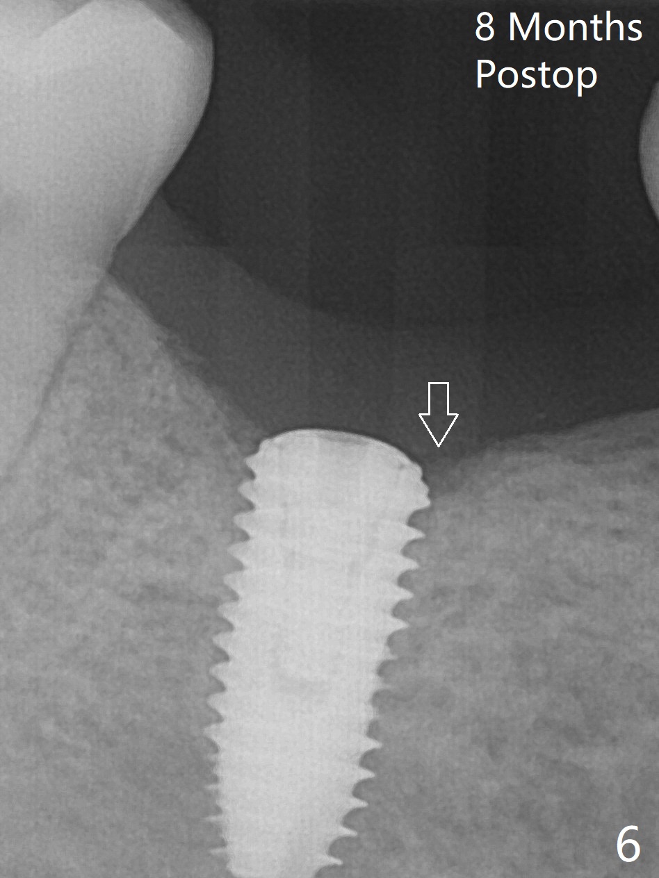 Because of severe pain, block anesthesia is administered prior to extraction. The mesial socket of the tooth #30 is deep with granulation tissue. A 4.5x10 mm dummy implant is placed with < 40 Ncm following sequential osteotomy until 4x13 mm over the septum (Fig.1 (low density)). After 4.5x13 mm drill, a 5x10 mm dummy implant is inserted with <40 Ncm (Fig.2). Since the Inferior Alveolar Canal is invisible (Fig.1,2 (pan should have been taken)), a 5x11.5 mm implant is placed with <20 Ncm. When a 6.5x5.5(3) mm abutment is placed, the underlying implant is turned (Fig.3). With collagen plug is placed in the distal socket and Vera graft around the implant, an immediate provisional is fabricated and relined. When it is seated, it has mobility. In fact the provisional should be locked into the edentulous area while it is malleable. To prevent low primary stability, osteotomy should be under prep, since the implant (red circle) contacts only two bony surfaces, i.e., the mesial (M) and distal (D) walls of the mesial socket (Fig.4 (occlusal view) black oval). There are gaps buccally (B) and lingually (L). In case of low stability, a healing screw or abutment should be placed; the remaining socket is closed with suture. The provisional is loose 19 days postop; it is removed by sectioning. A healing screw is placed. Twelve days later, the wound heals (Fig.5). The patient returns for uncover 8 months postop; although the implant has osteointegrated apparently, the crestal bone resorbs to the implant plateau level (Fig.6 arrow). It seems that the immediate implant should be routinely placed 2-3 mm deeper. The open margin is closed with composite when the abutment/crown is removed after cementation (Fig.7).