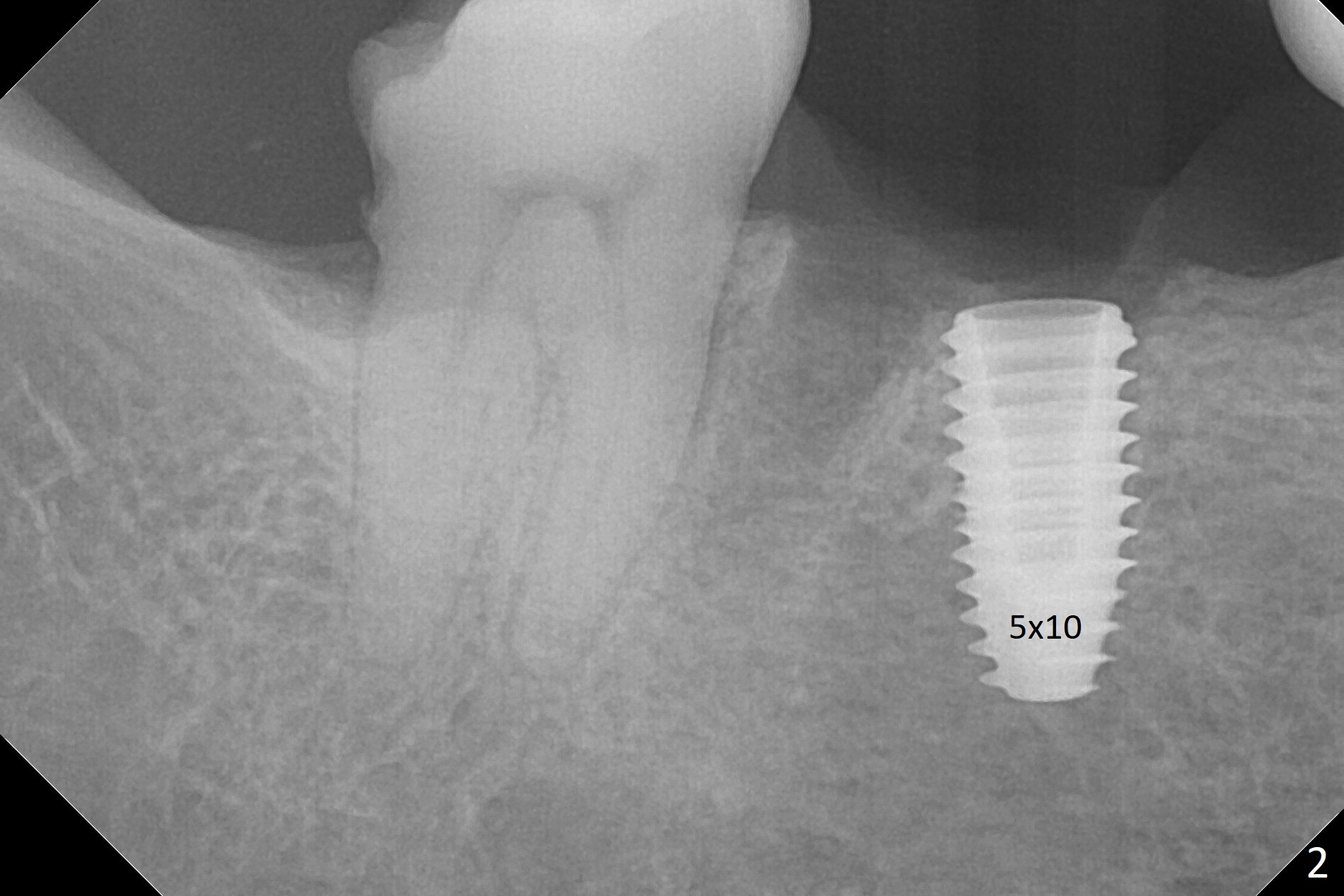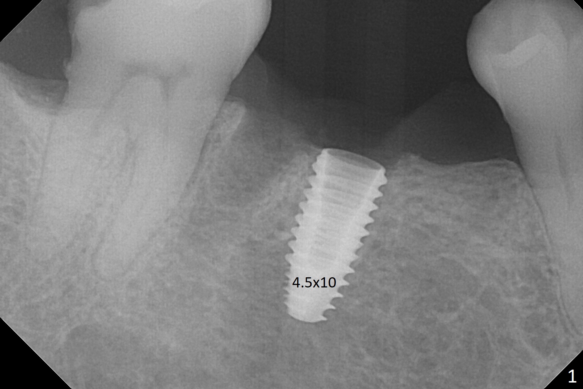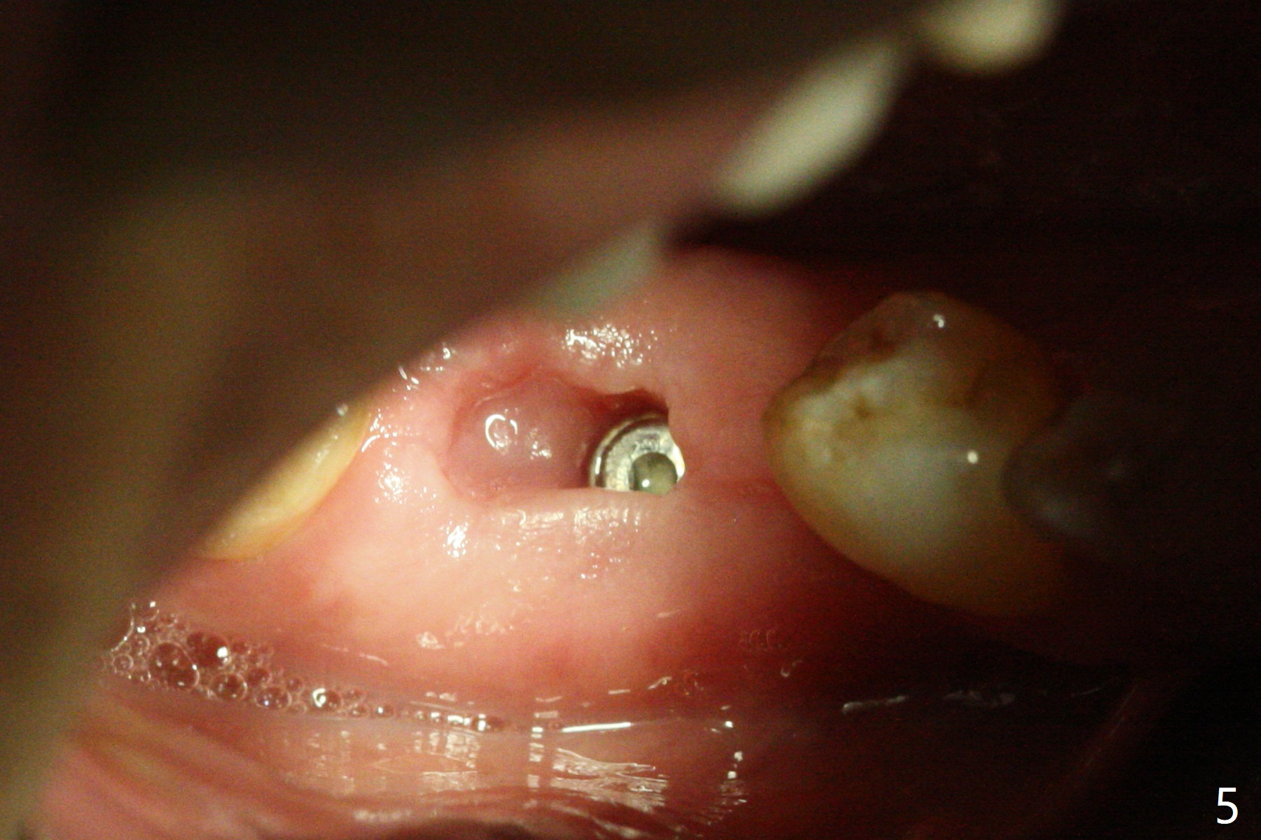 Because of severe pain, block anesthesia is administered prior to extraction. The mesial socket of the tooth #30 is deep with granulation tissue. A 4.5x10 mm dummy implant is placed with < 40 Ncm following sequential osteotomy until 4x13 mm over the septum (Fig.1 (low density)). After 4.5x13 mm drill, a 5x10 mm dummy implant is inserted with <40 Ncm (Fig.2). Since the Inferior Alveolar Canal is invisible (Fig.1,2 (pan should have been taken)), a 5x11.5 mm implant is placed with <20 Ncm. When a 6.5x5.5(3) mm abutment is placed, the underlying implant is turned (Fig.3). With collagen plug is placed in the distal socket and Vera graft around the implant, an immediate provisional is fabricated and relined. When it is seated, it has mobility. In fact the provisional should be locked into the edentulous area while it is malleable. To prevent low primary stability, osteotomy should be under prep, since the implant (red circle) contacts only two bony surfaces, i.e., the mesial (M) and distal (D) walls of the mesial socket (Fig.4 (occlusal view) black oval). There are gaps buccally (B) and lingually (L). In case of low stability, a healing screw or abutment should be placed; the remaining socket is closed with suture. The provisional is loose 19 days postop; it is removed by sectioning. A healing screw is placed. Twelve days later, the wound heals (Fig.5). The patient returns for uncover 8 months postop; although the implant has osteointegrated apparently, the crestal bone resorbs to the implant plateau level (Fig.6 arrow). It seems that the immediate implant should be routinely placed 2-3 mm deeper. The open margin is closed with composite when the abutment/crown is removed after cementation (Fig.7).