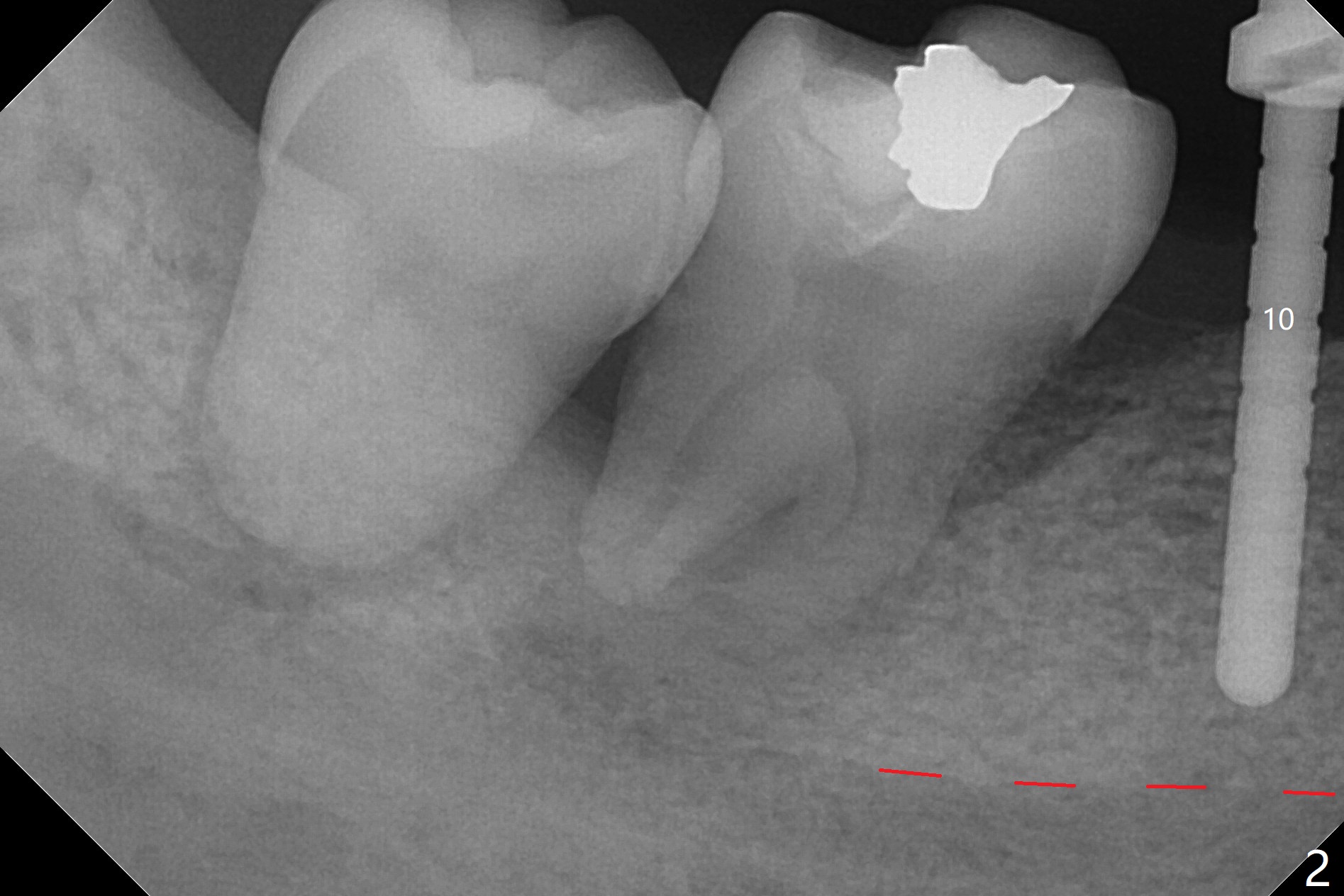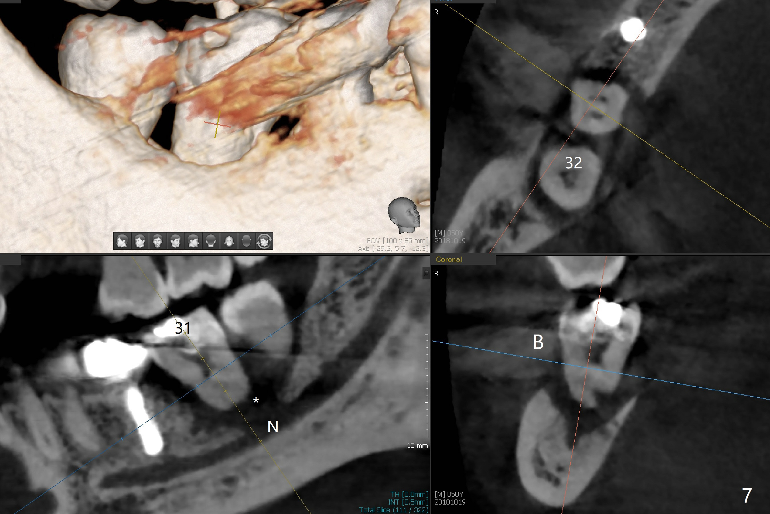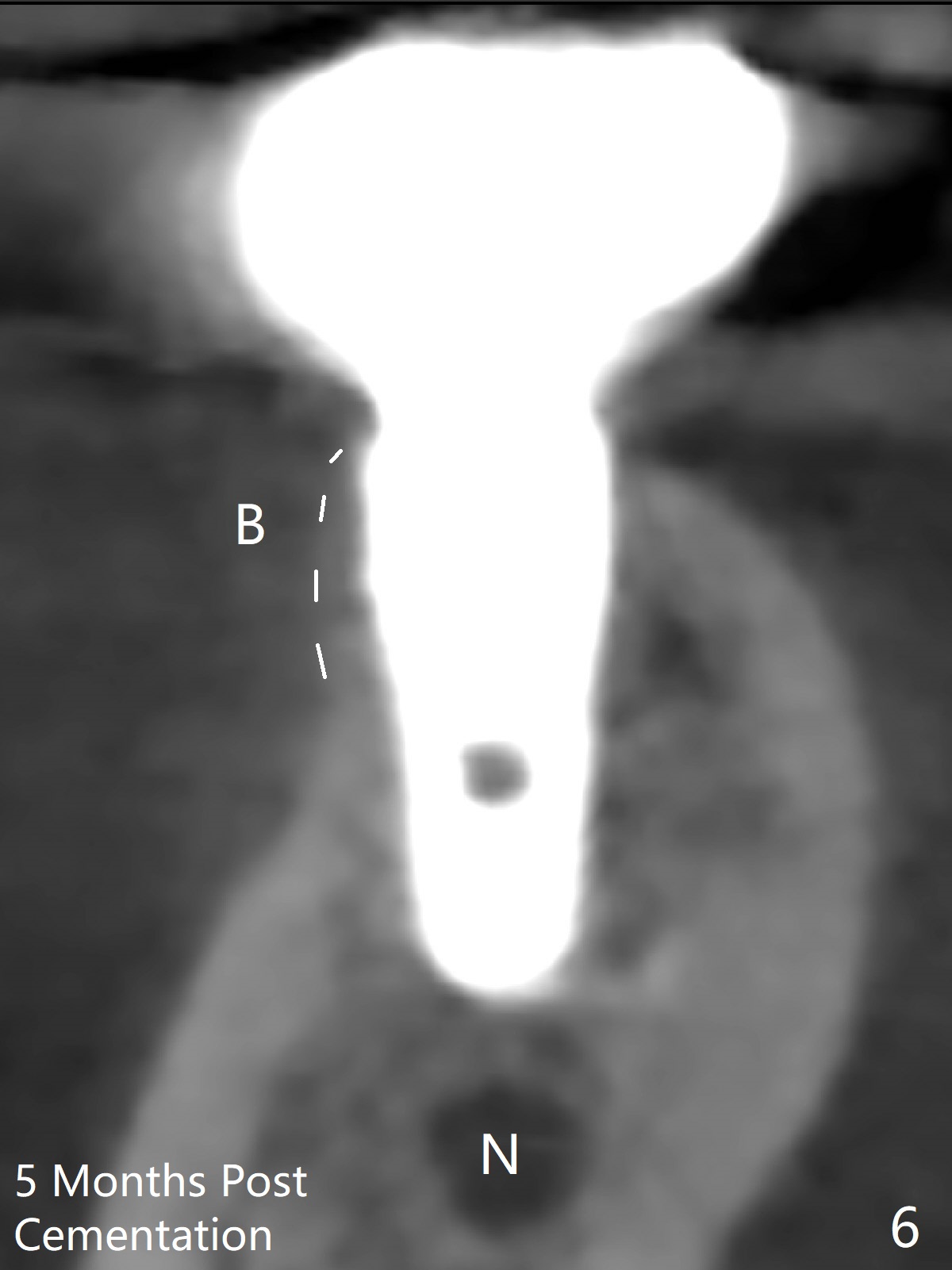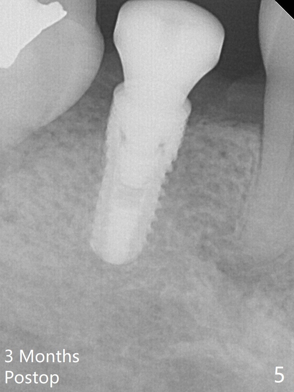 The ridge at #30 is not so narrow (Fig.1). Initial depth is 10 mm with 2 mm from the Inferior Alveolar Canal (Fig.2,3 red dashed line). A 4.5x10 mm implant is placed with > 50 Ncm; a 6.2x5(3) mm healing abutment placed (Fig.4). The implant is stable and seems to be ready for impression 3 months postop (Fig.5). CT taken 5 months post cementation shows that the implant could be placed more lingually (Fig.6 (coronal section; B: buccal)). Periradicular radiolucency at #31 (Fig.7 *) is continuous with the Inferior Alveolar neurovascular bundle (N). After extraction, care should be taken to remove granulation tissue. The tooth #32 will be extracted simultaneously because of severe bone loss.