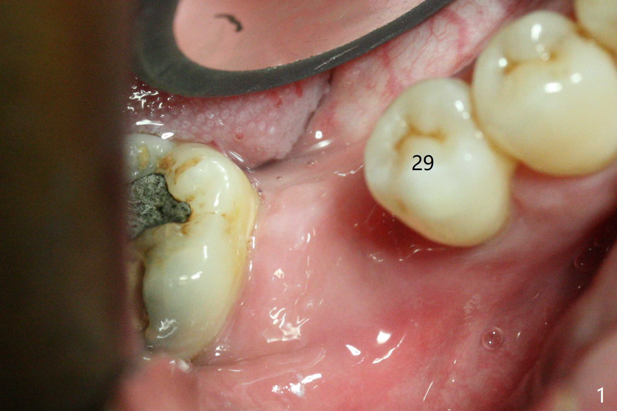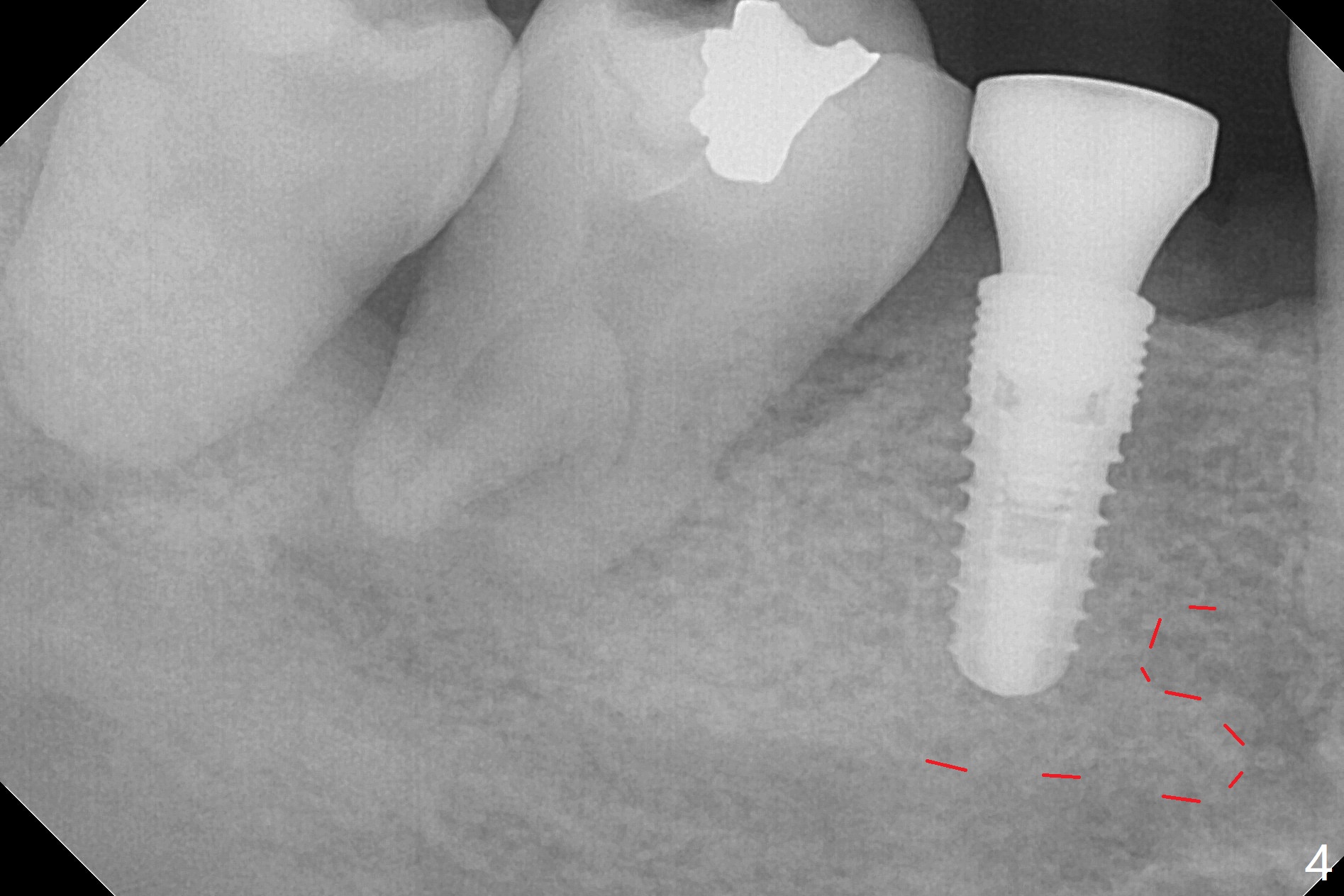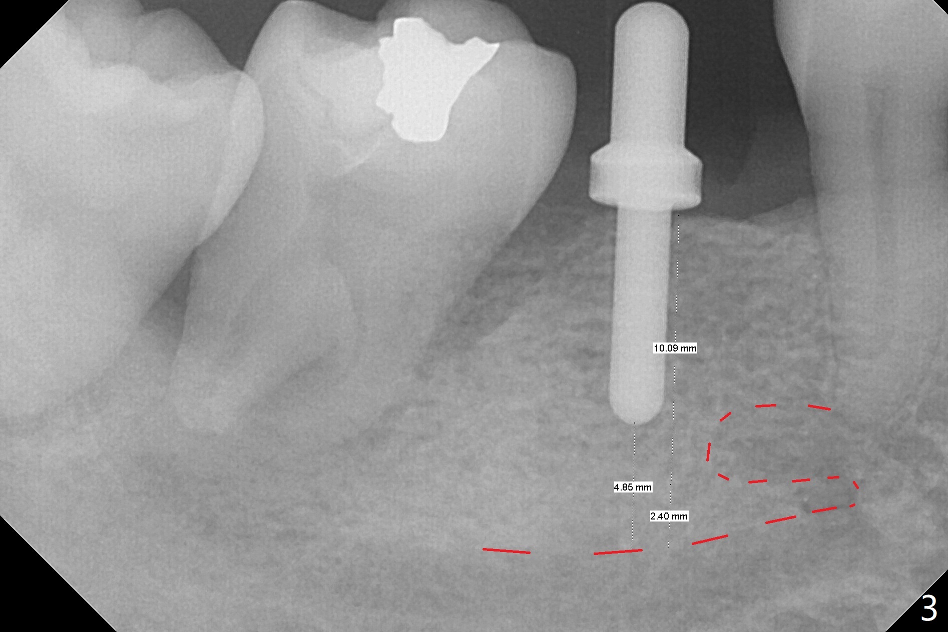 The ridge at #30 is not so narrow (Fig.1). Initial depth is 10 mm with 2 mm from the Inferior Alveolar Canal (Fig.2,3 red dashed line). A 4.5x10 mm implant is placed with > 50 Ncm; a 6.2x5(3) mm healing abutment placed (Fig.4). The implant is stable and seems to be ready for impression 3 months postop (Fig.5). CT taken 5 months post cementation shows that the implant could be placed more lingually (Fig.6 (coronal section; B: buccal)). Periradicular radiolucency at #31 (Fig.7 *) is continuous with the Inferior Alveolar neurovascular bundle (N). After extraction, care should be taken to remove granulation tissue. The tooth #32 will be extracted simultaneously because of severe bone loss.