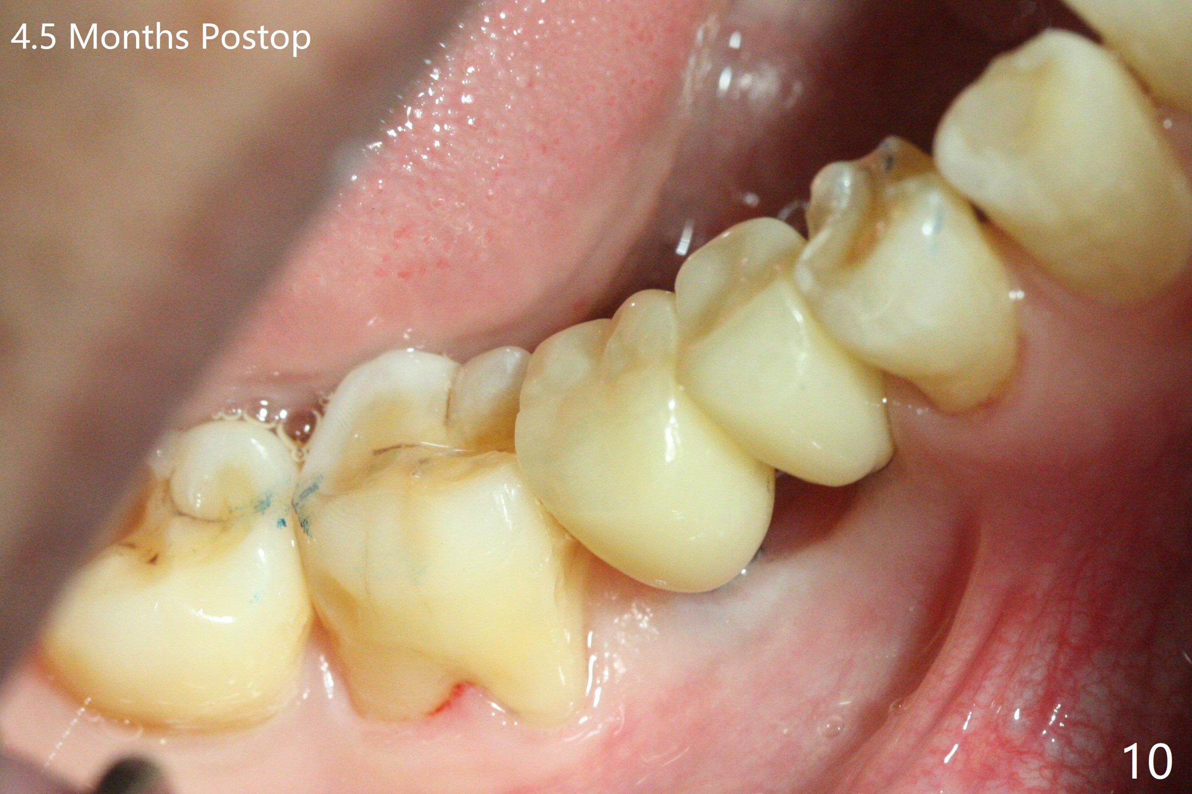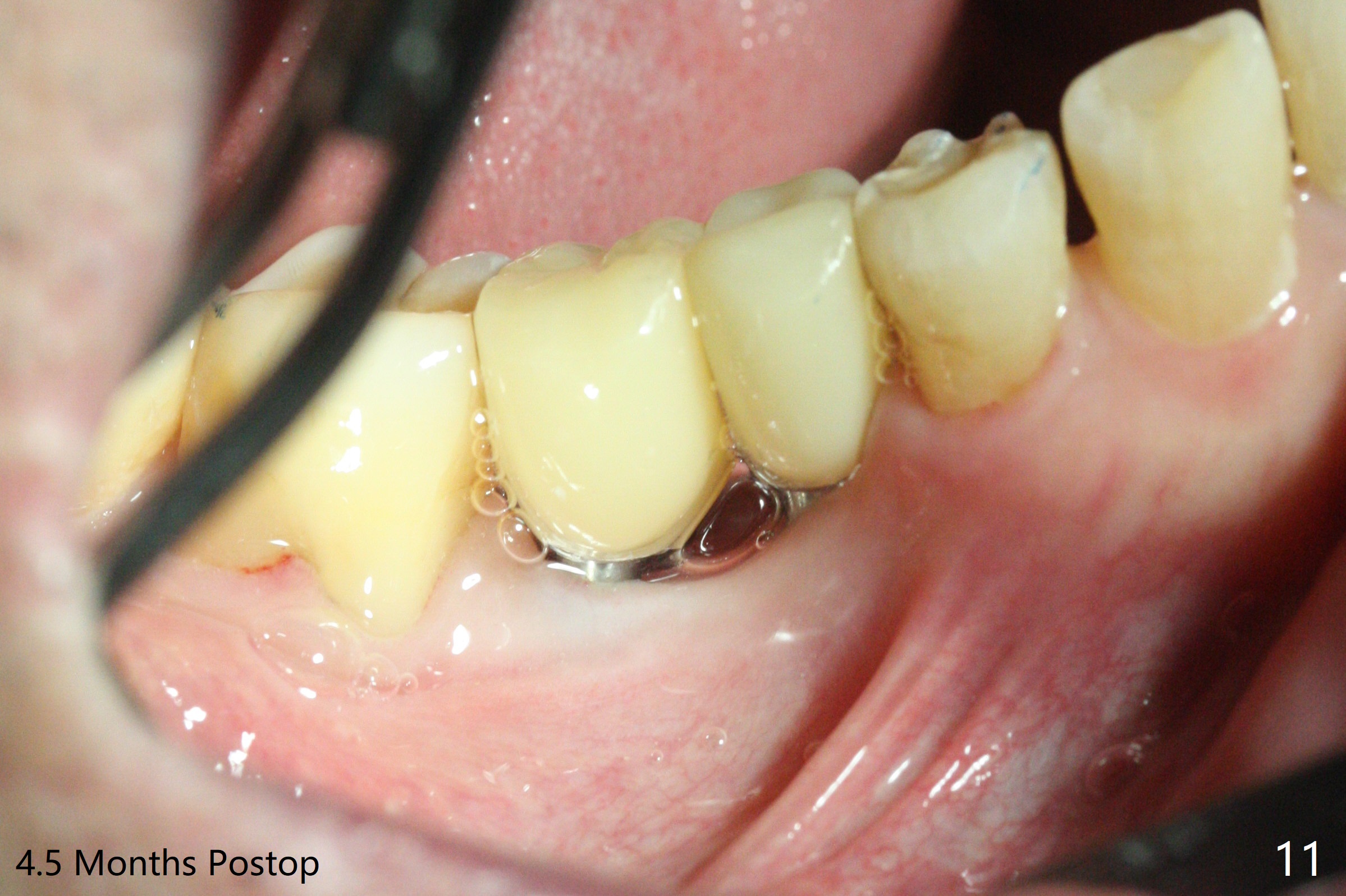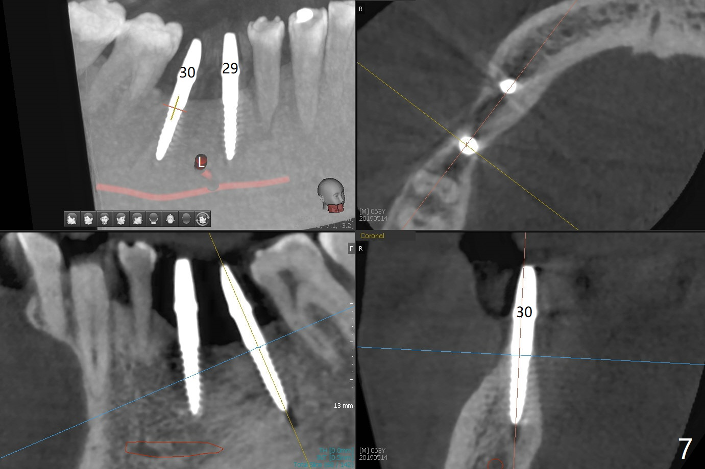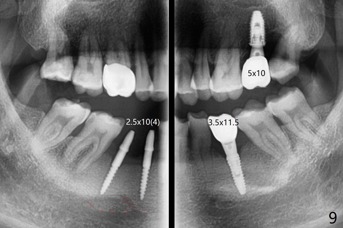 After initial osteotomy using 2.2 mm drill for 10 and 11.5 mm at #29 and 30, respectively, the guide is removed for re-insertion of drills and PA (Fig.1). The osteotomy at #29 is found lingually and in the nonkeratinized gingiva with mild laceration (wish incision to be made before osteotomy); the osteotomy is established a little lingual at #29 (Fig.2) and more or less in the middle of the narrow ridge and #30 (Fig.3). Lindamann bur is used to move #29 osteotomy buccally. A 1.5 mm drill is used to increase the depth free hand before placement of 2.5x10(4) mm 1-piece implants (Fig.4). After adjustment of the implant depth (Fig.5), CT is retaken, which shows proper implant placement (Fig.6,7). Probably due to good oral hygiene, the gingiva around the implants appears to be keratinized 4 months postop (Fig.8). After abutment preparation for margin and parallelism, impression is taken (Fig.9). When the permanent crowns are temporarily cemented, the large gingival embrasure is noted (Fig.10,11). The latter could be reduced by modifying the provisional in the healing stage. In fact the crown at #29 dislodges 2 days post cementation because lingual (Fig.12) and distal (Fig.13) placement. A surgical stent should have been fabricated from RPD for free hand placement!
