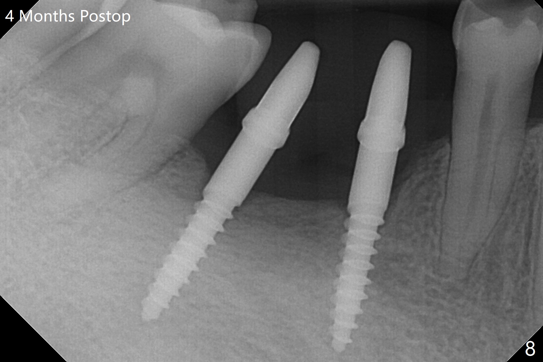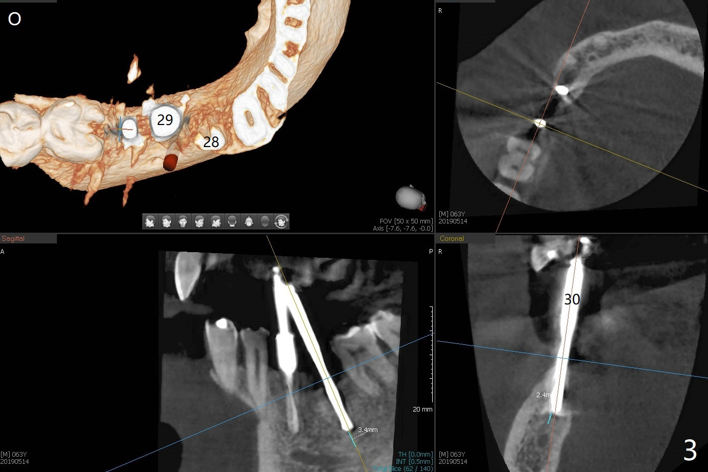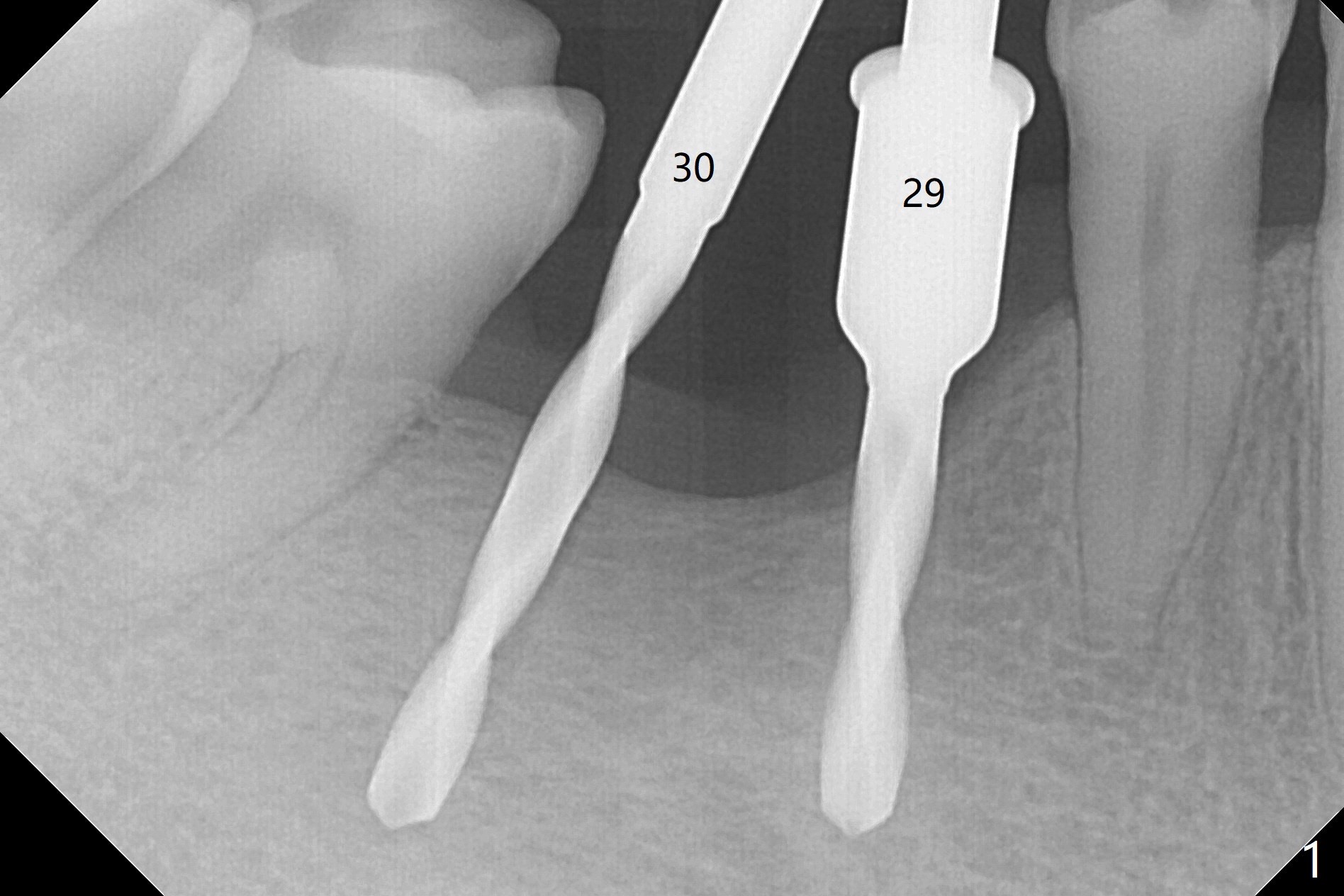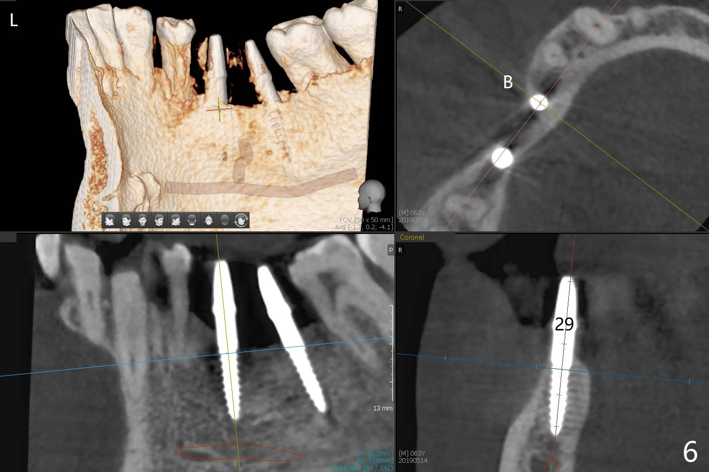 After initial osteotomy using 2.2 mm drill for 10 and 11.5 mm at #29 and 30, respectively, the guide is removed for re-insertion of drills and PA (Fig.1). The osteotomy at #29 is found lingually and in the nonkeratinized gingiva with mild laceration (wish incision to be made before osteotomy); the osteotomy is established a little lingual at #29 (Fig.2) and more or less in the middle of the narrow ridge and #30 (Fig.3). Lindamann bur is used to move #29 osteotomy buccally. A 1.5 mm drill is used to increase the depth free hand before placement of 2.5x10(4) mm 1-piece implants (Fig.4). After adjustment of the implant depth (Fig.5), CT is retaken, which shows proper implant placement (Fig.6,7). Probably due to good oral hygiene, the gingiva around the implants appears to be keratinized 4 months postop (Fig.8). After abutment preparation for margin and parallelism, impression is taken (Fig.9). When the permanent crowns are temporarily cemented, the large gingival embrasure is noted (Fig.10,11). The latter could be reduced by modifying the provisional in the healing stage. In fact the crown at #29 dislodges 2 days post cementation because lingual (Fig.12) and distal (Fig.13) placement. A surgical stent should have been fabricated from RPD for free hand placement!