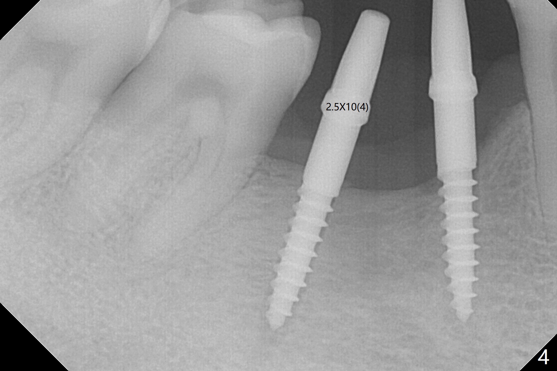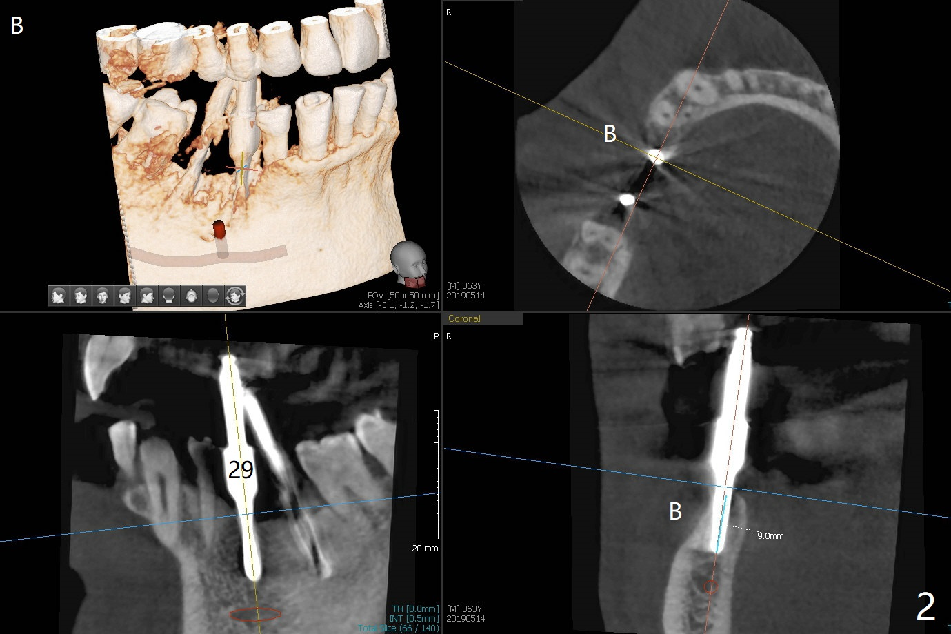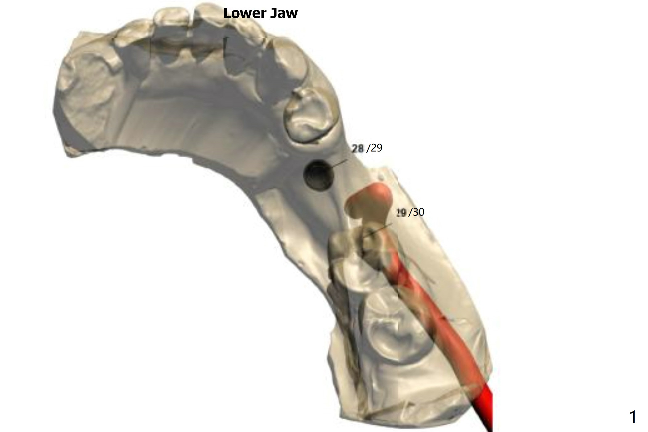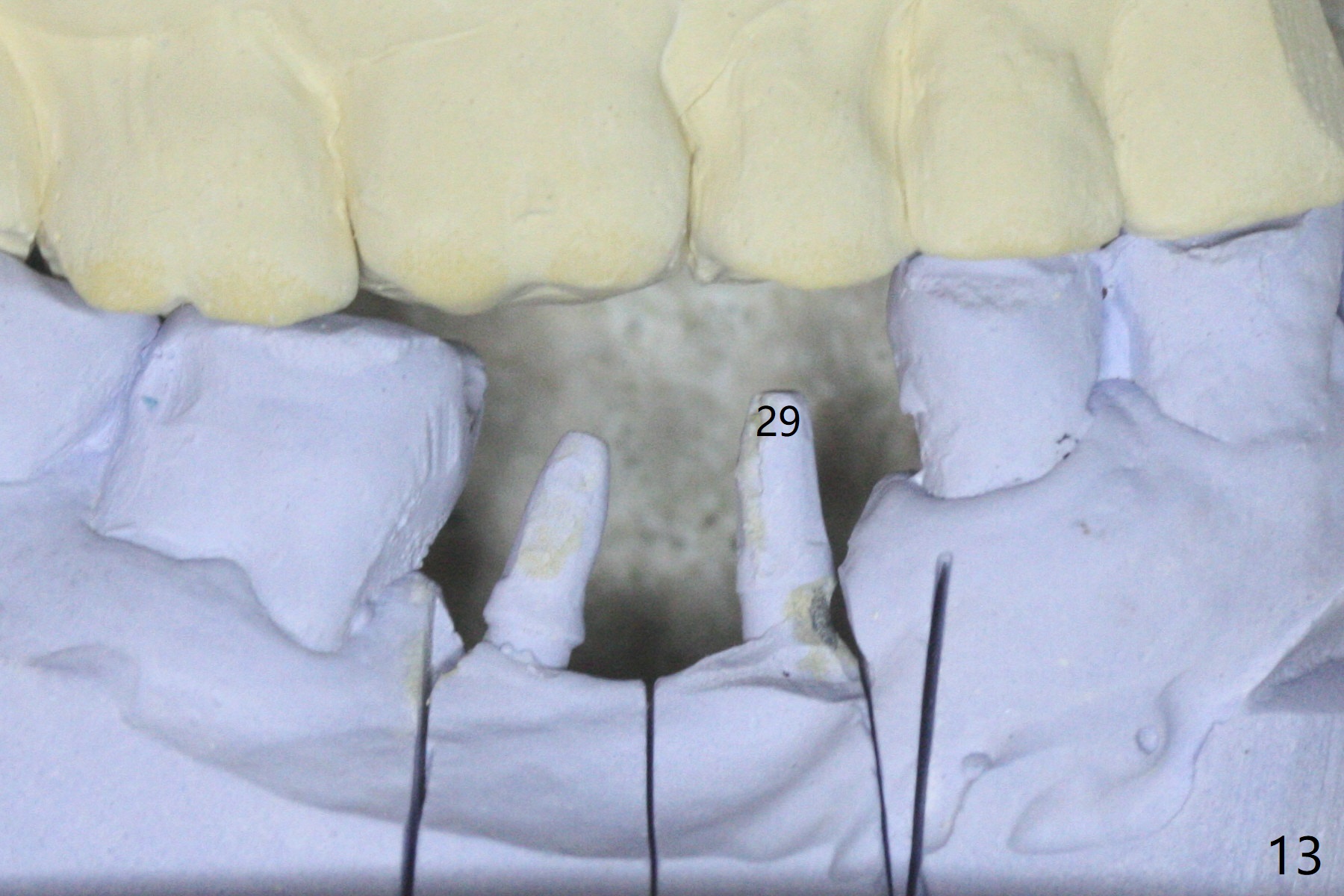 After initial osteotomy using 2.2 mm drill for 10 and 11.5 mm at #29 and 30, respectively, the guide is removed for re-insertion of drills and PA (Fig.1). The osteotomy at #29 is found lingually and in the nonkeratinized gingiva with mild laceration (wish incision to be made before osteotomy); the osteotomy is established a little lingual at #29 (Fig.2) and more or less in the middle of the narrow ridge and #30 (Fig.3). Lindamann bur is used to move #29 osteotomy buccally. A 1.5 mm drill is used to increase the depth free hand before placement of 2.5x10(4) mm 1-piece implants (Fig.4). After adjustment of the implant depth (Fig.5), CT is retaken, which shows proper implant placement (Fig.6,7). Probably due to good oral hygiene, the gingiva around the implants appears to be keratinized 4 months postop (Fig.8). After abutment preparation for margin and parallelism, impression is taken (Fig.9). When the permanent crowns are temporarily cemented, the large gingival embrasure is noted (Fig.10,11). The latter could be reduced by modifying the provisional in the healing stage. In fact the crown at #29 dislodges 2 days post cementation because lingual (Fig.12) and distal (Fig.13) placement. A surgical stent should have been fabricated from RPD for free hand placement!