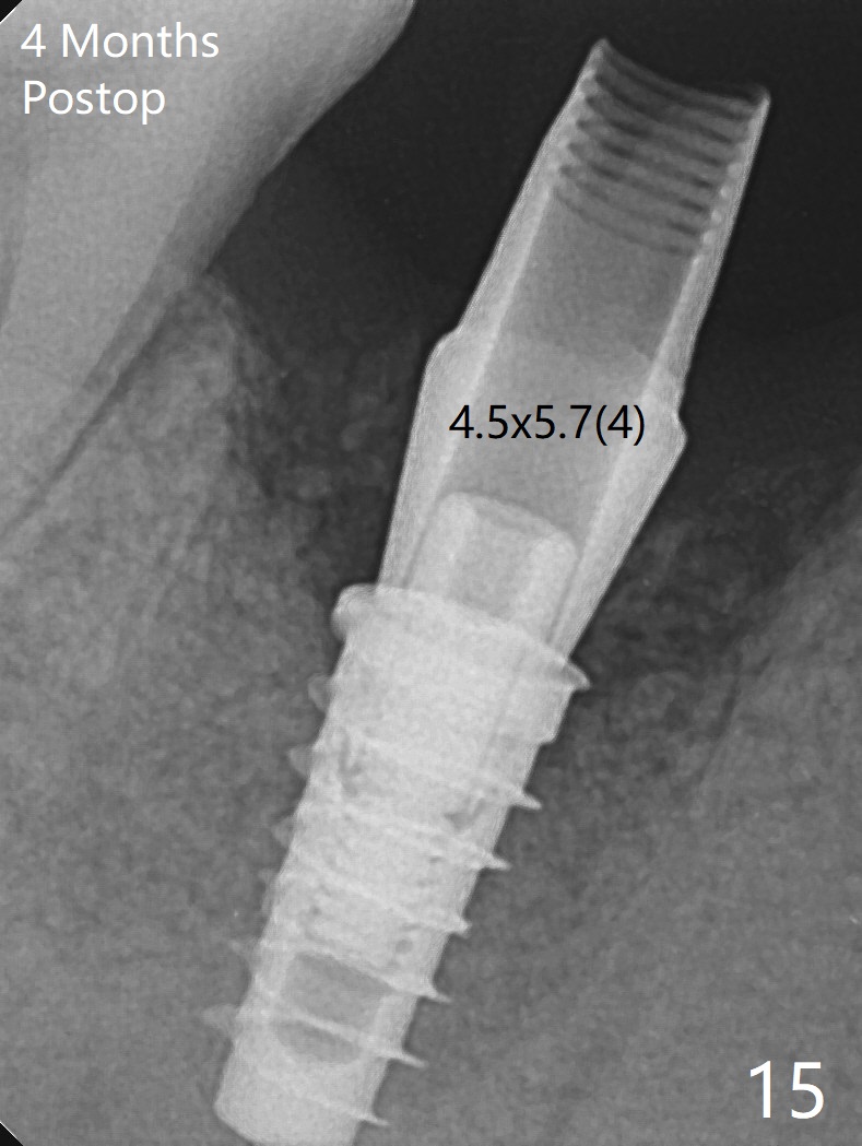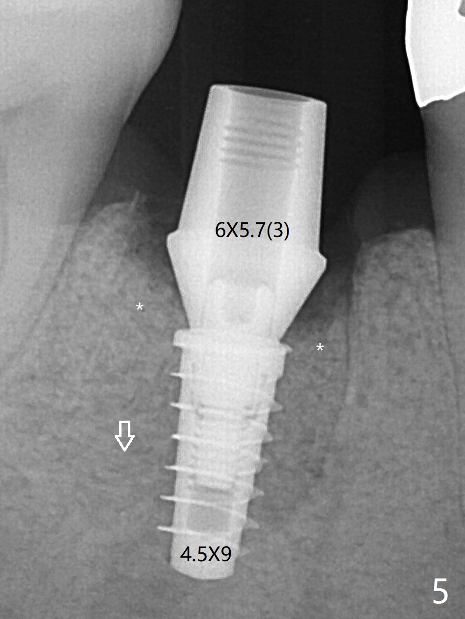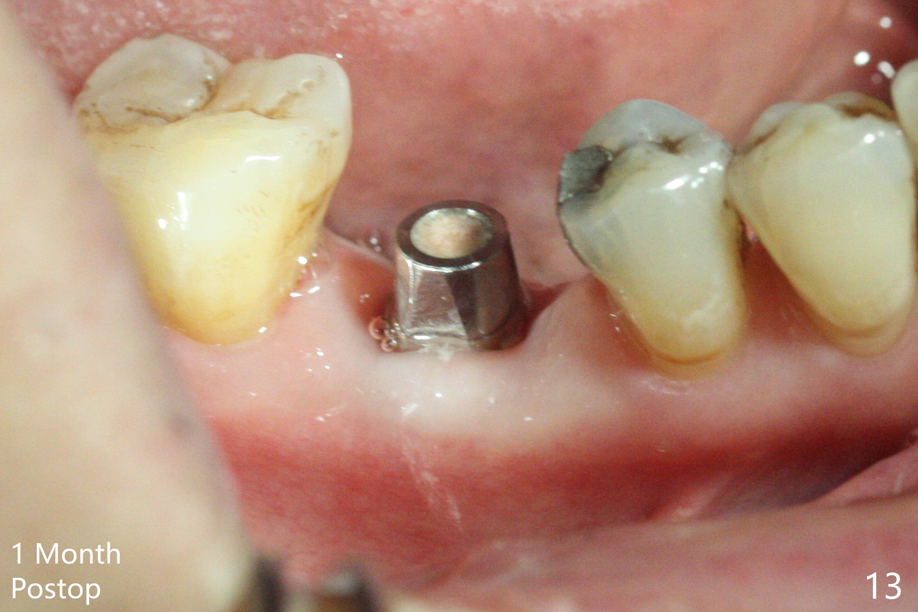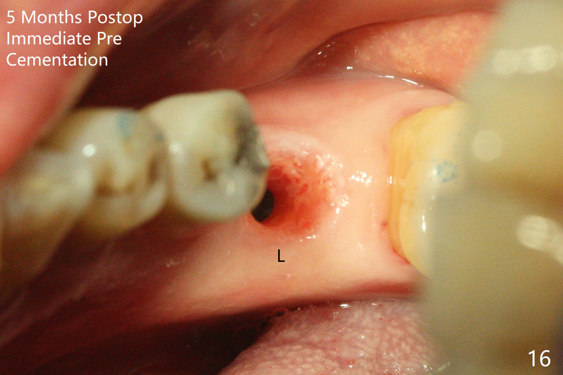 As planned, the crown of the tooth #30 with lingual (Fig.1 L) caries is removed and flattened with surgical handpiece so that the guide is able to be seated without interference. The osteotomy by 10.5 mm offset bone trimmer is lingual (Fig.2 white circle; due to in part the lingual caries and in part design error); in order to let the osteotomy to bounce back buccal, the part of the buccal roots are removed by surgical bur (arrows). The initial osteotomy by 2.2 mm drill is in the middle of the septum (Fig.3). After the last drill (3.5x11.5), the remaining roots are easily removed with proximators; a 4x11 mm dummy implant is placed with low stability and supracrestal lingual (Fig.4). Therefore a 4.5x9 mm final implant is placed with low torque. Following 4x11.5 mm drill, the torque increases to 20 Ncm. With insertion of healing screw, sticky bone (Fig.4 *: .5-1 mm cortical/cancellous allograft) is heavily packed around the implant (arrow), which apparently allows removal of the healing screw and placement of a 6x5.7(3) mm pair abutment without loosening the underlying implant. More bone graft is placed (Fig.6), followed by 2 pieces of PRF membranes. Although the implant is slightly buccally placed (Fig.7, due to over-removal of the buccal root, Fig.2 arrows), it is placed in the septum (Fig.8 S). To further compensate for the low implant stability, setting acrylic is applied in the edentulous area, particularly into the undercuts of the neighboring teeth (Fig.9 *) and around the abutment. The lingual margin of the acrylic dressing is extended (Fig.10 arrow) to cover the soft tissue defect associated with the lingual caries. As compared to the design (4x10 mm, Fig.11), the implant (4.5x9 mm, Fig.12) is placed buccal and ~ 2 mm deeper, reducing the chance of periimplantitis. The acrylic dressing is in place, but has mobility. The gingiva is healthy 2 weeks postop. The dressing is removed 1 month postop; the socket heals around the abutment buccal (Fig.13) and lingual (Fig.14). In spite of the immediate provisional, the abutment margin is substantially subgingival mesial 4 months postop, extremely difficult to take impression. A smaller diameter and longer cuff abutment is placed (Fig.15). The lingual gingiva heals normal 5 months postop, immediately before cementation (Fig.16).