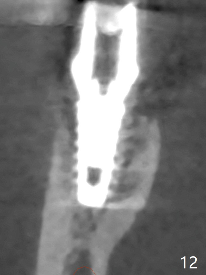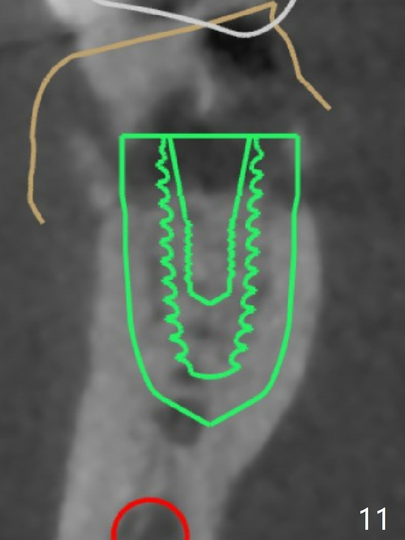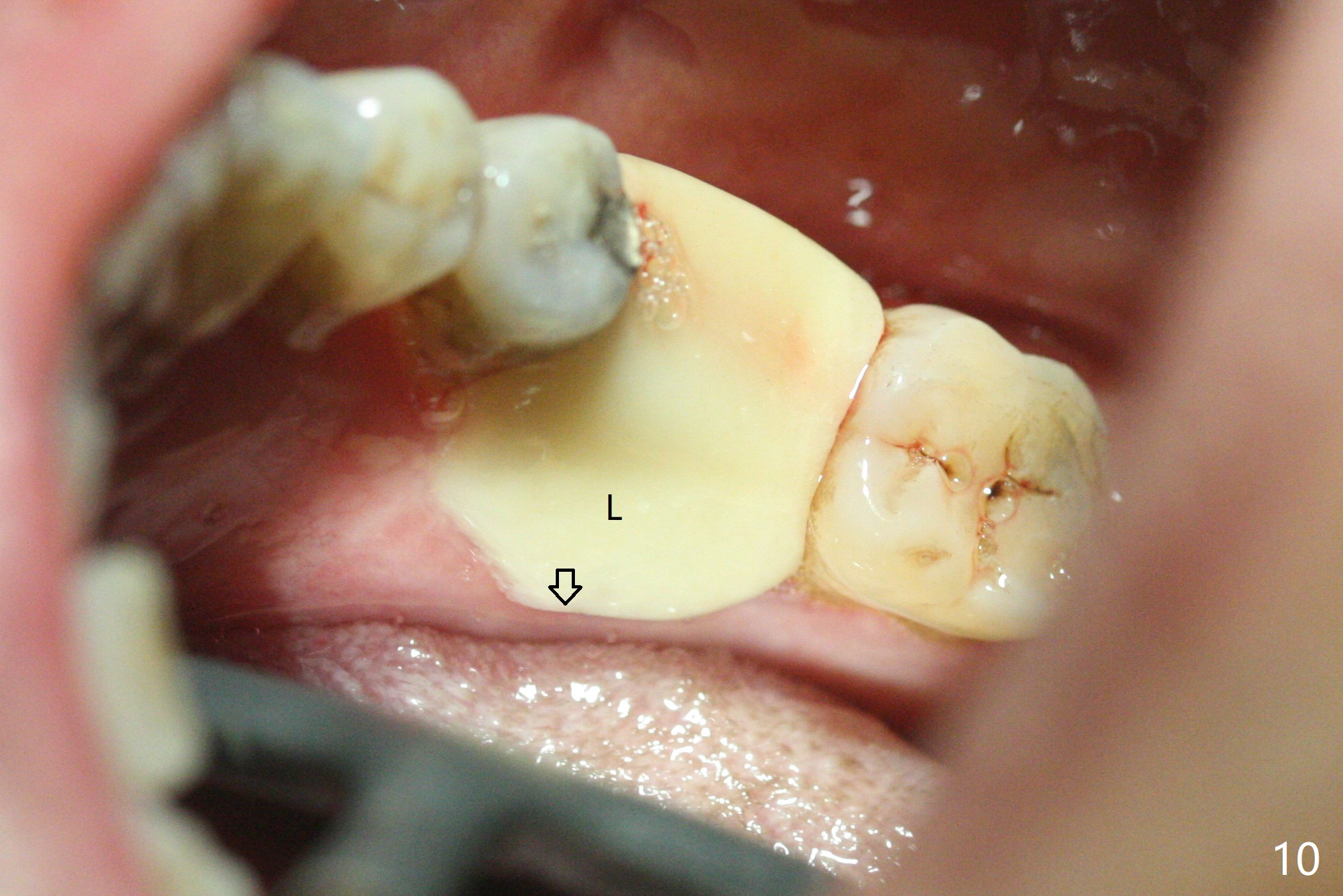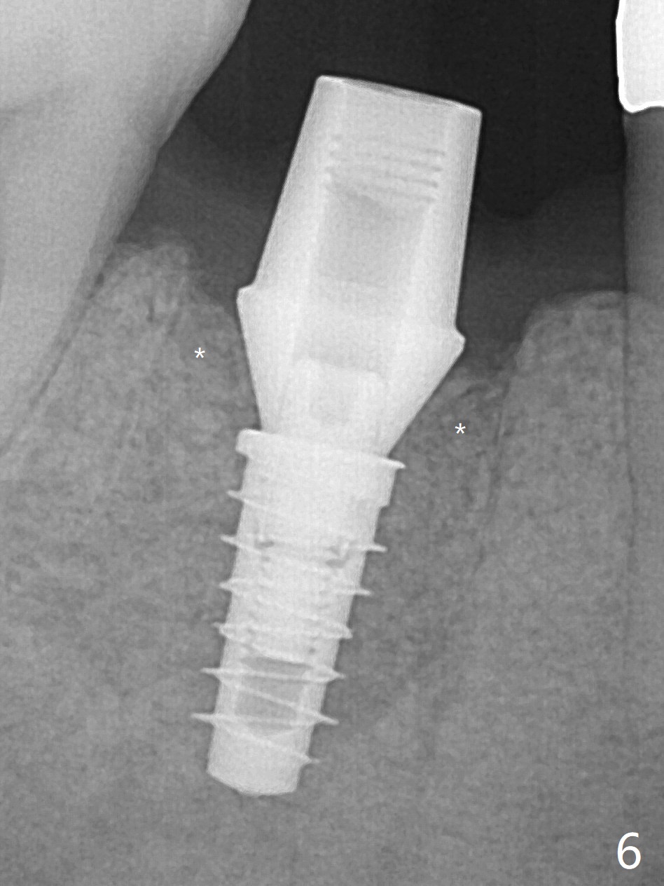As planned, the crown of the tooth #30 with lingual (Fig.1 L) caries is removed and flattened with surgical handpiece so that the guide is able to be seated without interference. The osteotomy by 10.5 mm offset bone trimmer is lingual (Fig.2 white circle; due to in part the lingual caries and in part design error); in order to let the osteotomy to bounce back buccal, the part of the buccal roots are removed by surgical bur (arrows). The initial osteotomy by 2.2 mm drill is in the middle of the septum (Fig.3). After the last drill (3.5x11.5), the remaining roots are easily removed with proximators; a 4x11 mm dummy implant is placed with low stability and supracrestal lingual (Fig.4). Therefore a 4.5x9 mm final implant is placed with low torque. Following 4x11.5 mm drill, the torque increases to 20 Ncm. With insertion of healing screw, sticky bone (Fig.4 *: .5-1 mm cortical/cancellous allograft) is heavily packed around the implant (arrow), which apparently allows removal of the healing screw and placement of a 6x5.7(3) mm pair abutment without loosening the underlying implant. More bone graft is placed (Fig.6), followed by 2 pieces of PRF membranes. Although the implant is slightly buccally placed (Fig.7, due to over-removal of the buccal root, Fig.2 arrows), it is placed in the septum (Fig.8 S). To further compensate for the low implant stability, setting acrylic is applied in the edentulous area, particularly into the undercuts of the neighboring teeth (Fig.9 *) and around the abutment. The lingual margin of the acrylic dressing is extended (Fig.10 arrow) to cover the soft tissue defect associated with the lingual caries. As compared to the design (4x10 mm, Fig.11), the implant (4.5x9 mm, Fig.12) is placed buccal and ~ 2 mm deeper, reducing the chance of periimplantitis. The acrylic dressing is in place, but has mobility. The gingiva is healthy 2 weeks postop. The dressing is removed 1 month postop; the socket heals around the abutment buccal (Fig.13) and lingual (Fig.14). In spite of the immediate provisional, the abutment margin is substantially subgingival mesial 4 months postop, extremely difficult to take impression. A smaller diameter and longer cuff abutment is placed (Fig.15). The lingual gingiva heals normal 5 months postop, immediately before cementation (Fig.16).
